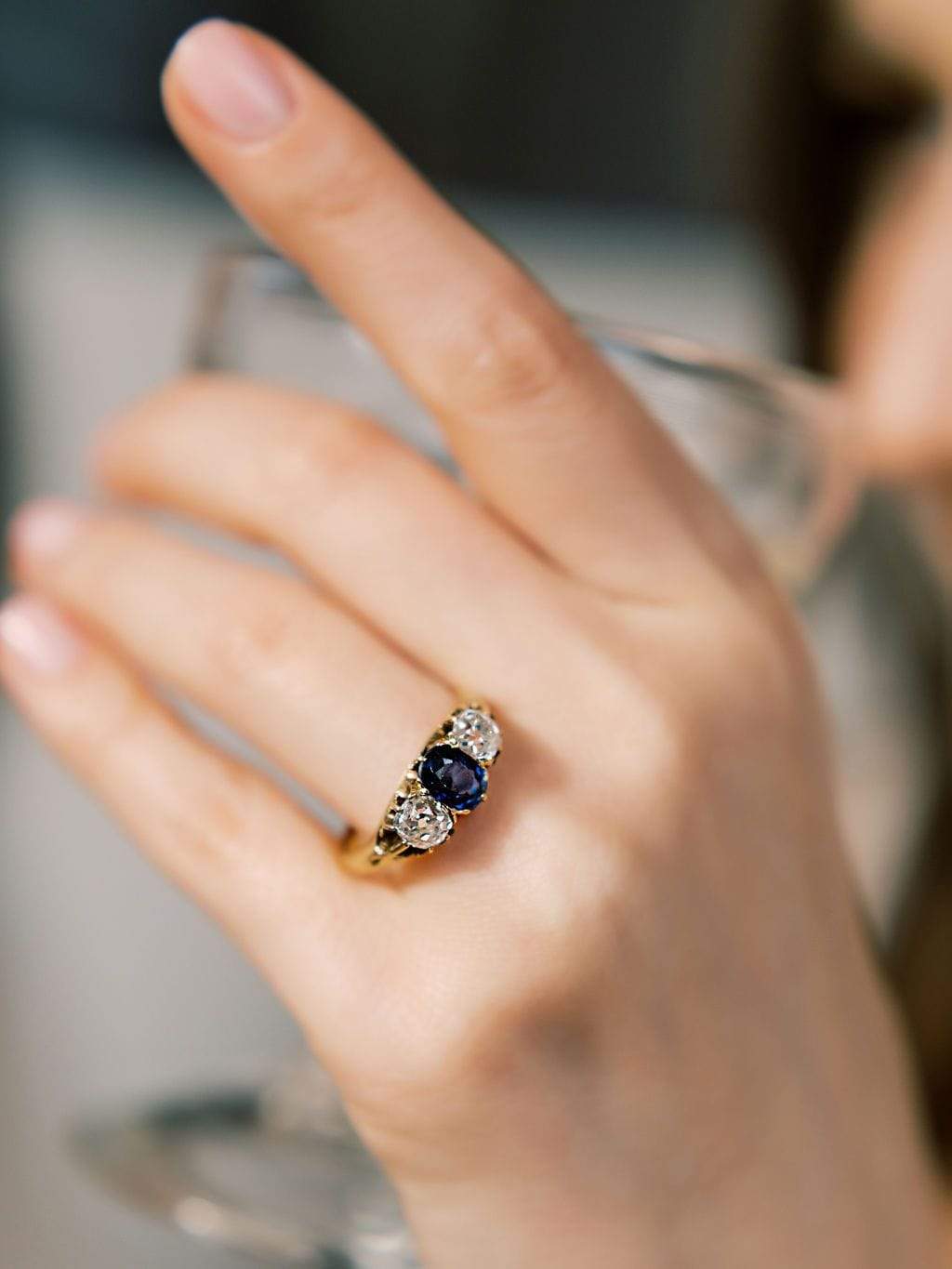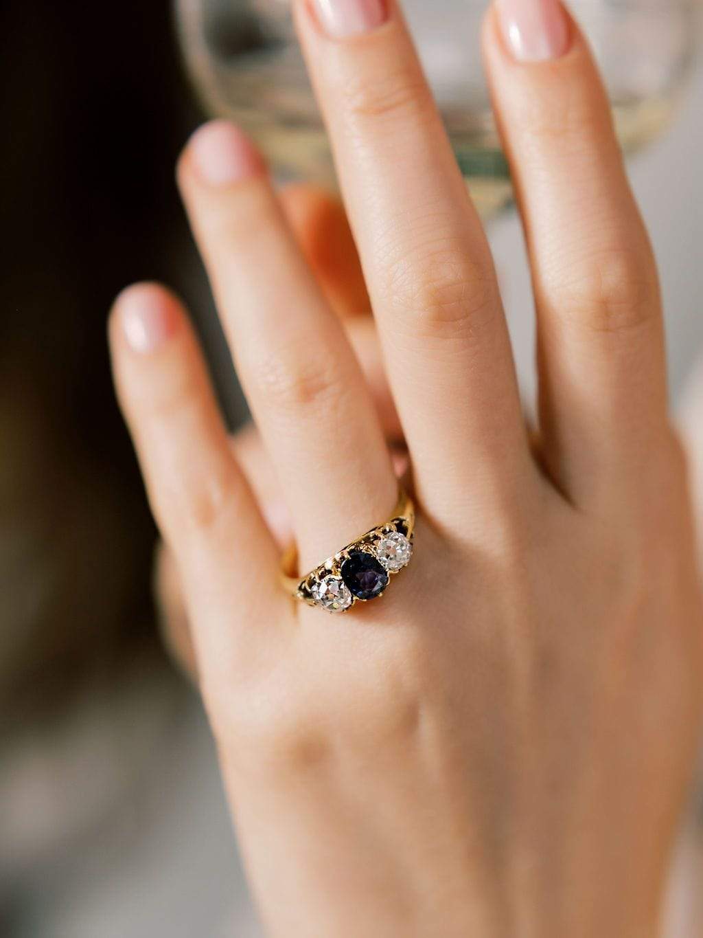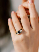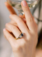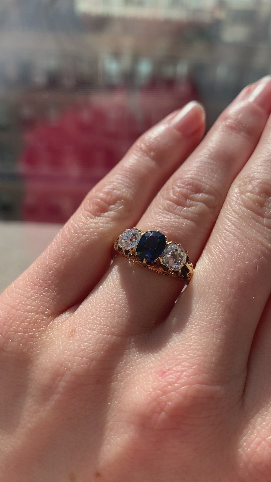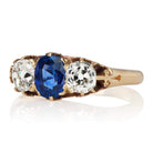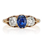 The Vixen ring is a vintage sapphire diamond engagement ring from the early Edwardian era circa 1900. The ring centers a GIA-certified Oval-cut no-heat Madagascar sapphire. The stone is set in an 18kt yellow gold setting. An old mine cut diamond is set to each side of the sapphire, each approximately 0.75 carats of I-J color, SI clarity. The ring is currently size 9.75 and can be resized!