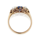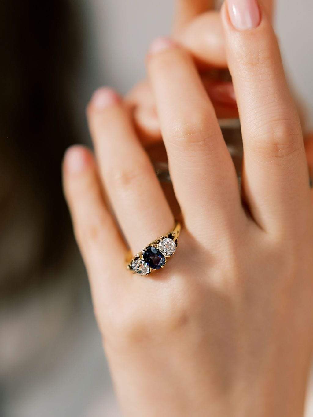 This ring is an antique dream centering a vibrant sapphire with gorgeous white old mine cuts flanking each side. The stones are set in beautiful styles Fleur-de-lis prongs.