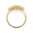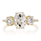 The Marielle 1.20 ring is a vintage-inspired VB-made diamond engagement ring. The ring centers a GIA certified 1.20-carat Oval cut diamond of E color, VS2 clarity. The stone is set in an 18-karat yellow gold setting. An old European cut diamond is set to each side of the center stone and both combine for 0.61 carats. The ring is currently size 5.75 and can be resized!