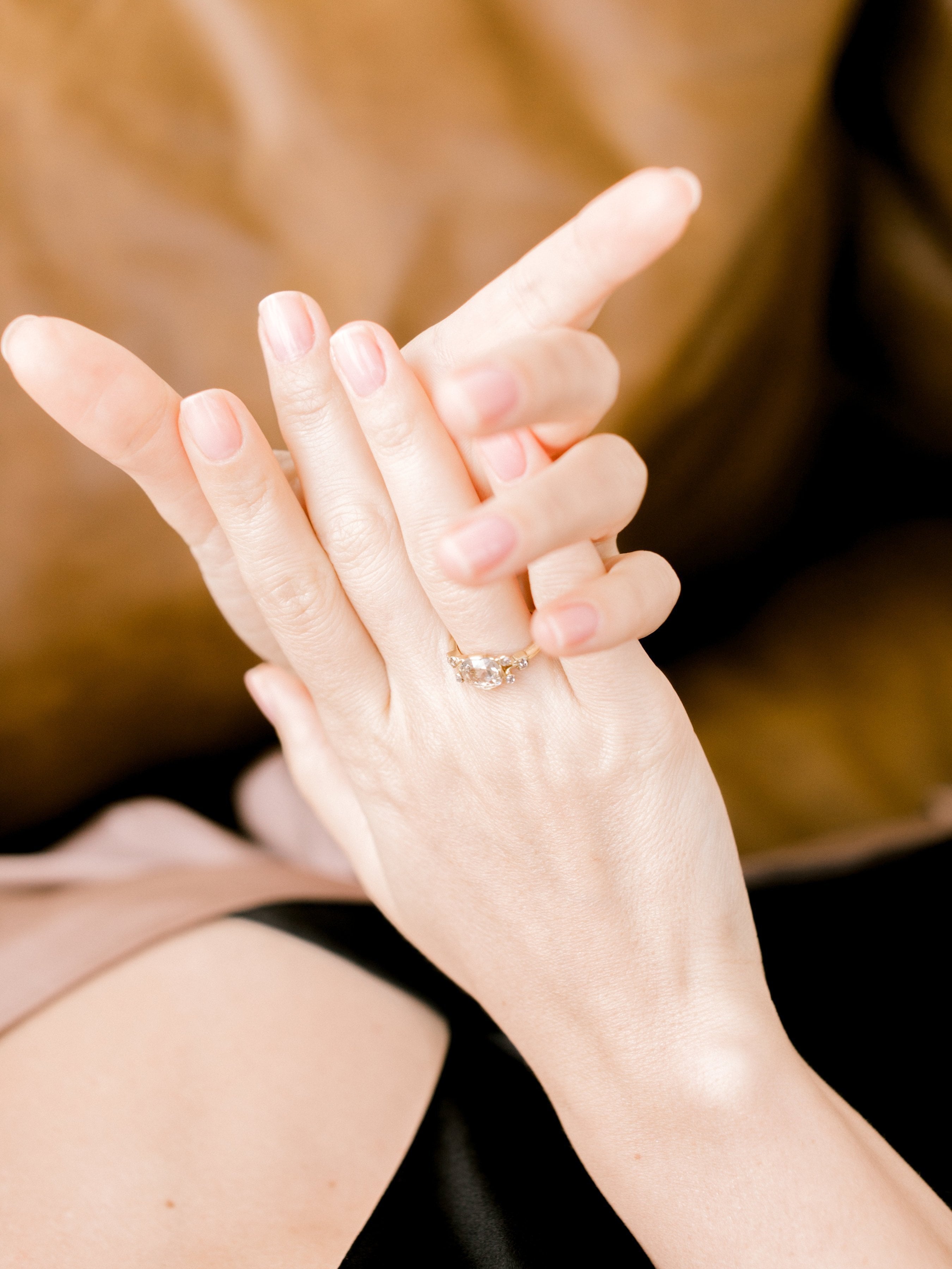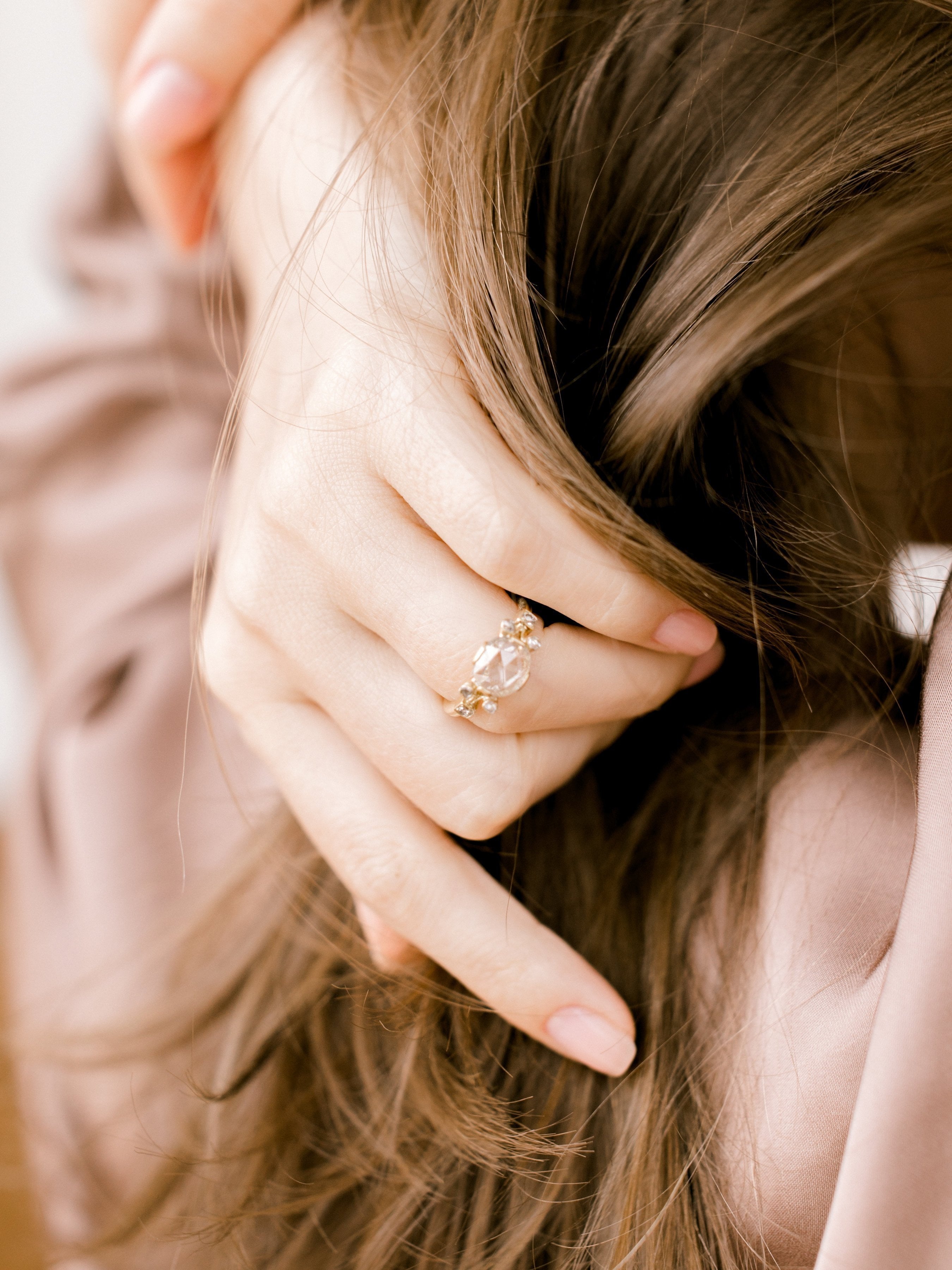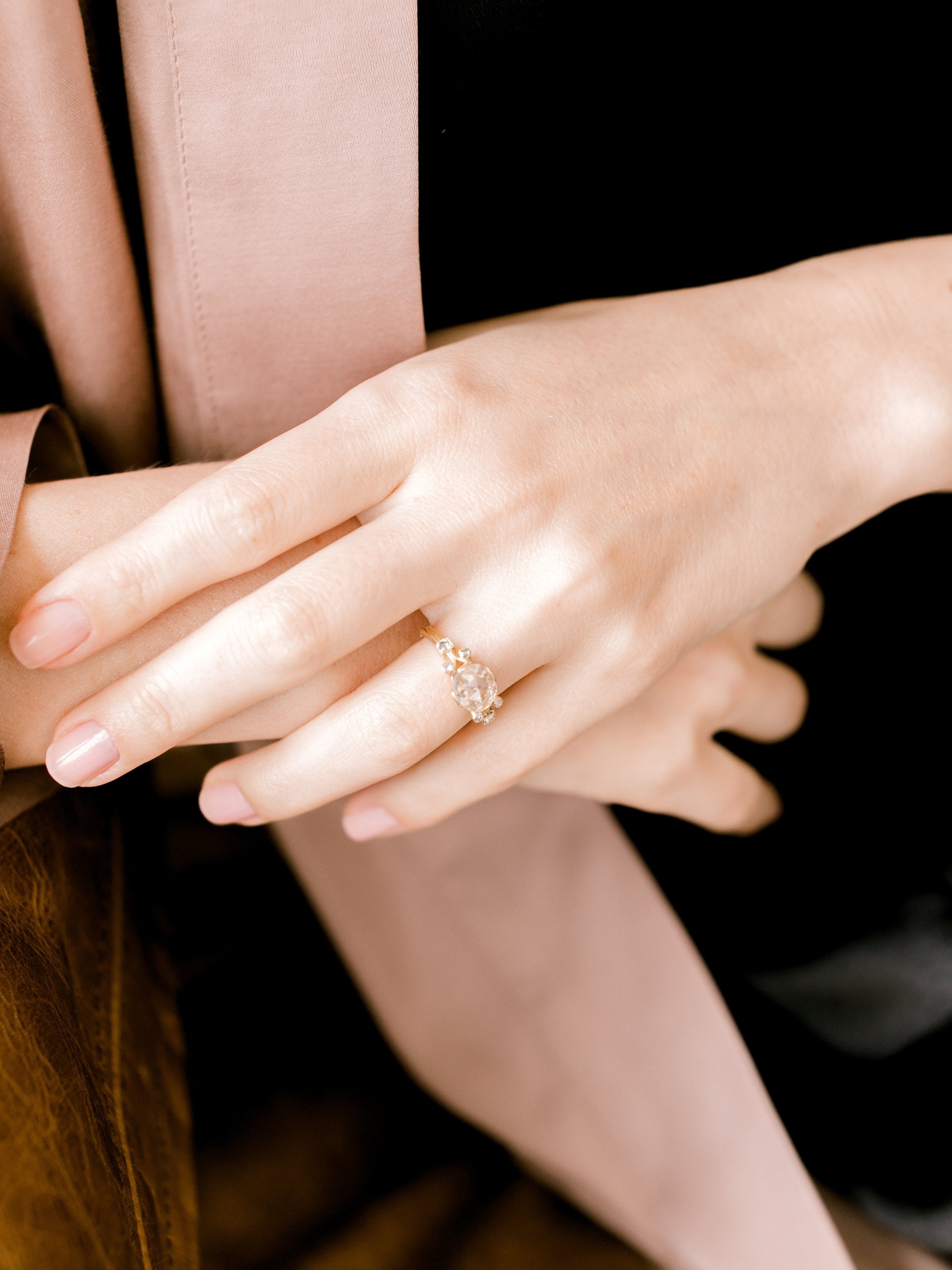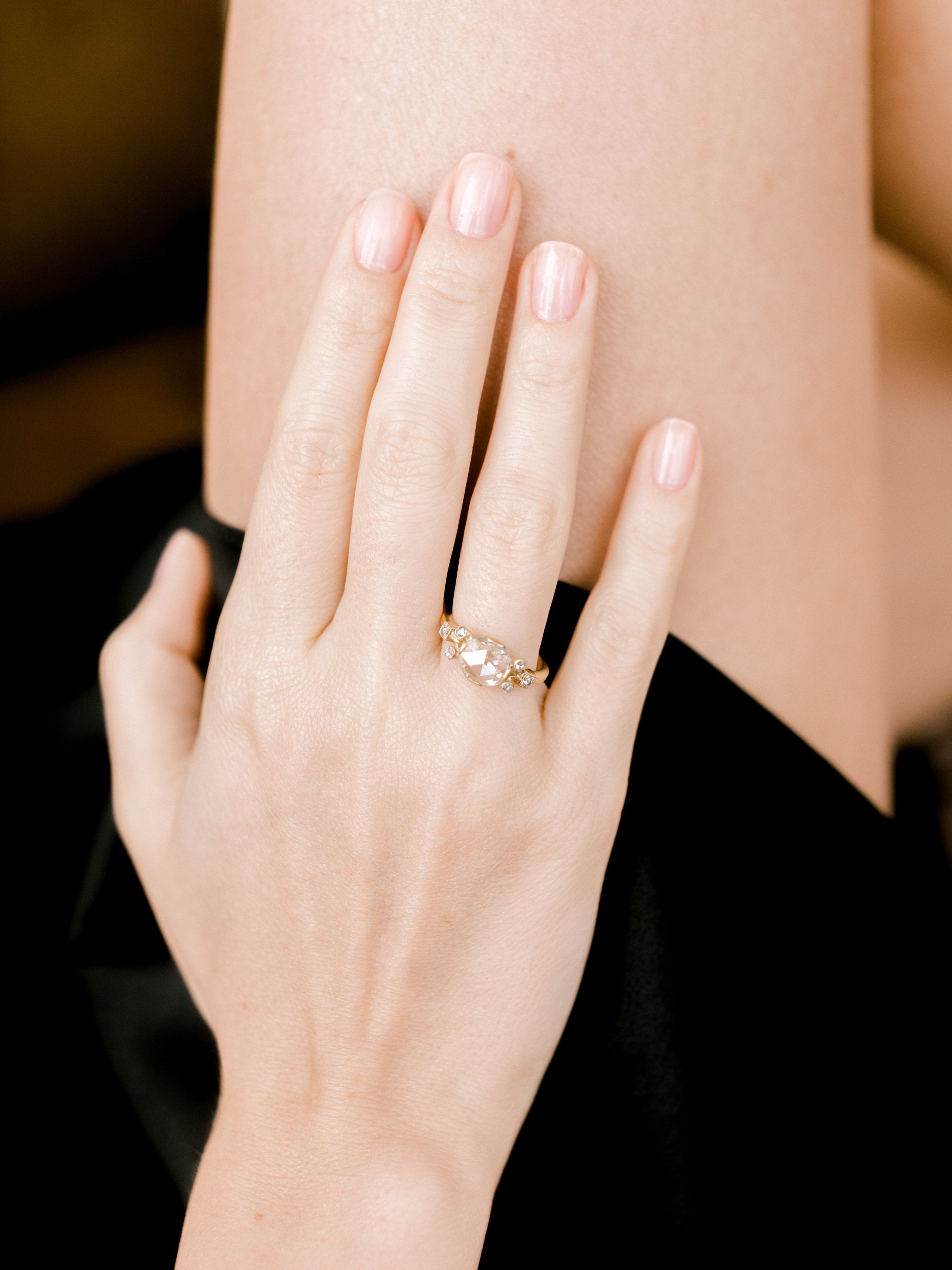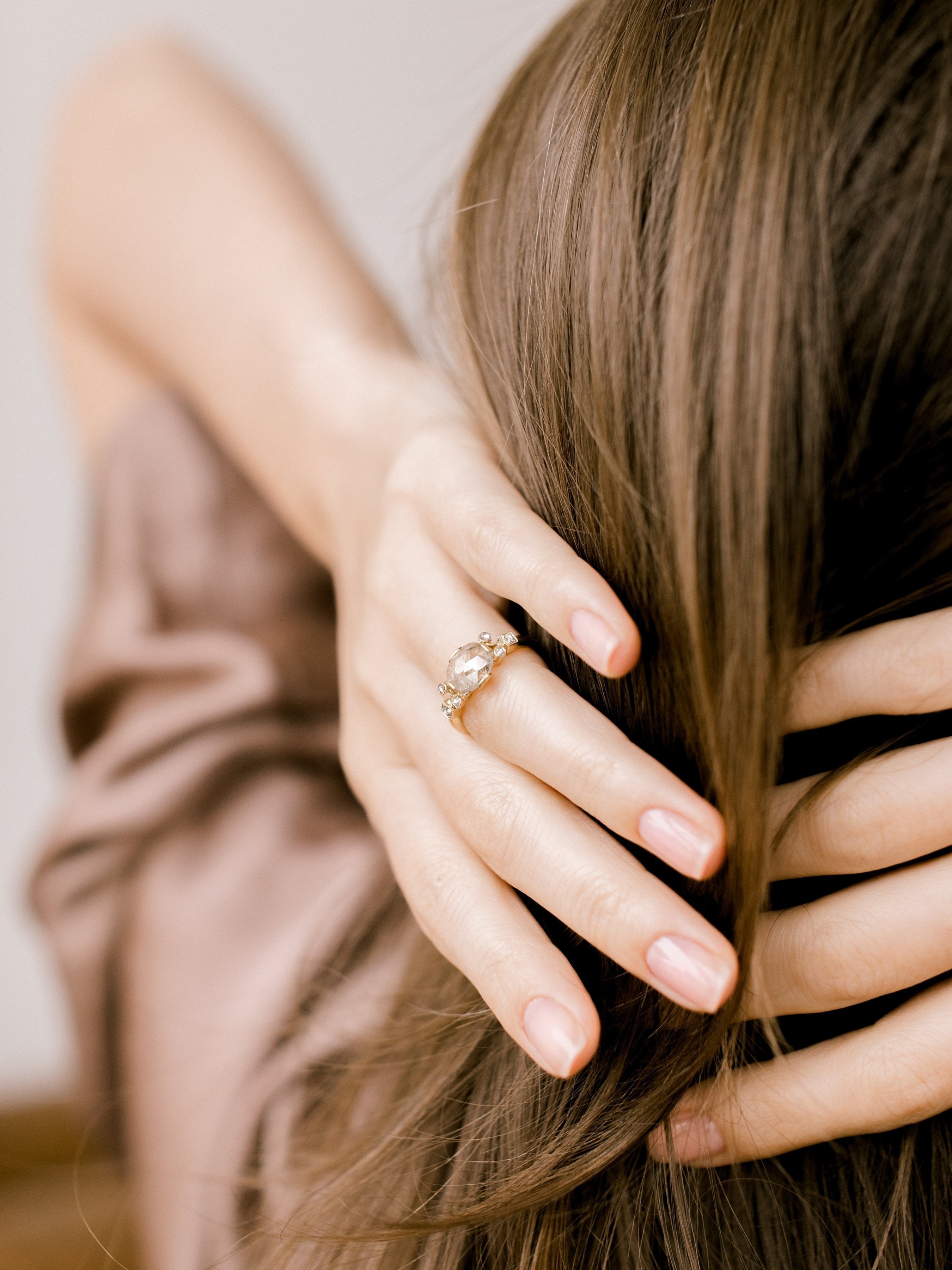 A gorgeous and utterly unique ring! The east-west set rose cut diamonds spreads the finger beautifully and the shoulders are very organic and flowing!
