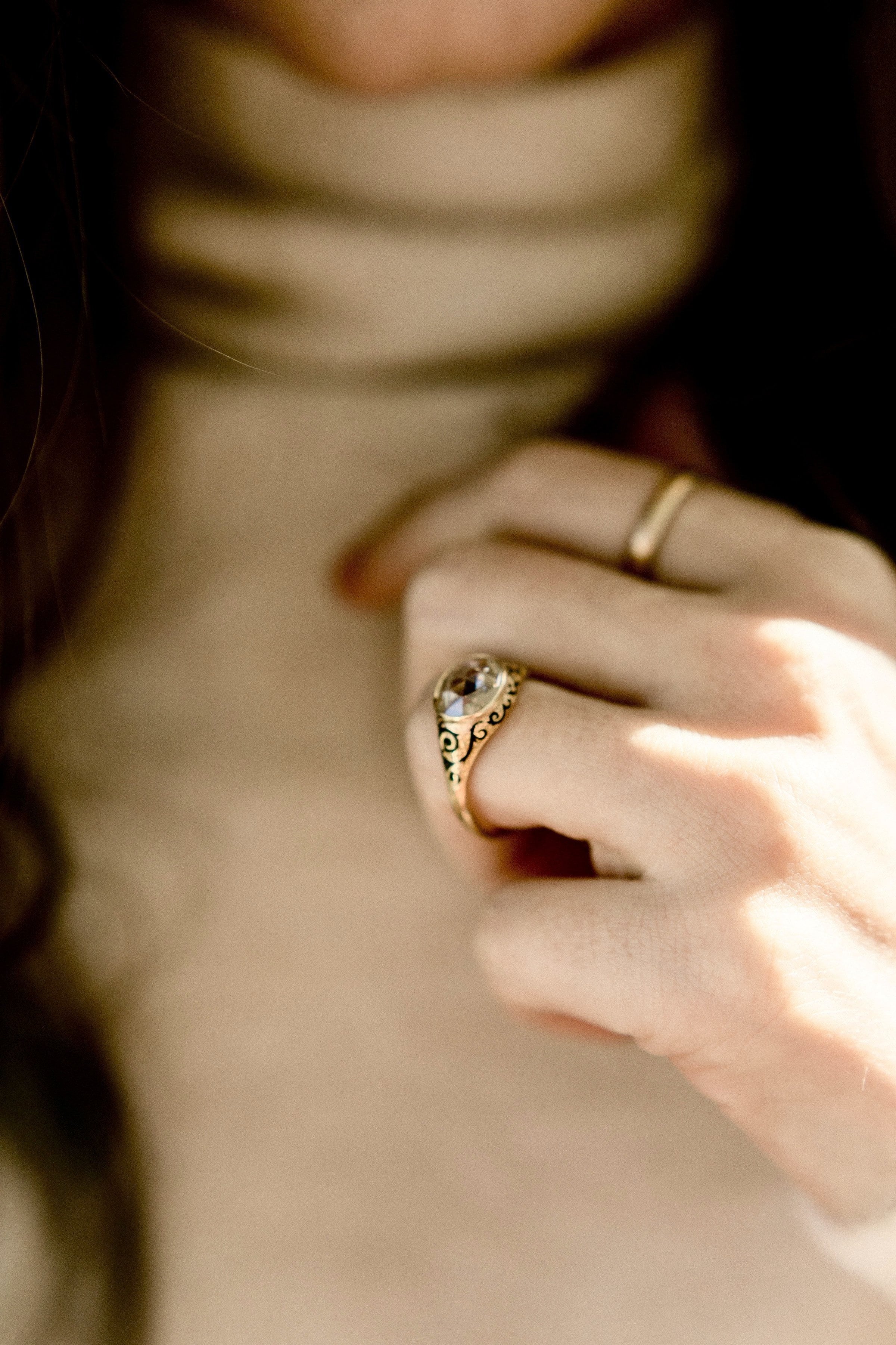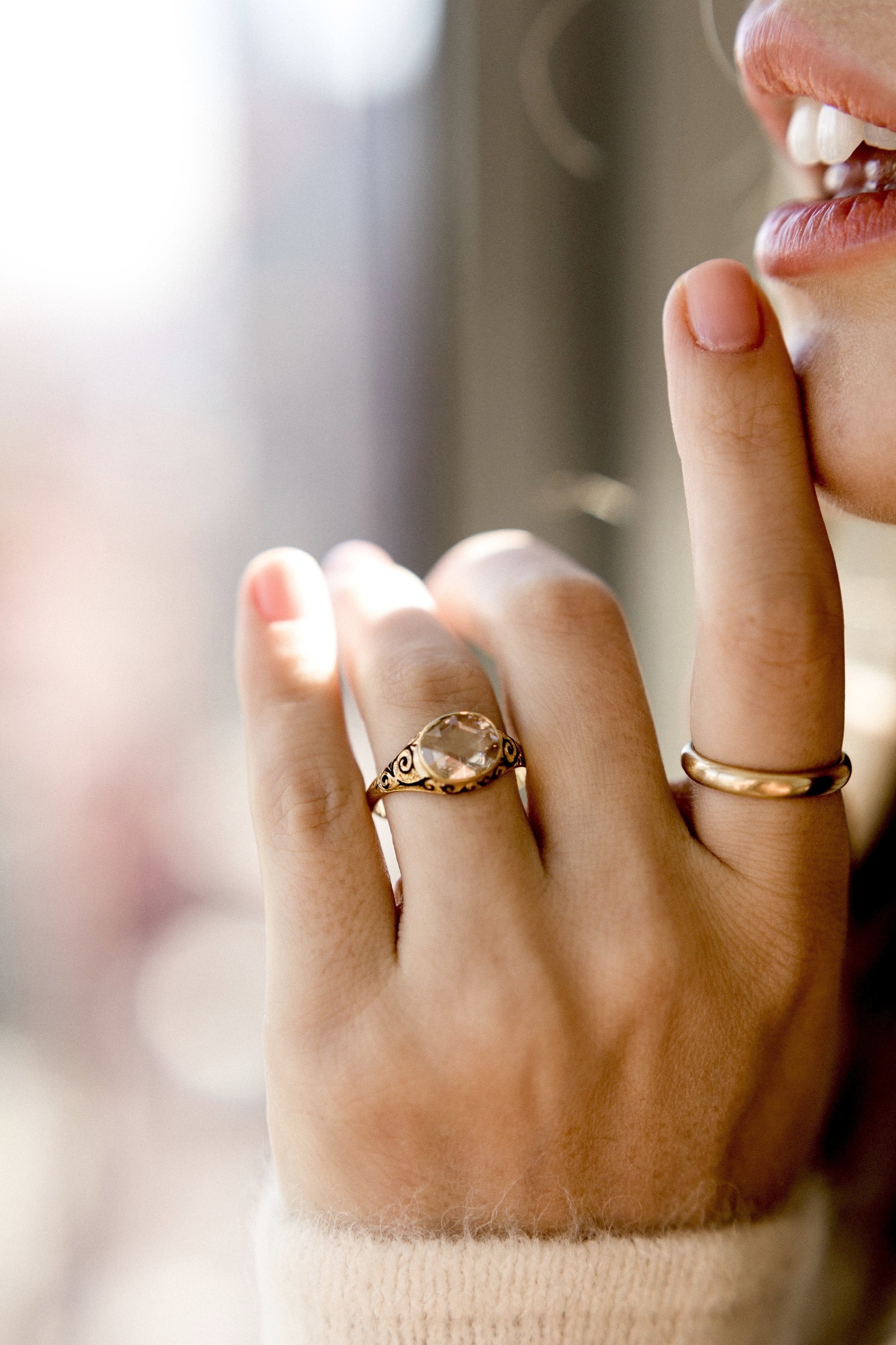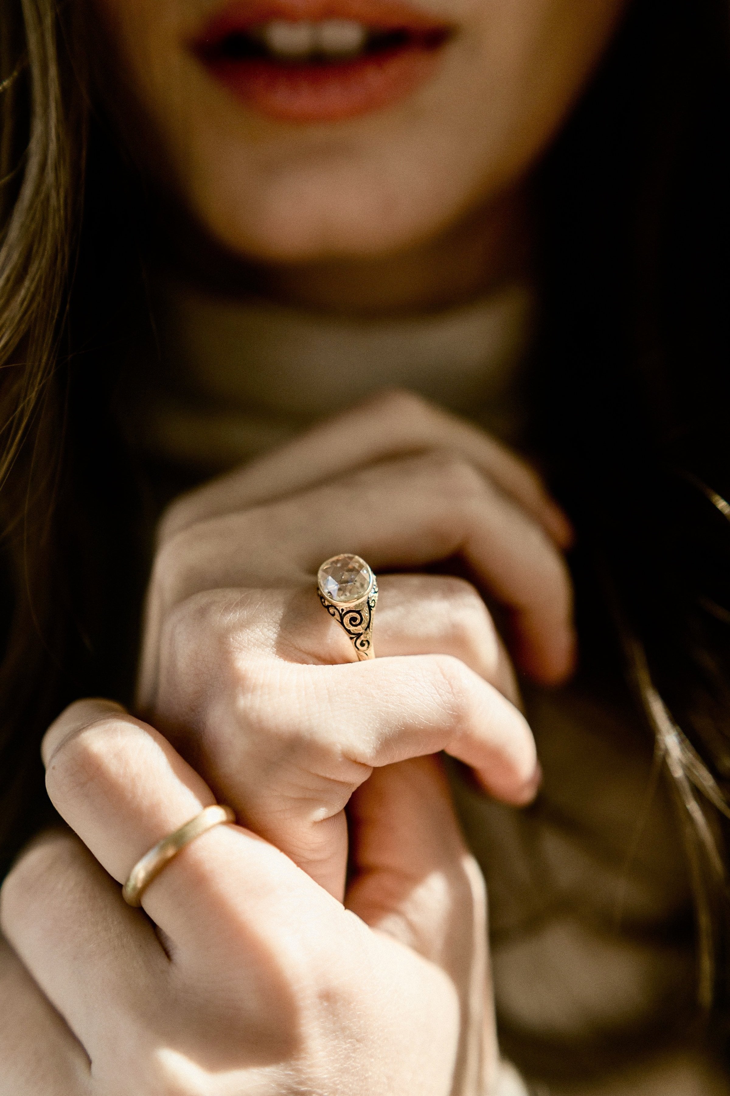 The Manuela Ring is a Victorian engagement ring from the mid 1800s! This oval rose cut diamond engagement ring centers a 1.60 carat oval rose cut diamond of approximately J-K color, SI1 clarity. The diamond is bezel-set in an 18kt yellow gold setting with swirling black enamel details. The ring is size 9.5 and can be resized!