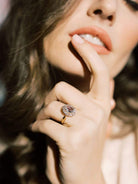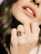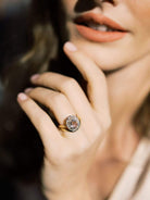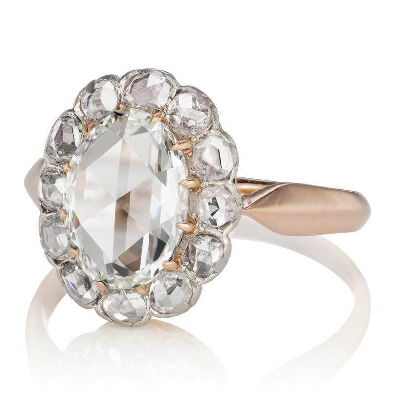 The Lavender ring is a vintage diamond engagement ring from the Edwardian Era. The ring centers a GIA certified 1.51-carat Oval Rose cut diamond of I color, VS2 clarity. The stone is set in a 10-prong gold setting. Surrounding the center stone are 12 rose cut diamonds set into silver bezels. The ring is currently size 6 and can be resized!
