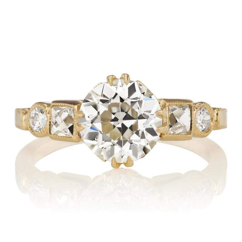 The Paloma 1.91 ring is a VB original made right here in NYC centering an authentic antique diamond. The ring centers a GIA certified 1.91-carat old European cut diamond of K color, SI1 clarity. The stone is set in an 18 karat yellow gold setting with a bezel-set french cut diamond and old European cut diamond to each side and an additional 4 old European cut diamonds in the gallery. Delicate millegrain lines the shank. The ring is currently size 6.25 and can be resized!