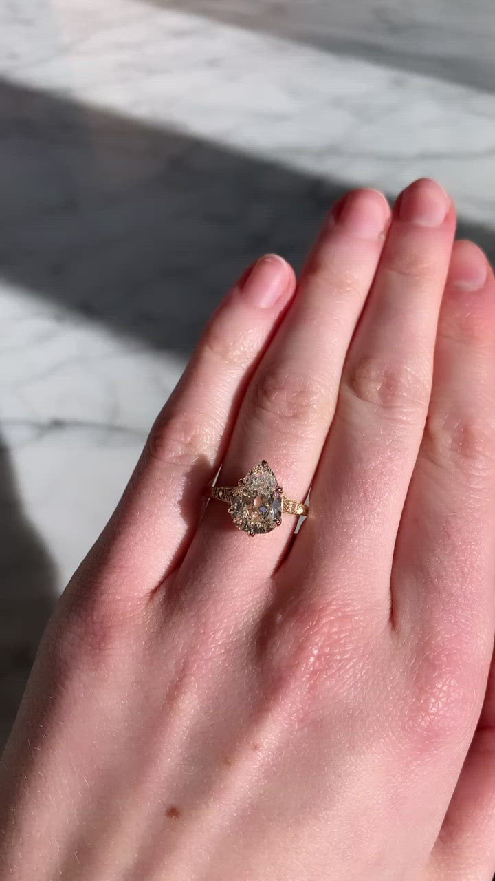 The Mariah 2.98 ring is a VB original made right here in NYC using antique diamonds. The ring centers a GIA certified 2.98-carat Pear cut diamond of I color, VS2 clarity. The stone is set in a 6-prong 18 karat yellow gold setting with two old mine cut diamonds set into either shoulder of the ring. The ring is currently size 6.25 and can be resized!