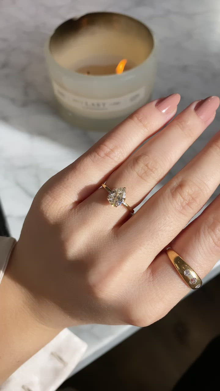 The Paige 1.15 ring is a VB original made here in NYC centering an antique diamond. The ring centers a GIA certified 1.15-carat old pear cut diamond of L color, SI2 clarity. The stone is set in a 5-prong 18-karat yellow gold setting. The ring is currently size 6 and can be resized!