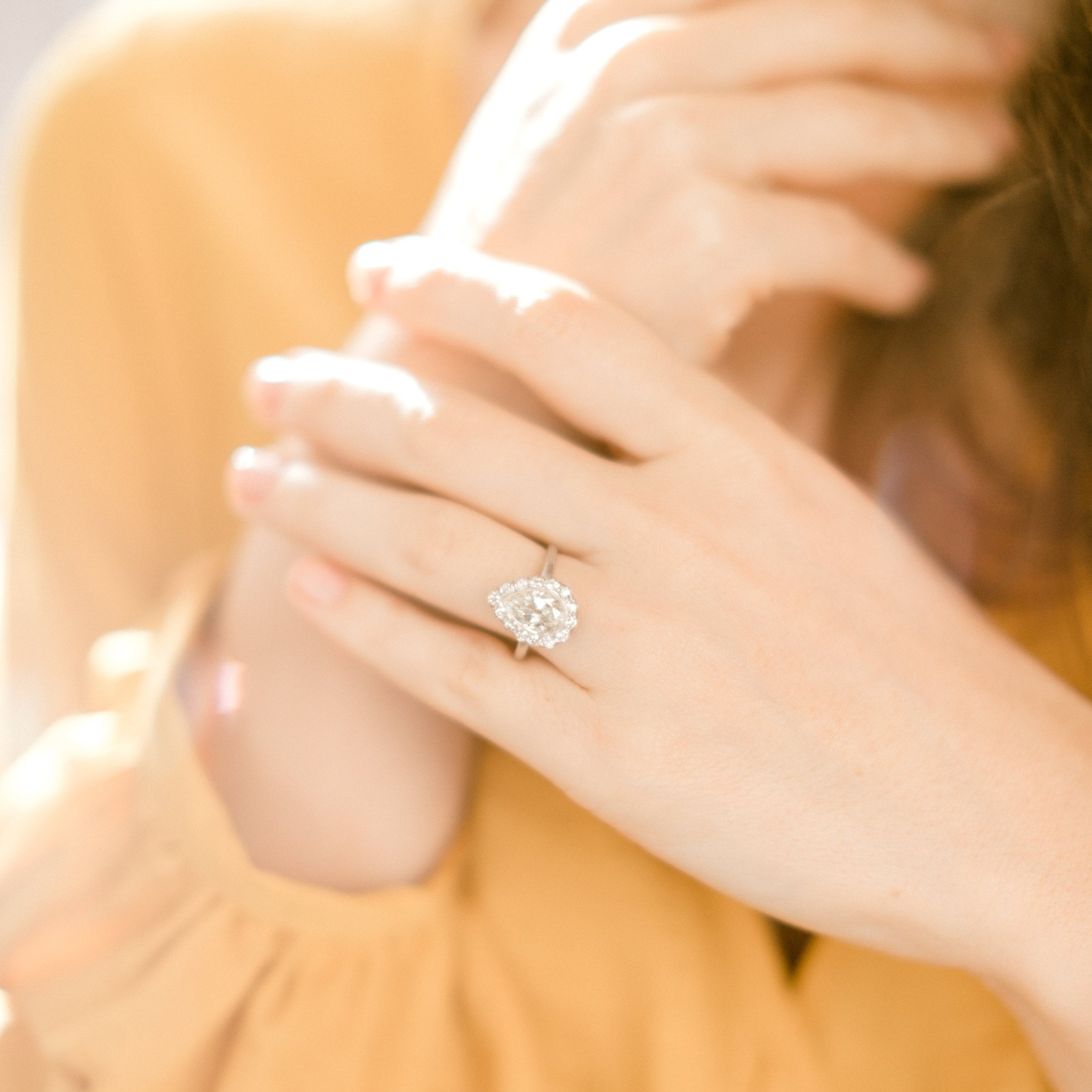 We can't get enough of this eye catcher! The diamonds speak for themselves, but the details draw you in! Both the millegrain and the textured setting for the surrounding stones are a testament to the craftsmanship at work in this pear diamond halo engagement ring!
