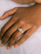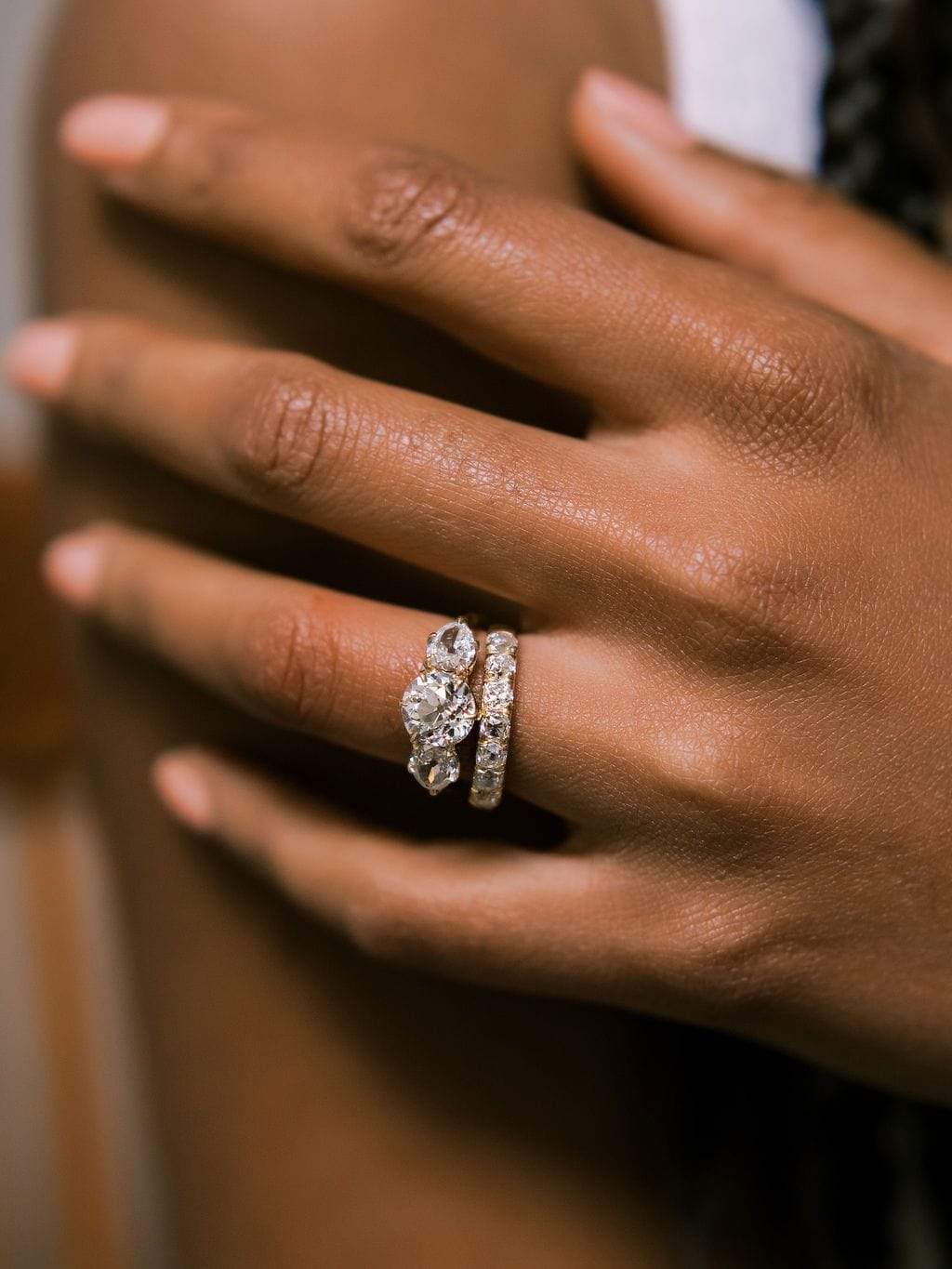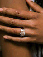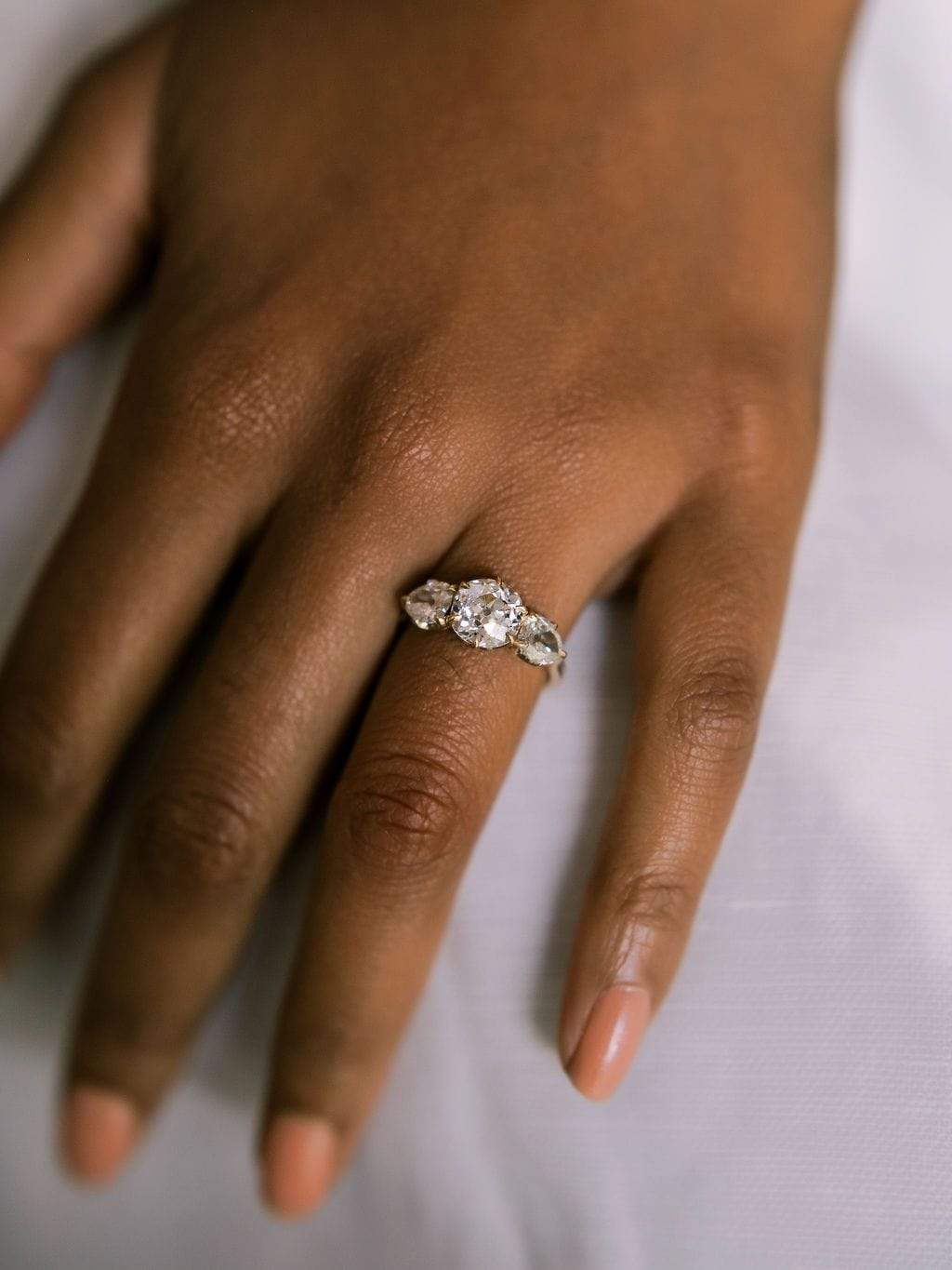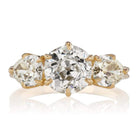 The Melissa 2.11 ring is a VB original design made here in NYC centering an authentically antique diamond. The ring centers a GIA certified 2.11-carat old mine cut diamond of J color, SI2 clarity. To each side is a pear shape diamond, both combining for 0.99 carats. The stones are set in an 18-karat yellow gold setting. The ring is currently size 6 and can be resized!