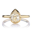 The Allie 1.03 ring is an AB original design made right here in NYC. The ring centers a GIA-certified 1.03-carat Pear Cut diamond of K Faint Brown (read: very light champagne) color and SI1 clarity. The stone is set in an 18kt yellow gold collet setting. The ring is currently size 6.25 and can be resized!