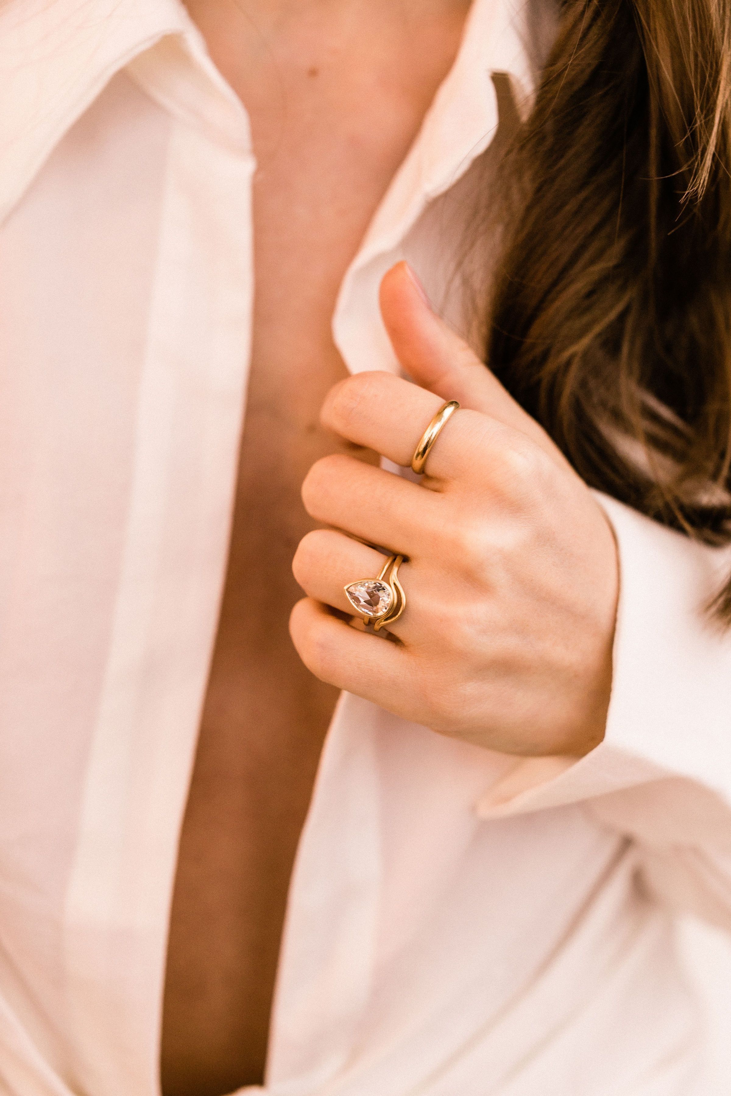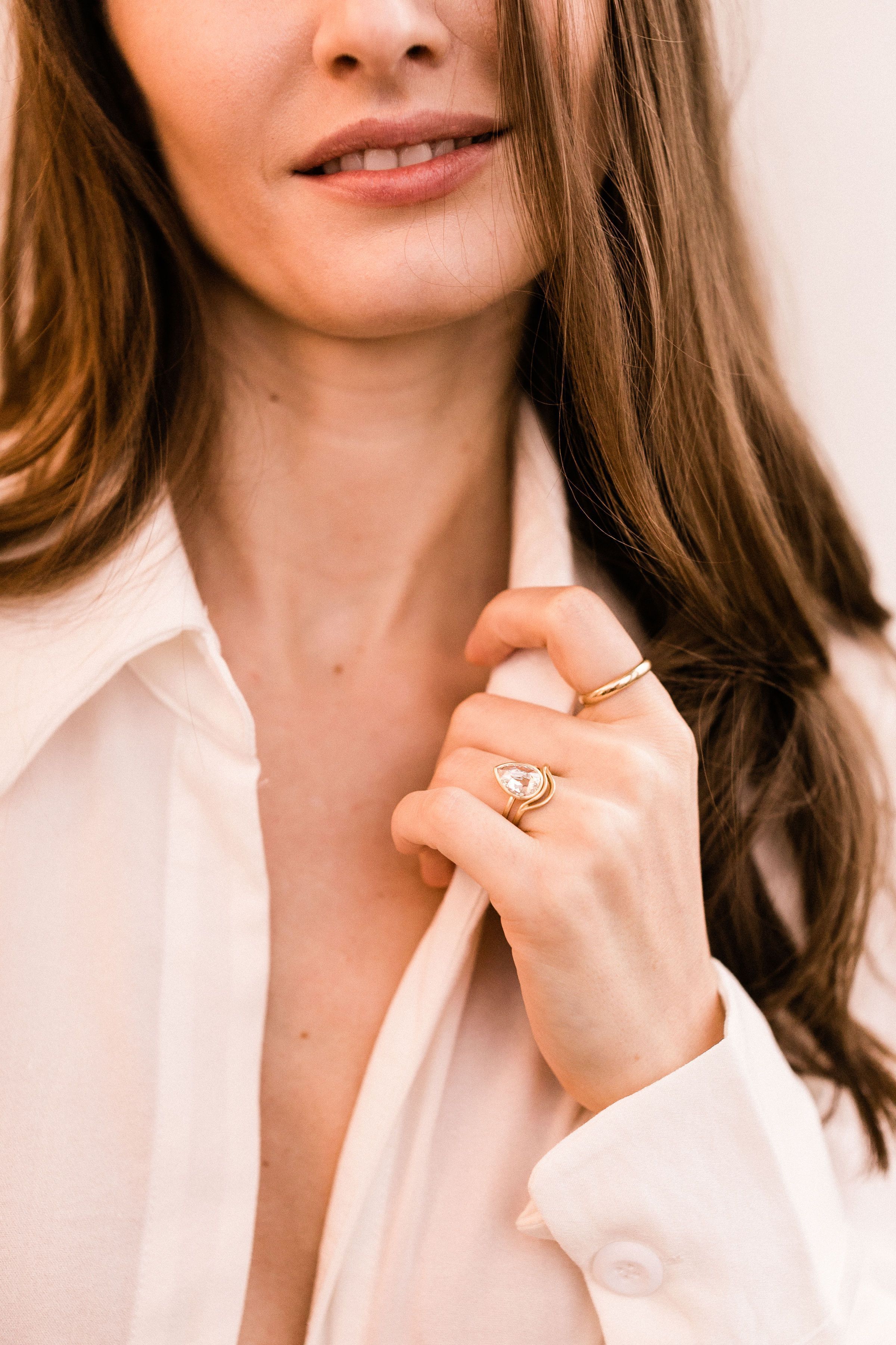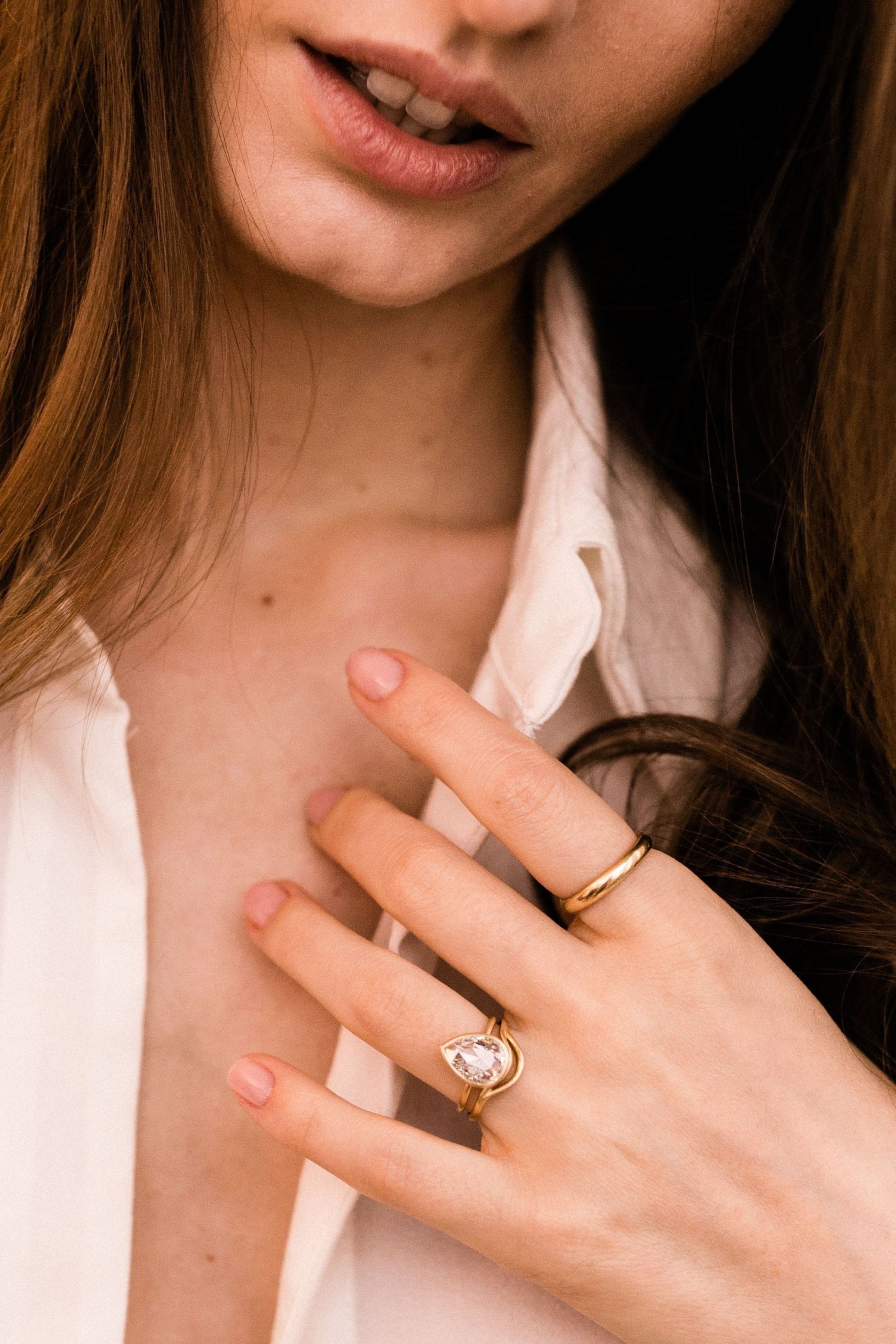 The Zinfandel 1.84 ring is a vintage-inspired VB-made pear-shaped solitaire diamond engagement ring with an authentically antique diamond! The ring centers a GIA Certified 1.84 carat Pear Rose Cut diamond of H color, SI2 clarity. The diamond is bezel set in an 18kt yellow gold setting with a partially closed back. The ring is currently size 5.75 and can be resized!