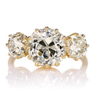 The Marielle 3.47 ring is an AB original design made right here in NYC. The ring centers a GIA-certified 3.47-carat Old Mine Cut diamond of N color, SI1 clarity. To each side of the center stone is an old mine cut diamond of coordinating color and clarity combining for approximately 1.80-carats. The stone is set in our signature 12-prong 18kt yellow gold setting. The ring is currently size 6+ and can be resized!