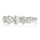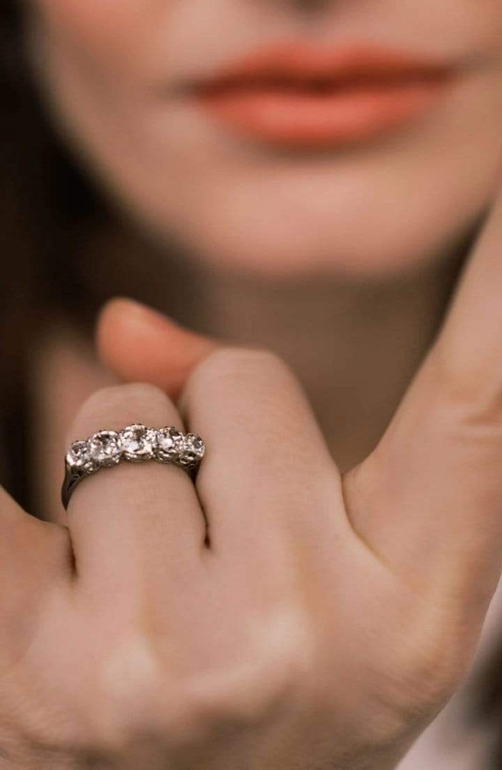 The Jossy ring is an authentic vintage ring from the Edwardian Era. The ring features 5 old mine cut diamonds that combine for approximately 1.10 carats of I-J color, SI clarity. The diamonds are set in a platinum ring with gorgeous, scrolling details to the basket. The ring is size 6.75 and can be resized to some sizes.