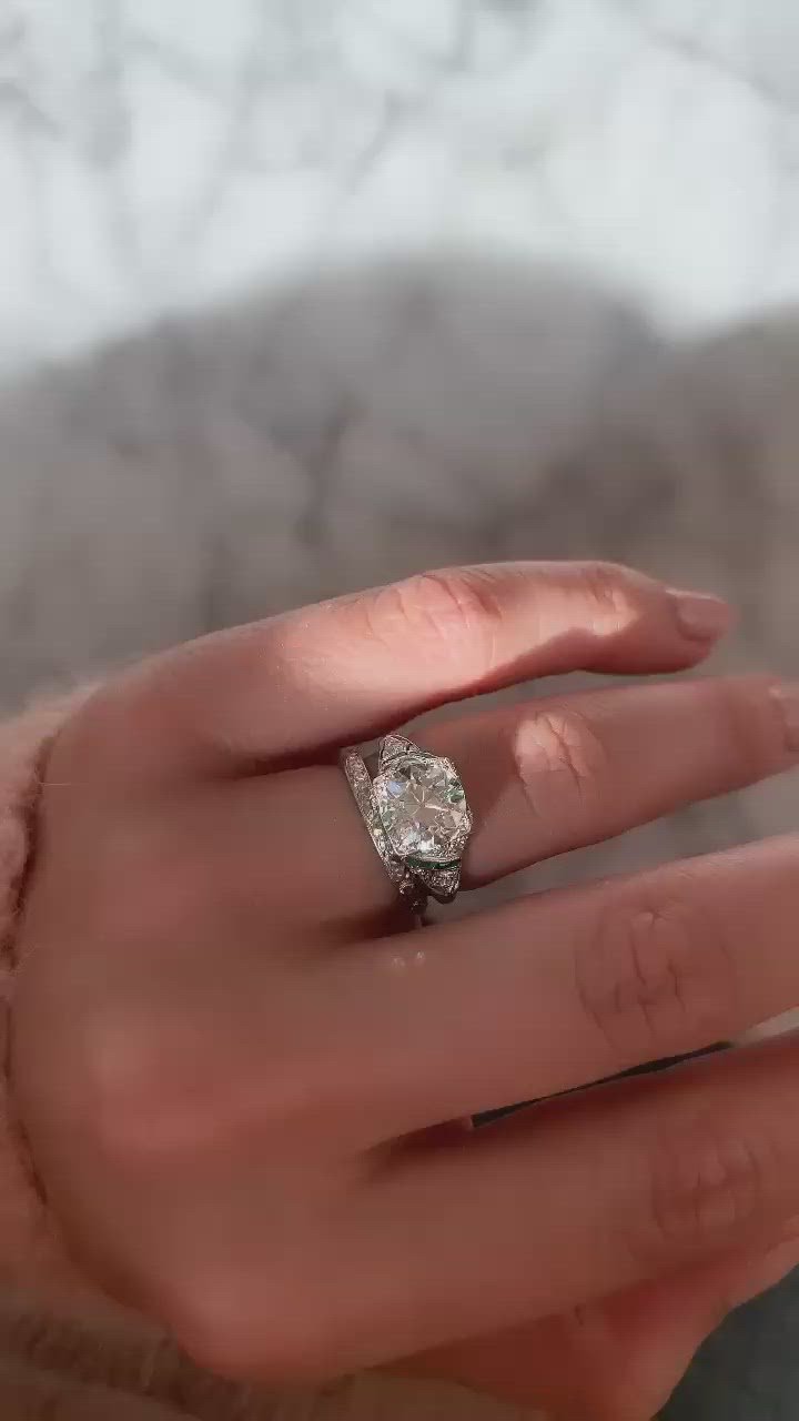 The Lyla Ring is a platinum diamond and emerald engagement ring from the Art Deco Era, circa 1926! This stunning ring centers a GIA Certified 2.63 carat old European cut diamond of L color, VS2 clarity. The diamond is box-set in a platinum ring with lots of handcrafted details! Calibre cut emerald baguettes adorn the gallery and shoulders with 8 additional old European cut diamonds decorating the shoulders. Millegrain and open metalwork add to the hand-crafted beauty of the ring with engravings that continue part-way down the shank. The inner band has an inscription that reads, "To Esther from her sweetheart 2-17-1926". The ring is size 6 and can be resized to some sizes!