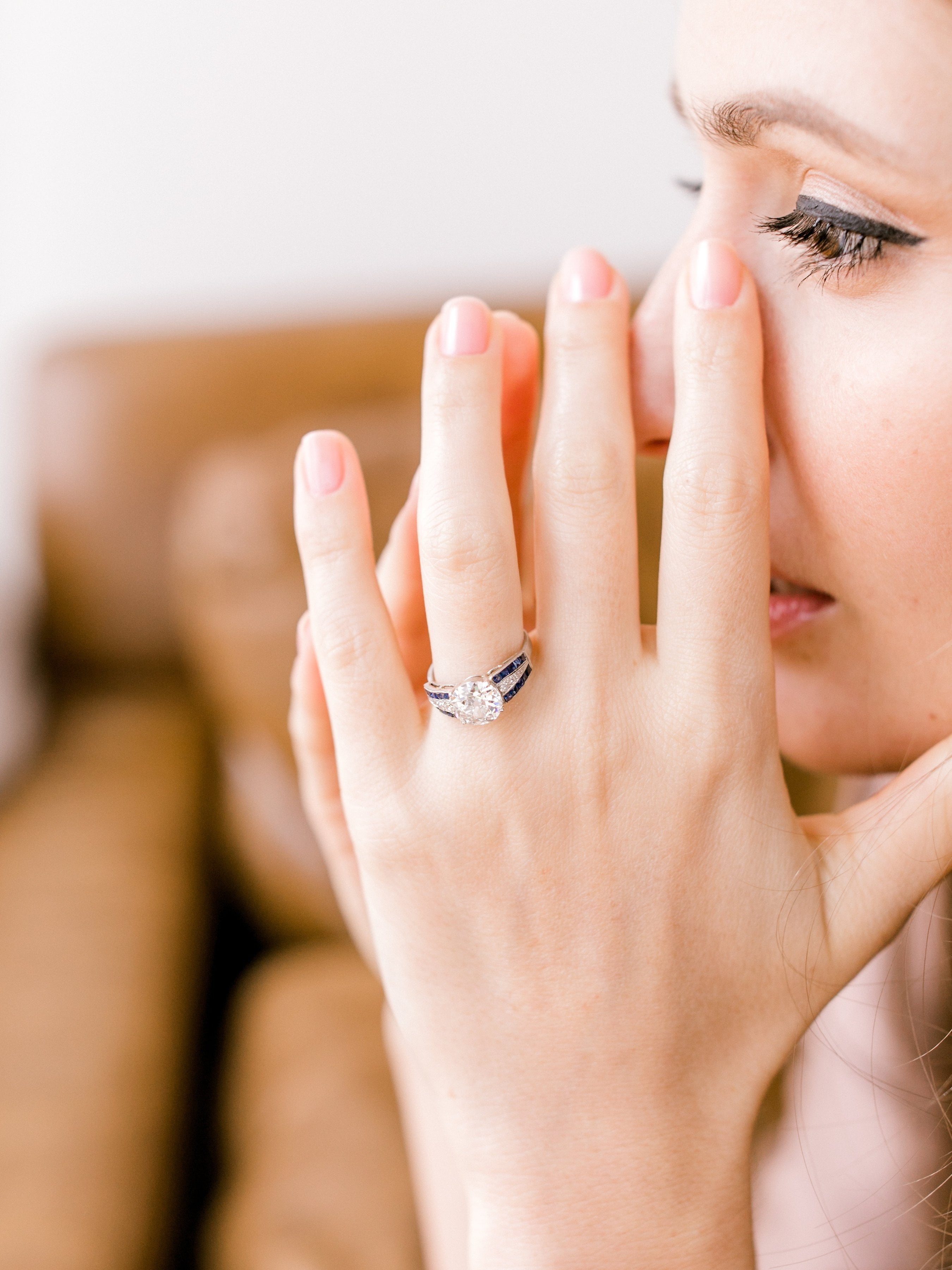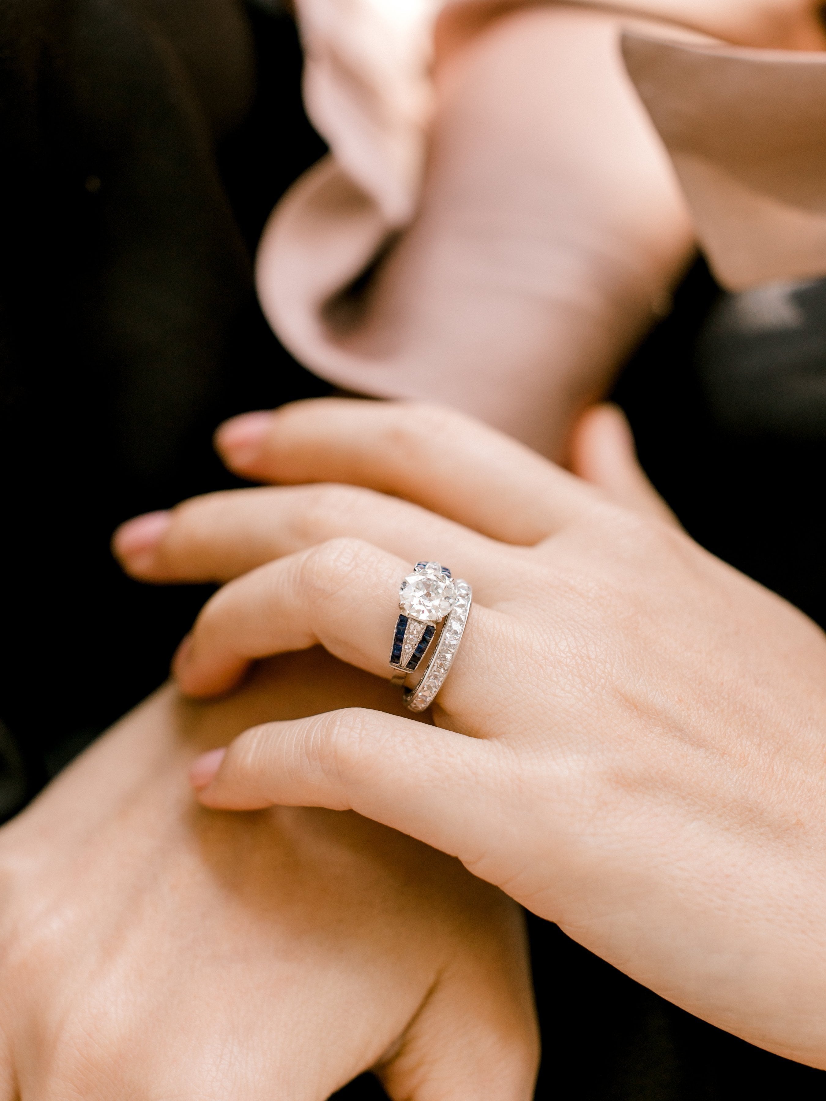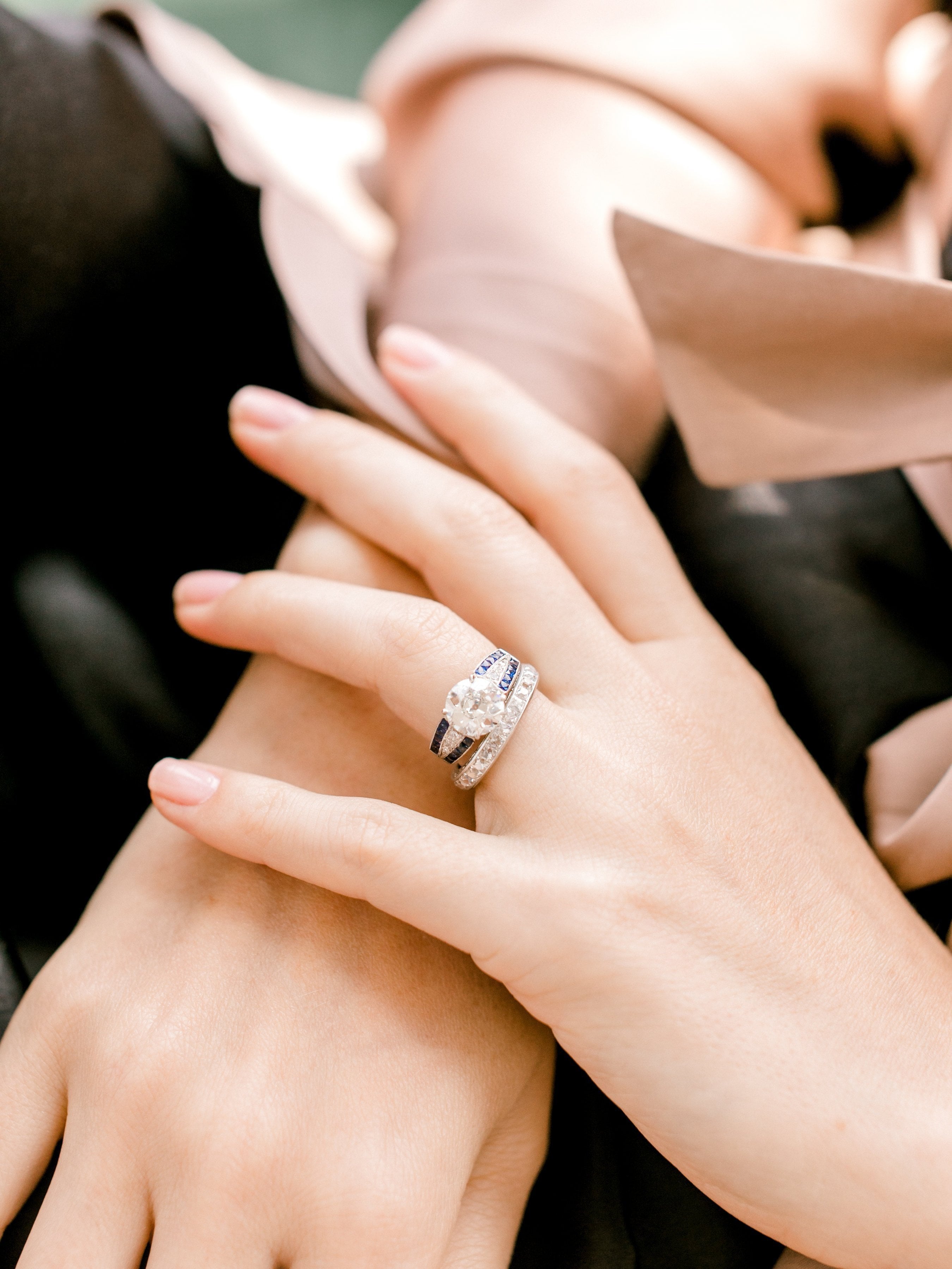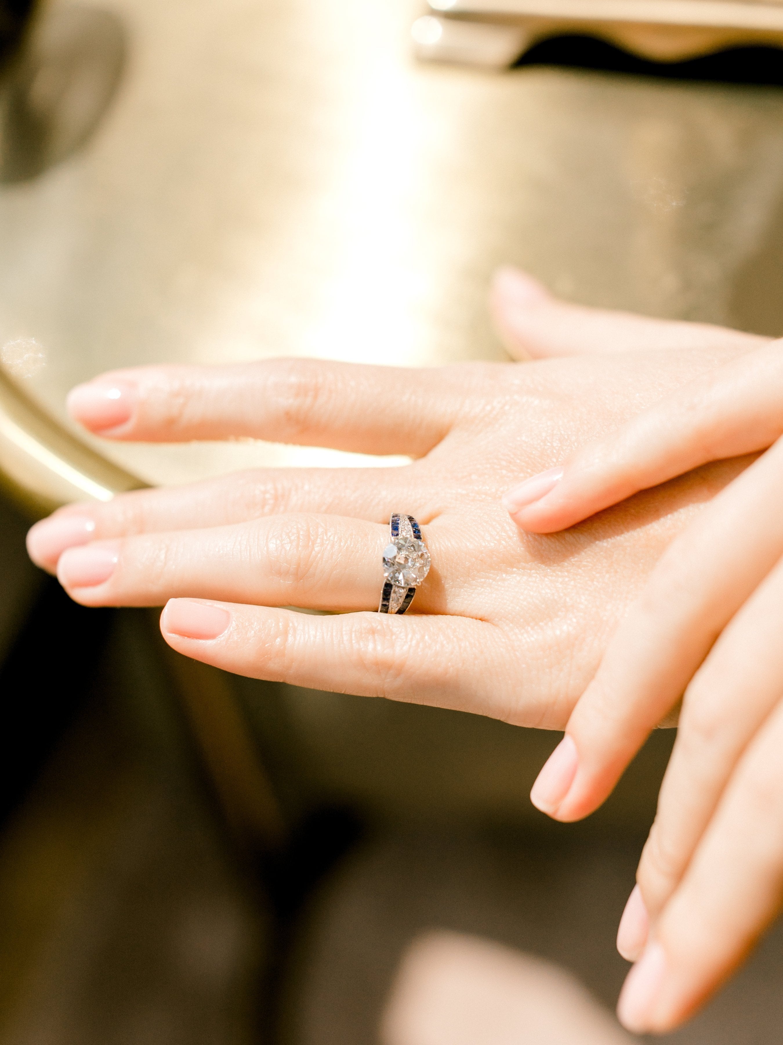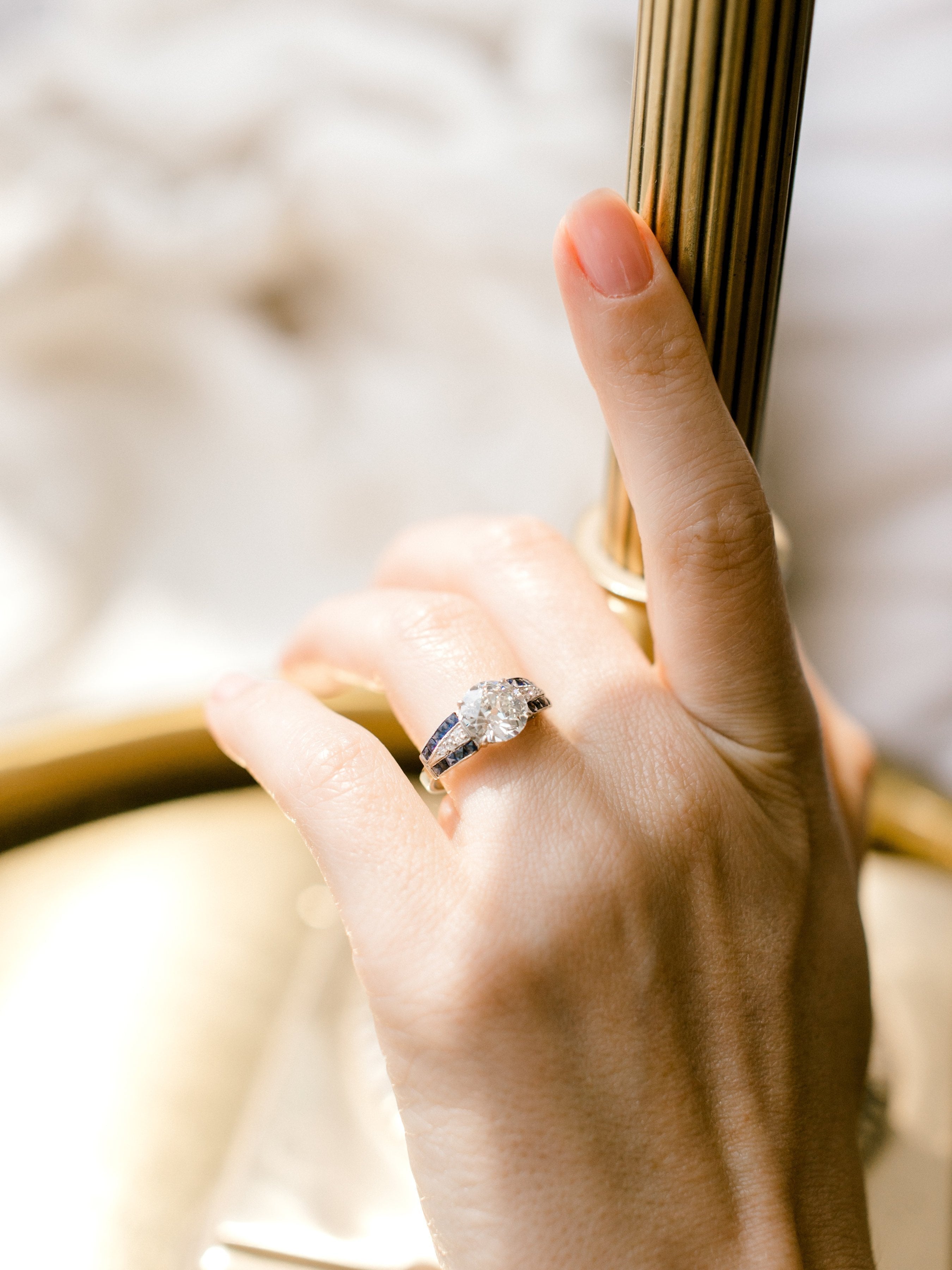 An Art Deco dream! The center diamond is super white with incredible scintillation and perfectly accented by the bold sapphires and diamonds for a chic look! This ring pairs well with bands too!