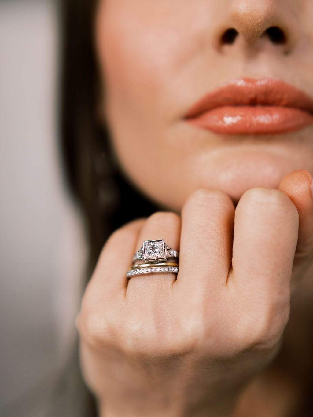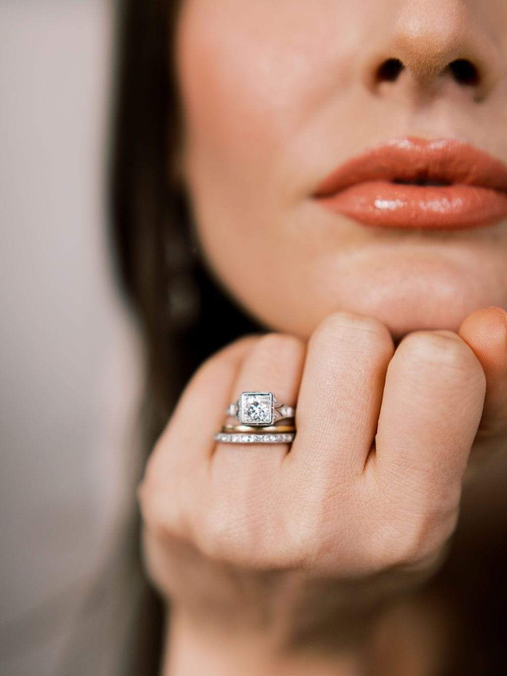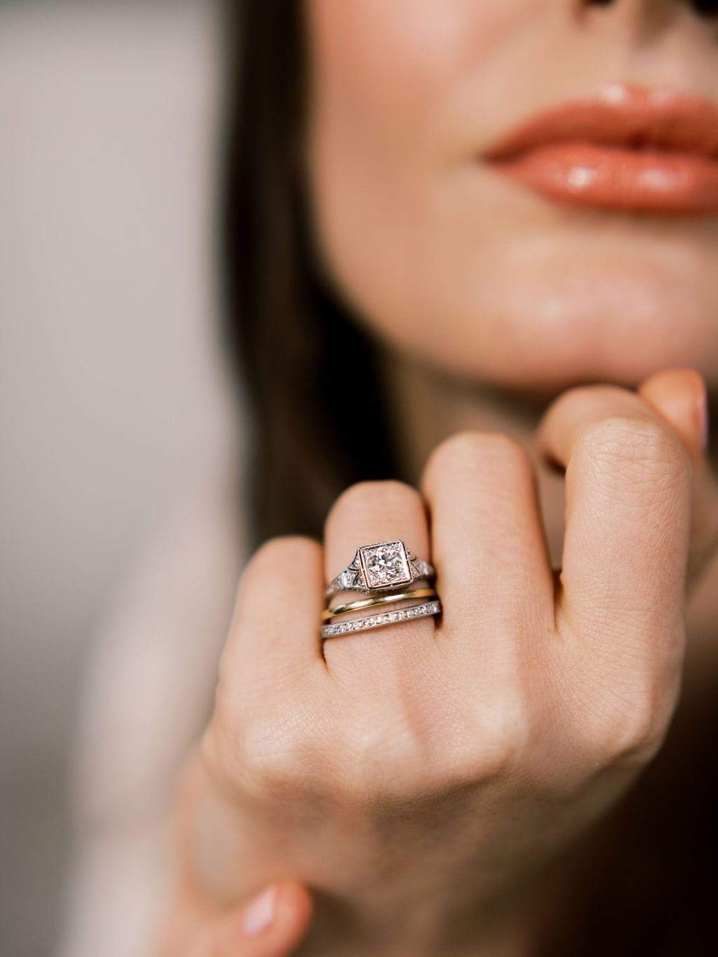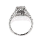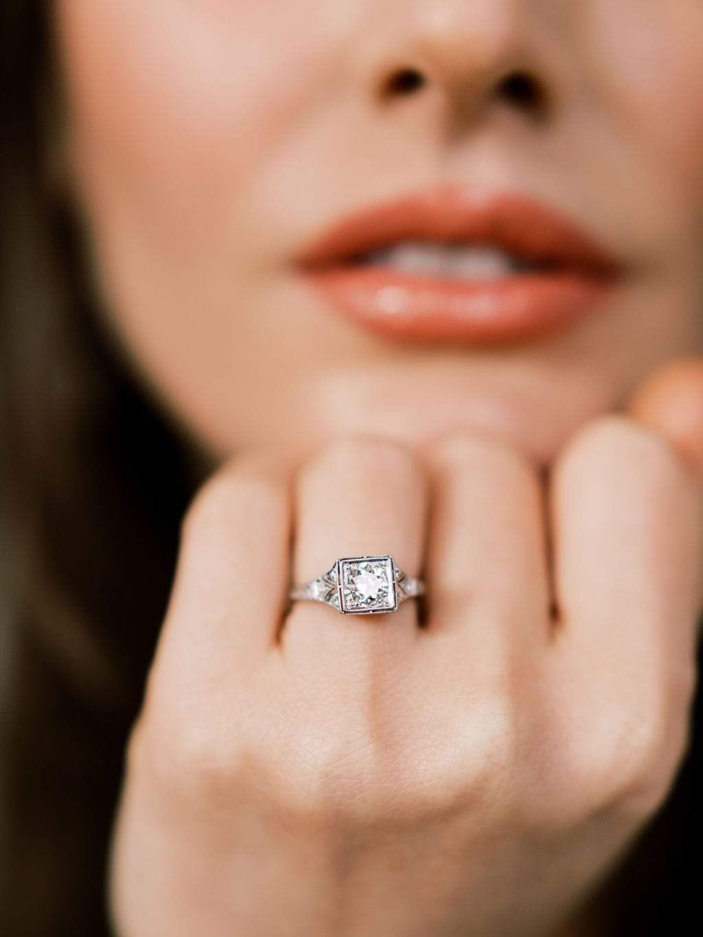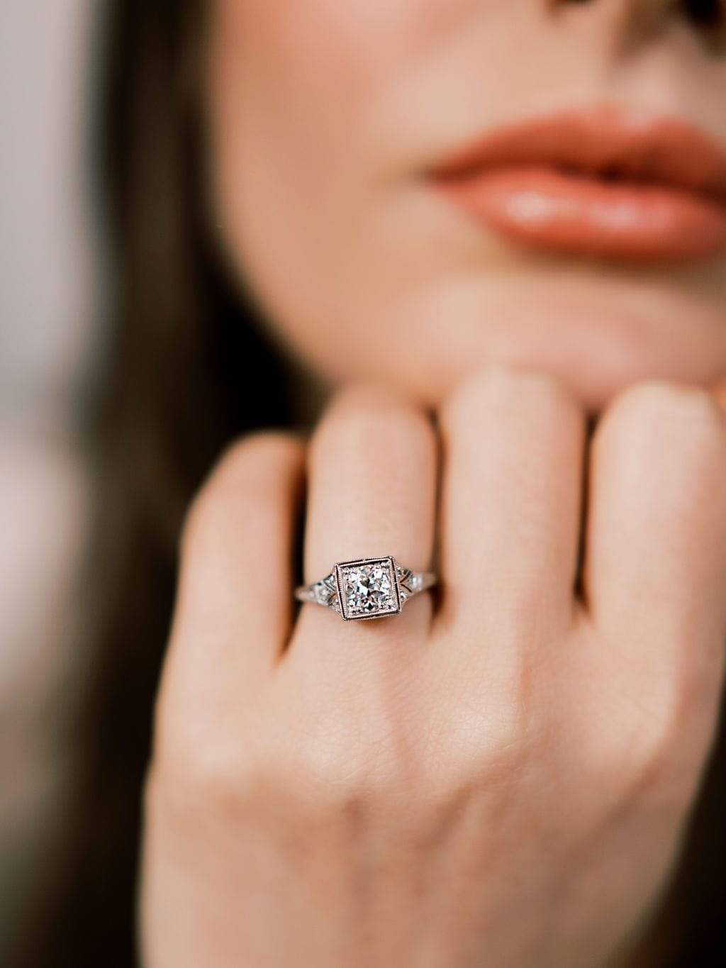 This ring is a gorgeous display of Art Deco craftsmanship. We see very linear themes in the squared setting around the round diamond and delicate details that cover every angle of this little piece of art. We are also always super excited when the original inscription is on a vintage ring!