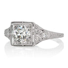 The Carrie ring is an authentic vintage ring from the Art Deco era circa 1923! This gorgeous piece centers a GIA Certifed 0.78 carat transitional cut diamond of G color, SI1 clarity. The diamond is set in a platinum box setting with three small diamonds decorating each shoulder and delicate filigree and hand engravings finishing off the piece. The inside shank has an original engraving that reads, "G.B. to A.E.W. 6-9-23". The ring is size 4.75 and can be resized!