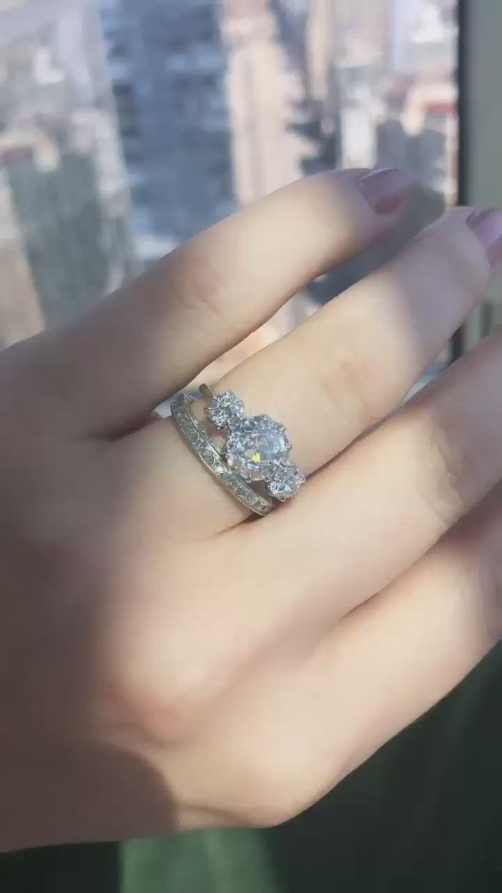 The Marielle 1.43 ring is a VB-made diamond engagement ring. The ring centers a GIA certified 1.43-carat old European cut diamond of D color, IF clarity. The stone is set in a 10-prong platinum setting. To each side of the center stone is a 0.30ct old European cut diamond. The ring is currently size 6 and can be resized!