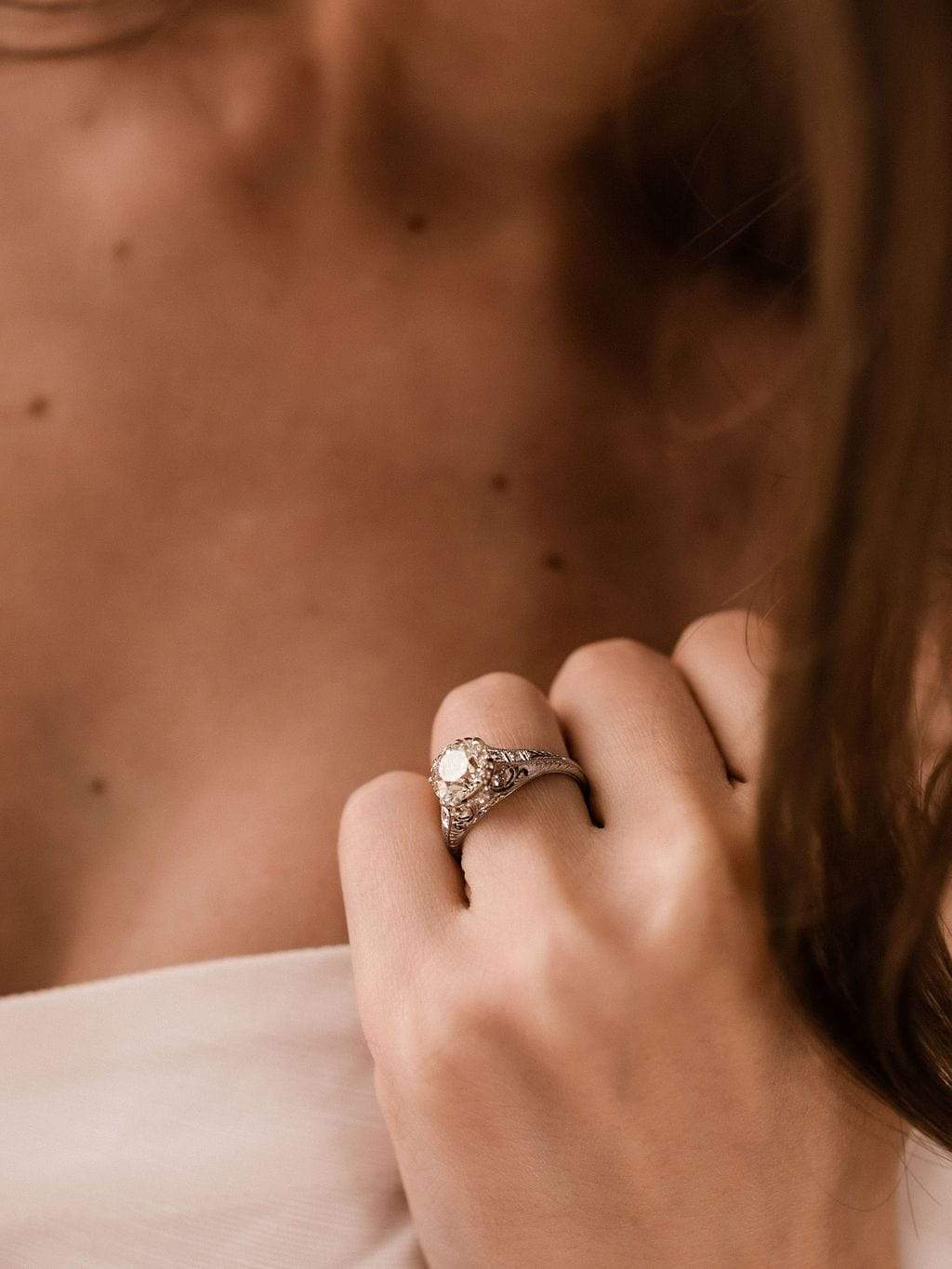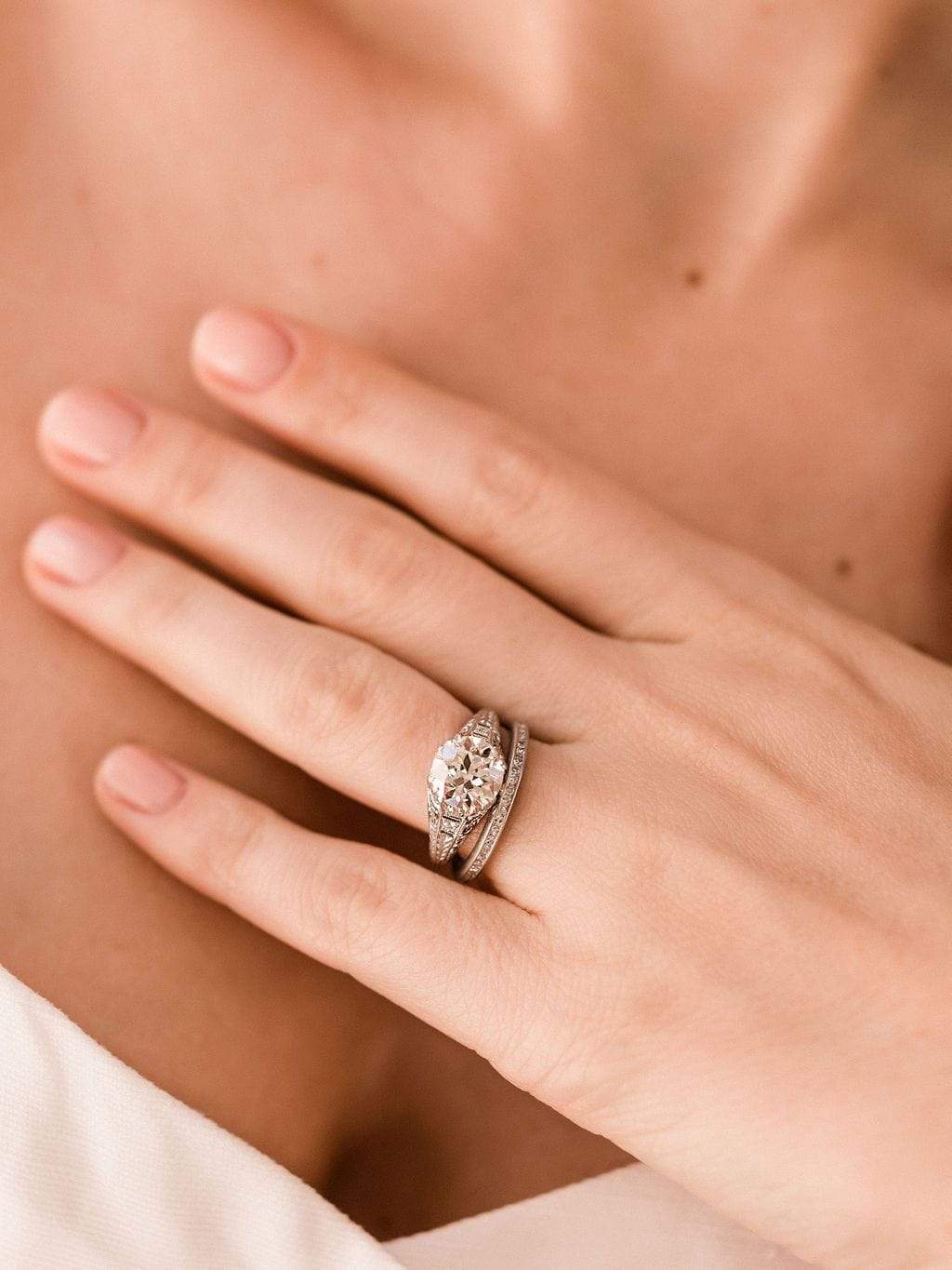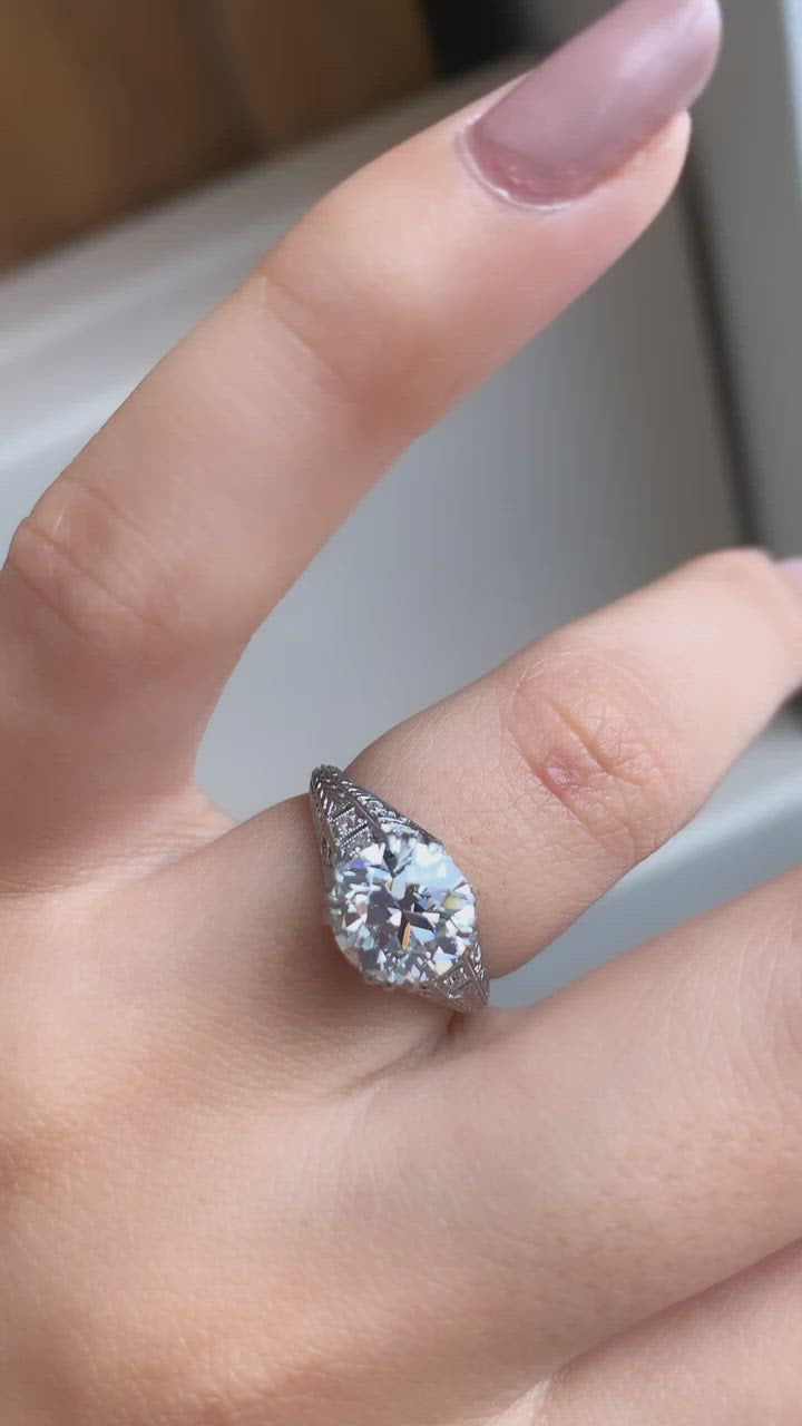 The Marcelle ring is an authentic Edwardian era engagement ring circa 1915! This 2.24 ct Platinum Triple Prong Engagement Ring centers a GIA certified 2.24 carat old European cut diamond of L color, SI1 clarity. The diamond is set in a 4 triple-prong setting. This platinum ring features gorgeous detailing with two diamonds set in each shoulder and 6 diamonds in the gallery with scrolling metalwork details and hand engravings decorating the ring. The ring is currently 6.25 and can be resized!