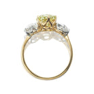 The Marielle 2.33 ring is an AB original design made right here in NYC. The ring centers a GIA-certified 2.33-carat Pear Cut diamond of Fancy Light Brownish Greenish Yellow color, I1 clarity. The stone is set in a 6 prong platinum and 18kt yellow gold setting. An old European cut diamond of approximately H-I color, VS-SI clarity combining for 1.00-carats is set to either side of the center stone. The ring is currently size 6.75 and can be resized!
