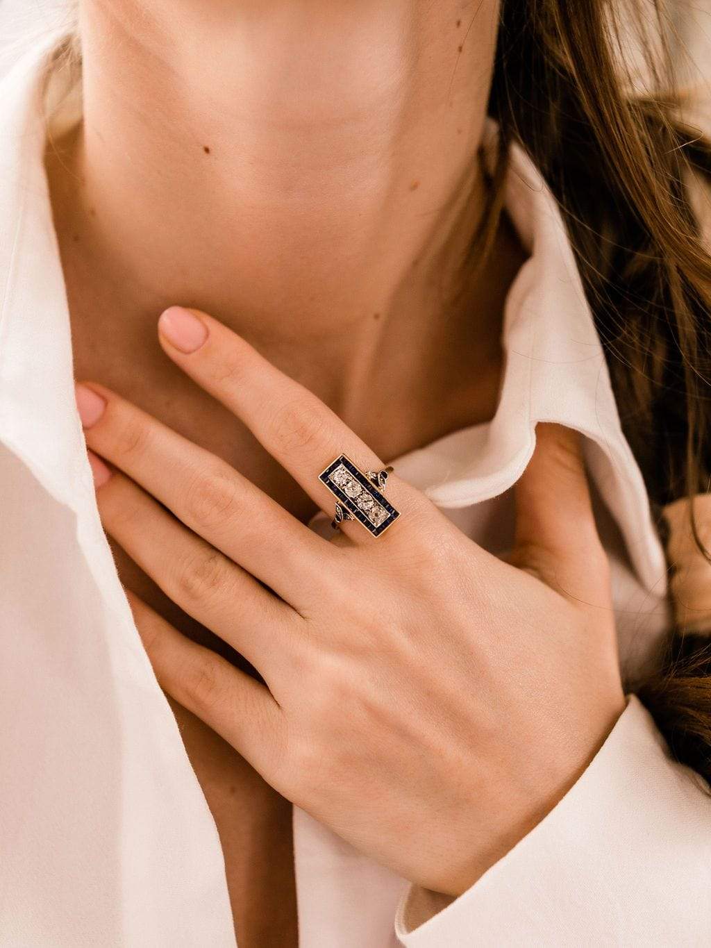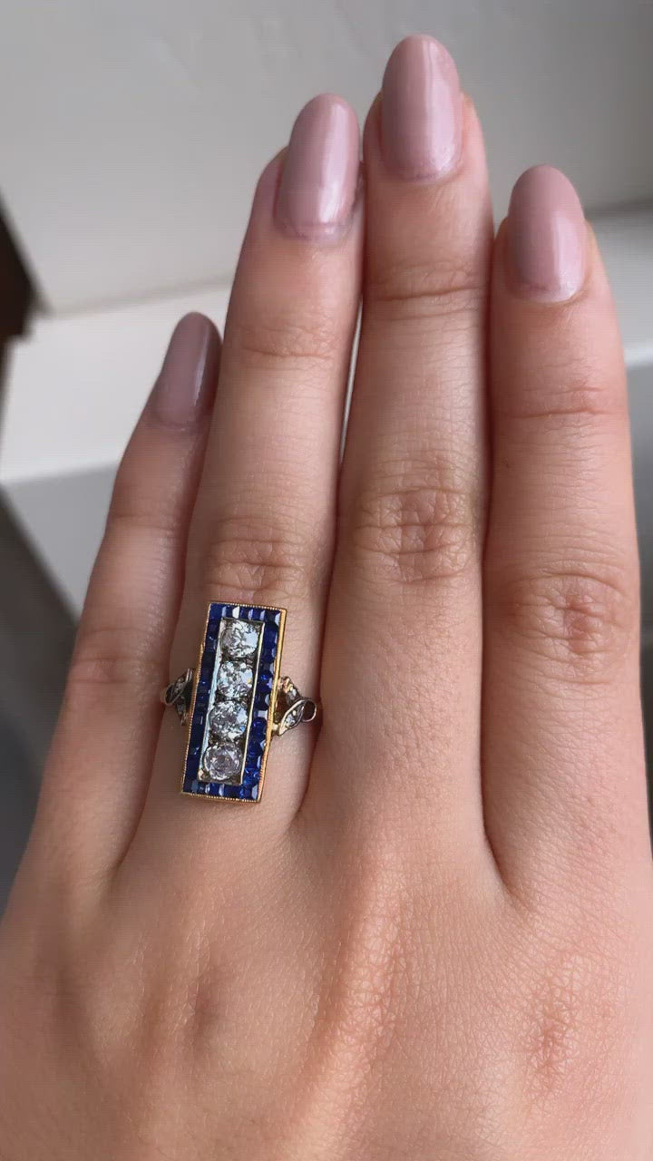 The Vinnie ring is a gorgeous cocktail ring from the Edwardian era circa 1910! This Sapphire & Diamond Rectangle Halo Engagement Ring centers 4 bead-set old European cut diamonds of J-K color, VS clarity all combining for approximately 0.70 carats. The diamonds are set vertically in an 18kt yellow gold setting with a halo of calibre cut sapphires. The shoulders have platinum floral inspiration with two rose cut diamonds set into each! The ring is currently size 7.75 and can be resized!