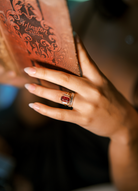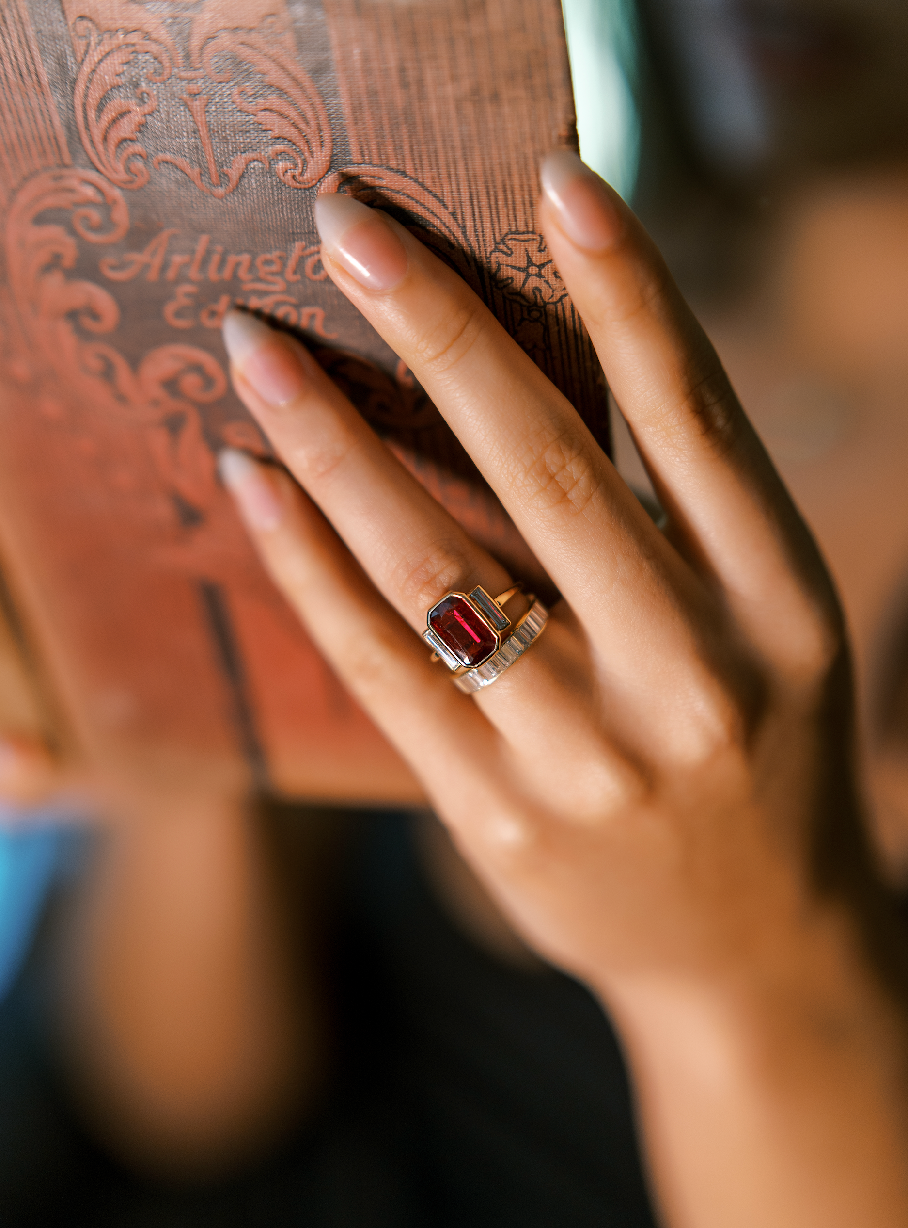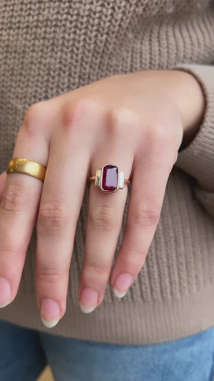 The Remmy 2.52 ring is an AB original design made right here in NYC. The ring centers a GIA-certified 2.52-carat Octagonal cut Heated Burmese Ruby. A vertical baguette is set to either side of the center stone, both combining for approximately 0.30 carats. The stones are bezel set in an 18kt yellow gold setting. The ring is currently size 6 and can be resized!