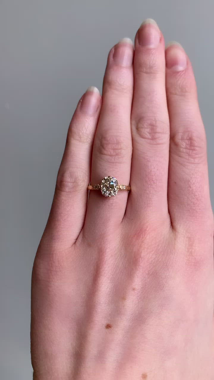 The Rosaria 1.93 ring is a VB original design made right here in NYC. The ring centers a GIA-certified 1.93-carat old mine cut diamond of Fancy Light Brown-Yellow color, I1 clarity. The stone is set in a 4-prong 18 karat yellow gold setting with 2 old European cut diamonds bead-set into each shoulder and lined with fine millegrain. The ring is currently size 6 and can be resized!