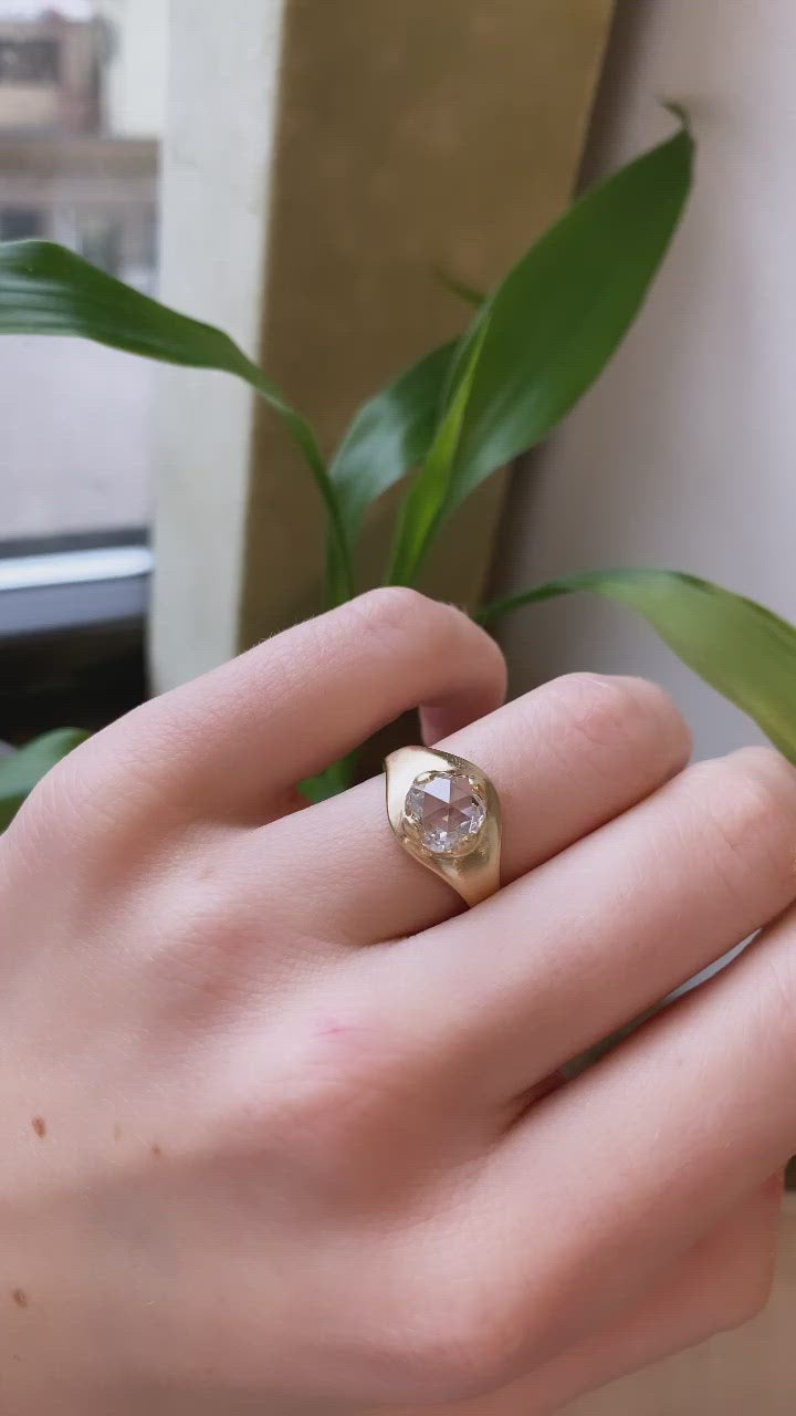 The Gadot 1.15 ring is a VB original design made right here in NYC using an authentically antique diamond. The ring centers a GIA certified 1.15-carat Rose cut diamond of L, Faint Brown color, I1 clarity. The stone is set in a 4-prong 18 karat yellow gold setting. The ring is currently size 5.75 and can be resized!
