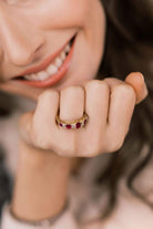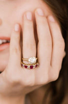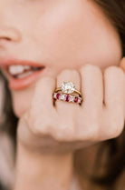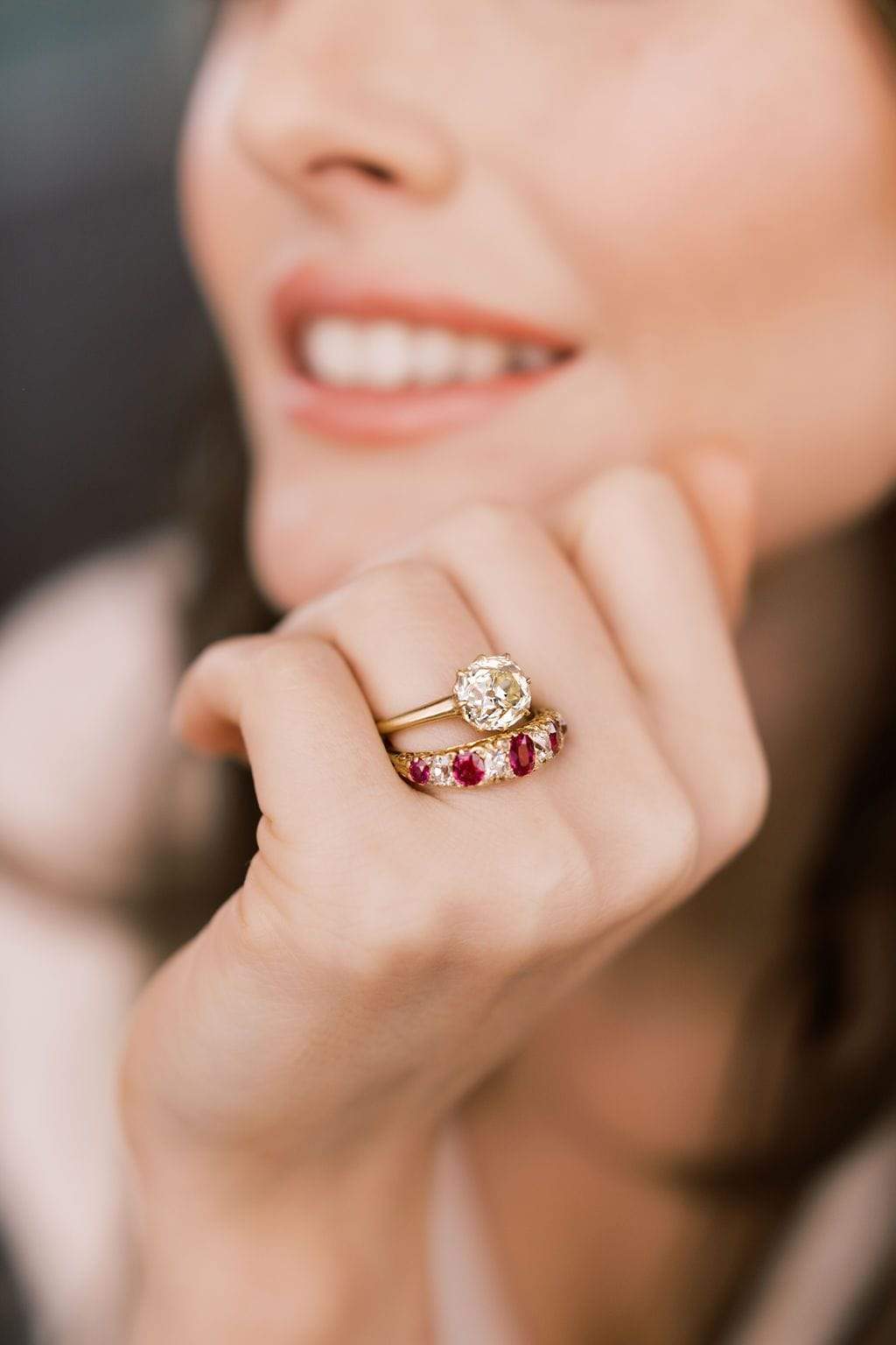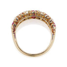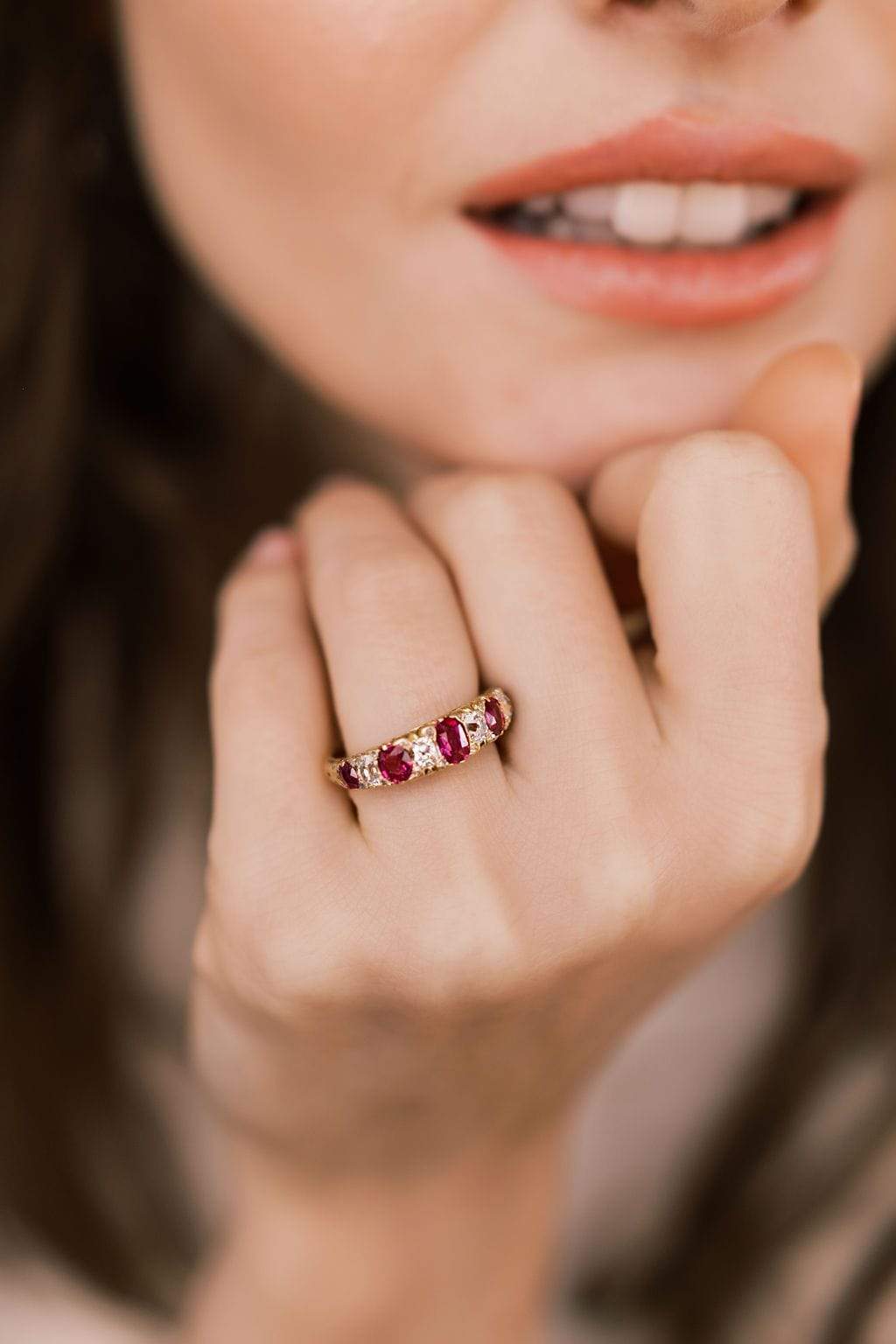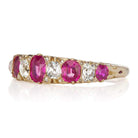 The Antoinette band is an authentic antique ruby and diamond band. The ring has 5 oval cut natural rubies with 4 alternating old mine cut diamonds. The diamonds are approximately J-K in color, VS in clarity. There are 16 small rose cut diamonds set in between the stones The stones are set in an 18 karat yellow gold setting. The ring is currently size 8 and can be resized!