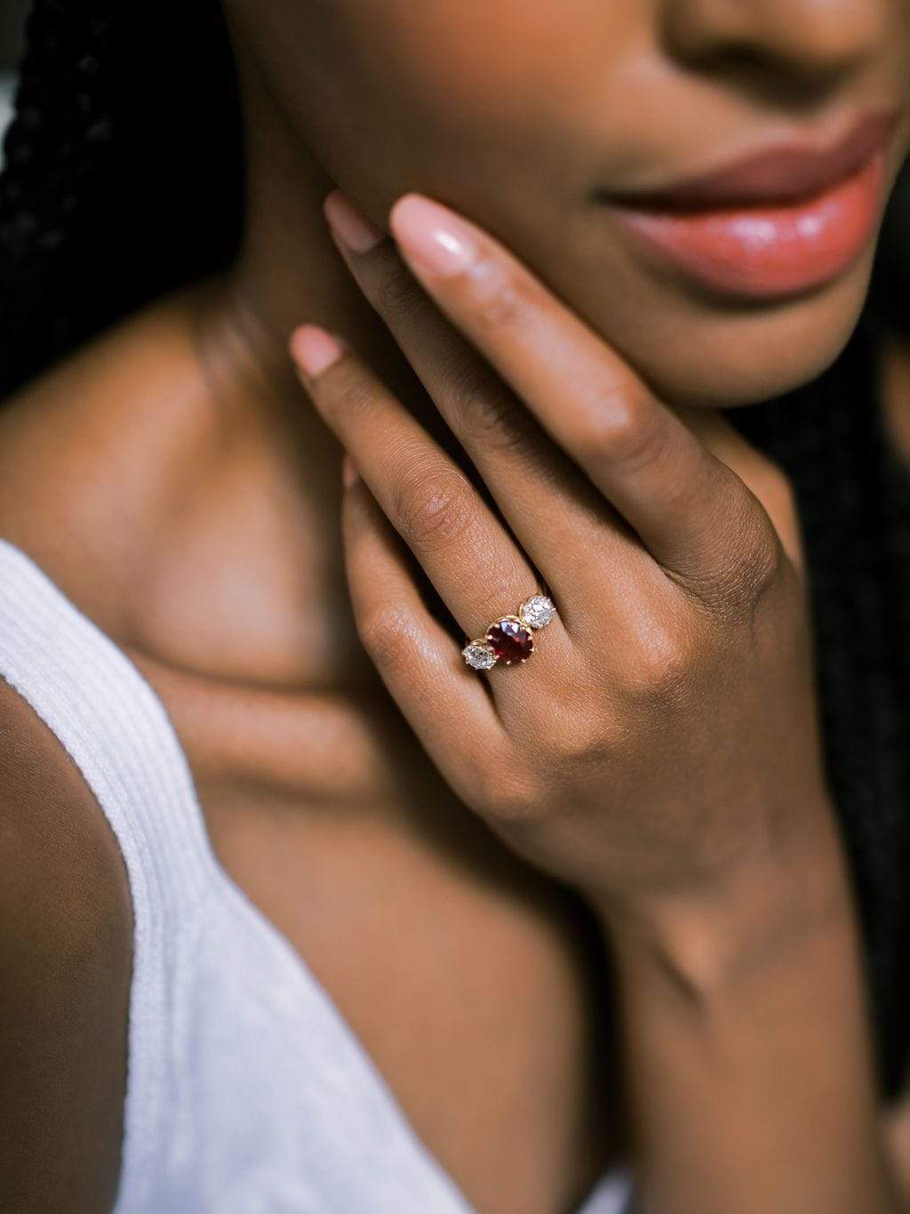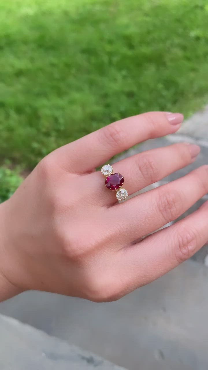 The Mirabelle 2.62 ring is a VB original design made right here in NYC using authentically antique stones. The ring centers a GIA certified heated Burmese Ruby of 2.62 carats. The stone is set in an 18-karat yellow gold setting with an old European cut diamond to each side that both combine for 1.56 carats. The ring is currently size 5 and can be resized!