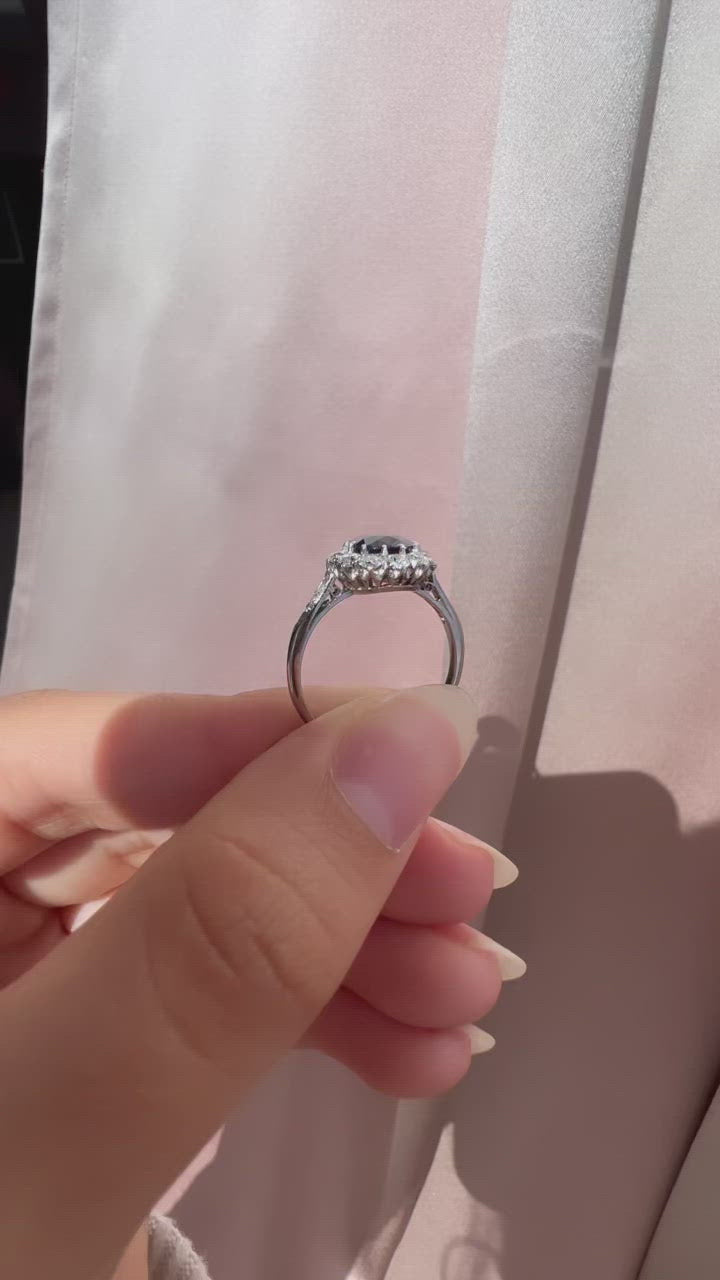 The Matilde ring is an authentic vintage sapphire and diamond ring from the Edwardian Era circa 1910. The ring centers a GIA-certified no-heat Cambodian sapphire of approximately 1.35 carats. The sapphire is surrounded by a halo of 12 old European cut diamonds of approximately J-K color, VS clarity. The stone is set in a 12 prong platinum setting with 3 small old cut diamonds on each shank. The side diamonds all combine for approximately 0.70 carats. The ring is currently size 7.5 and can be resized!