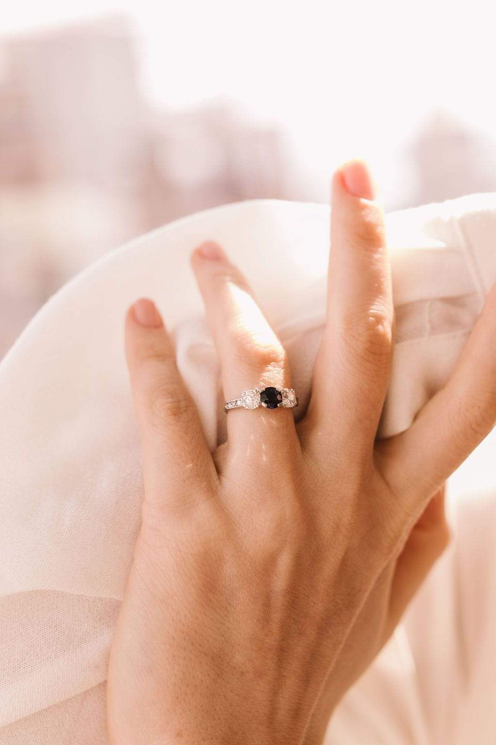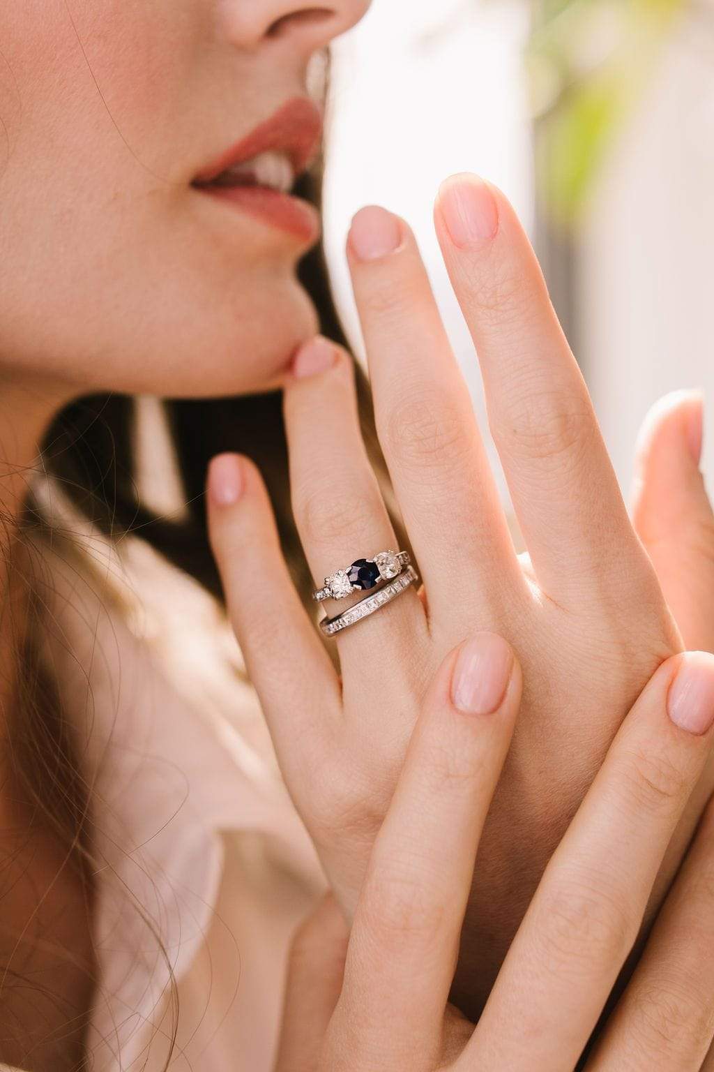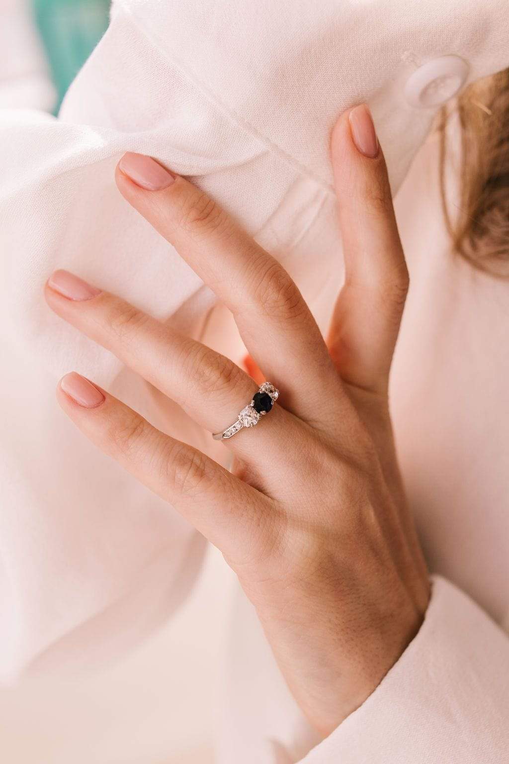 This piece is elegant in its clean simplicity. Vibrant stones in a classic three stone setting that makes it pair well with bands!