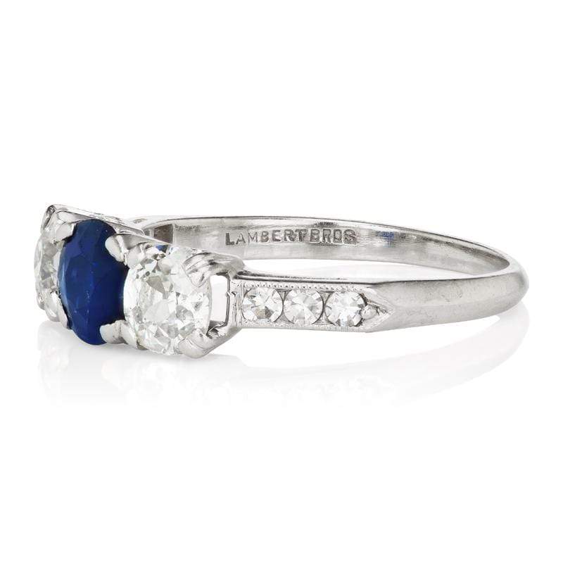 The Millie ring is an authentic Lambert Brothers Art Deco engagement ring circa 1920! This Sapphire & Diamond Lambert Brothers Engagement Ring centers a Sapphire of approximately 0.50 carats. The stone is prong-set in a platinum setting with an old European cut diamond to each side, each approximately 0.35 carats each, approximately I-J color, SI clarity. Three small diamonds are set into each shoulder with a knife edge shank. The ring is currently size 5 and can be resized!