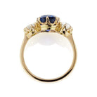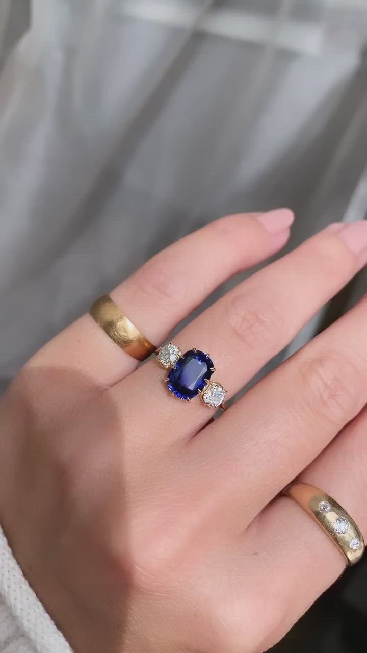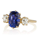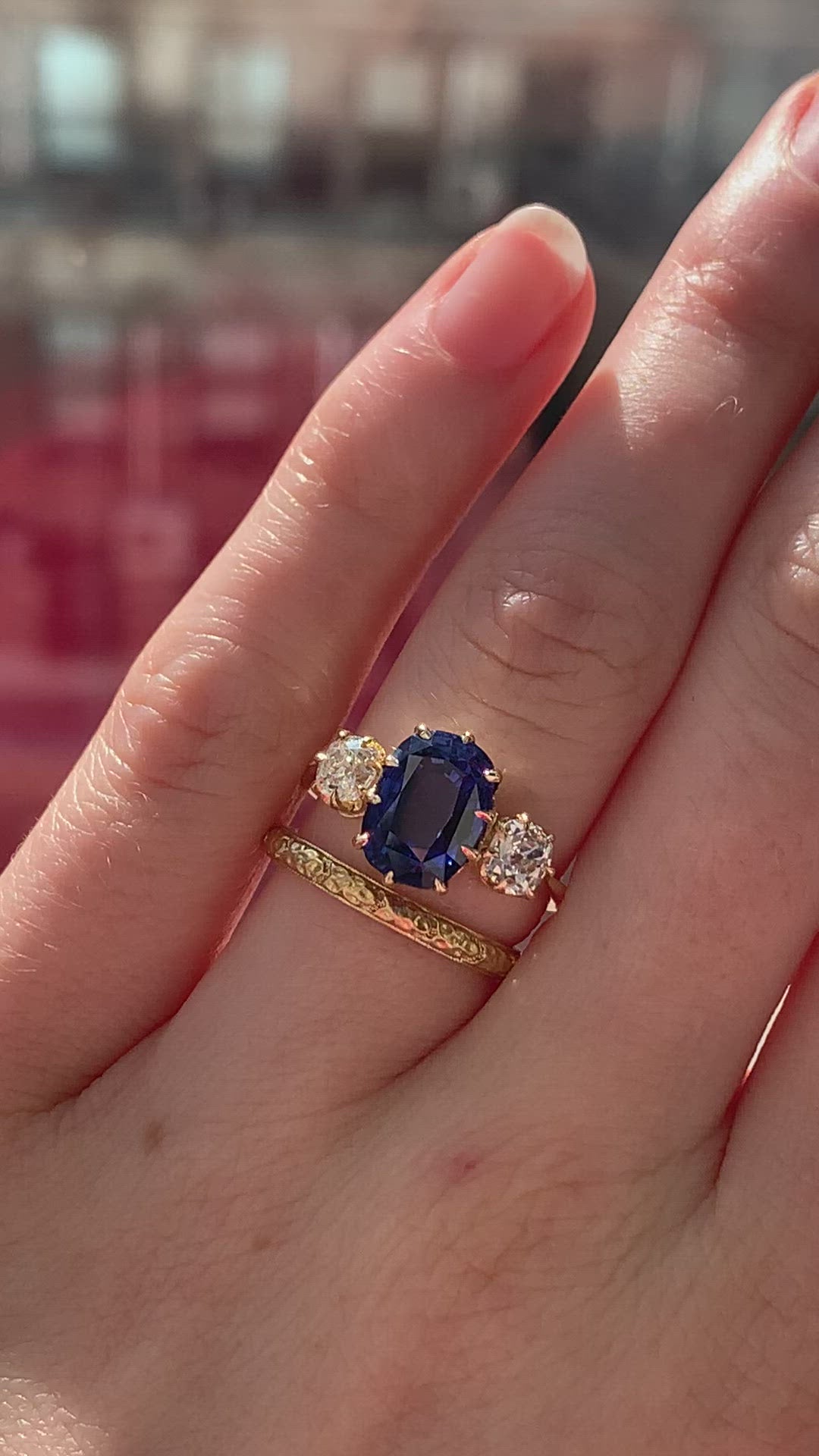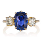 The Mallory 3.59 ring is a VB original design using authentically antique diamonds. The ring centers an AGL certified 3.59-carat no-heat Ceylon Natural Sapphire. To each side is an old mine cut diamond of approximately J-K color, VS-SI clarity. The stones combine for 0.77 carats. The stones are set in an 18 karat yellow gold setting. The ring is currently size 5.5 and can be resized!