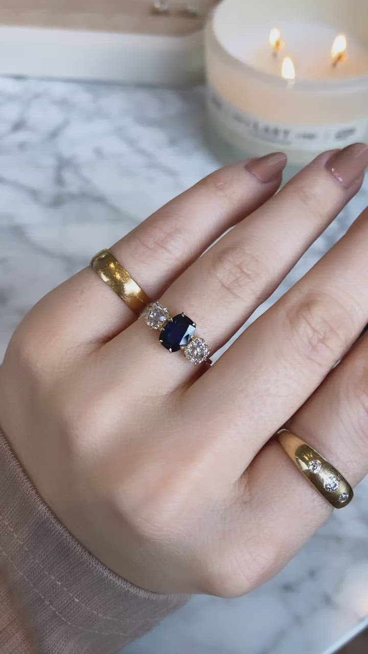 The Mallory 1.74 ring is a VB original made right here in NYC. The ring centers a GIA certified 1.74-carat old cushion cut heated Natural Sapphire. The stone is set in an 18-karat yellow gold setting with an old mine cut diamond to each side, both combining for 1.19 carats. The side stones are approximately J-K in color, VS-SI in clarity. The ring is currently size 6 and can be resized!