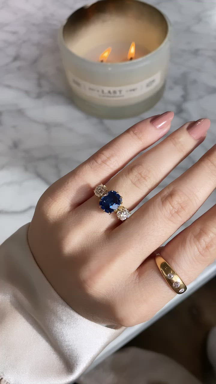 The Mallory 4.17 ring is a VB original design made right here in NYC. The ring centers a C. Dunaigre Certified 4.17-carat cushion cut no-heat Ceylon Sapphire. To one side of the sapphire is a GIA certified 1.10ct old mine cut diamond of J color, SI1 clarity. To the other side is a GIA certified 1.16ct old mine cut diamond of J color, SI1 clarity. The stones are set in an 18 karat yellow gold setting. The ring is currently size 5.75 and can be resized!