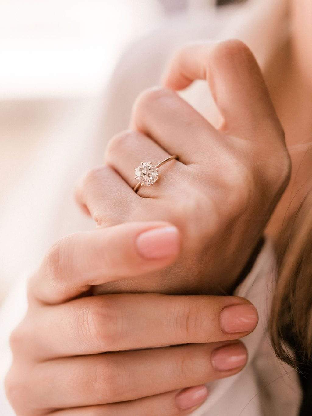 The band tapers toward the diamond and all the linear action is flowing up to draw your gaze to the delicious old mine cut! A slightly elongated shape for a very elegant feel!