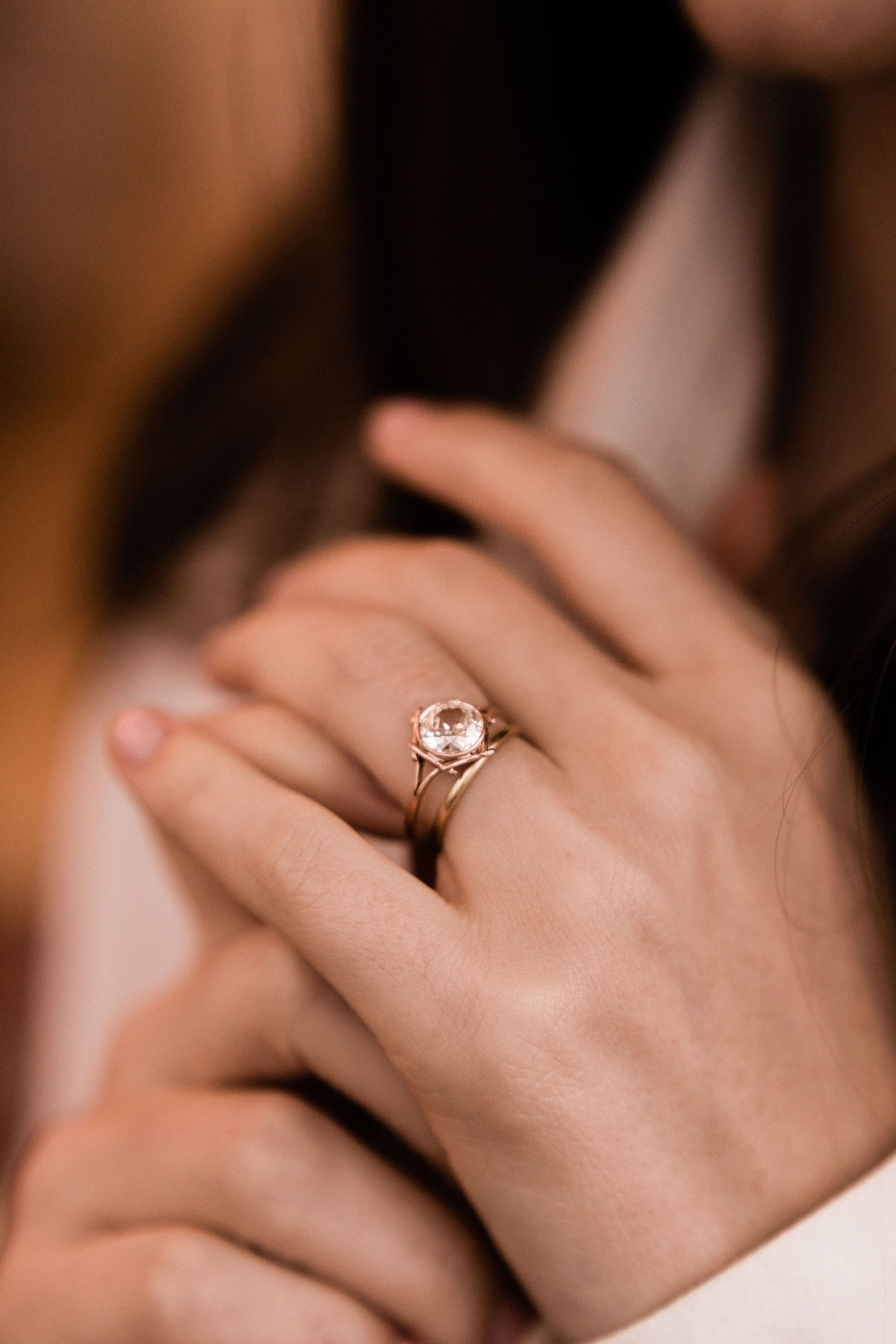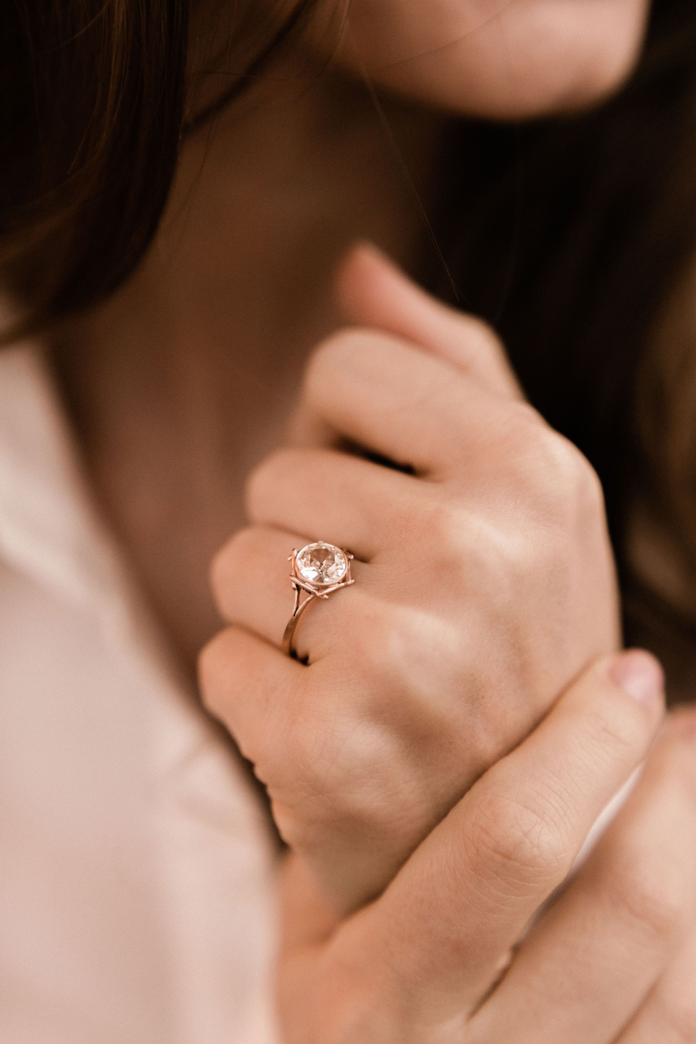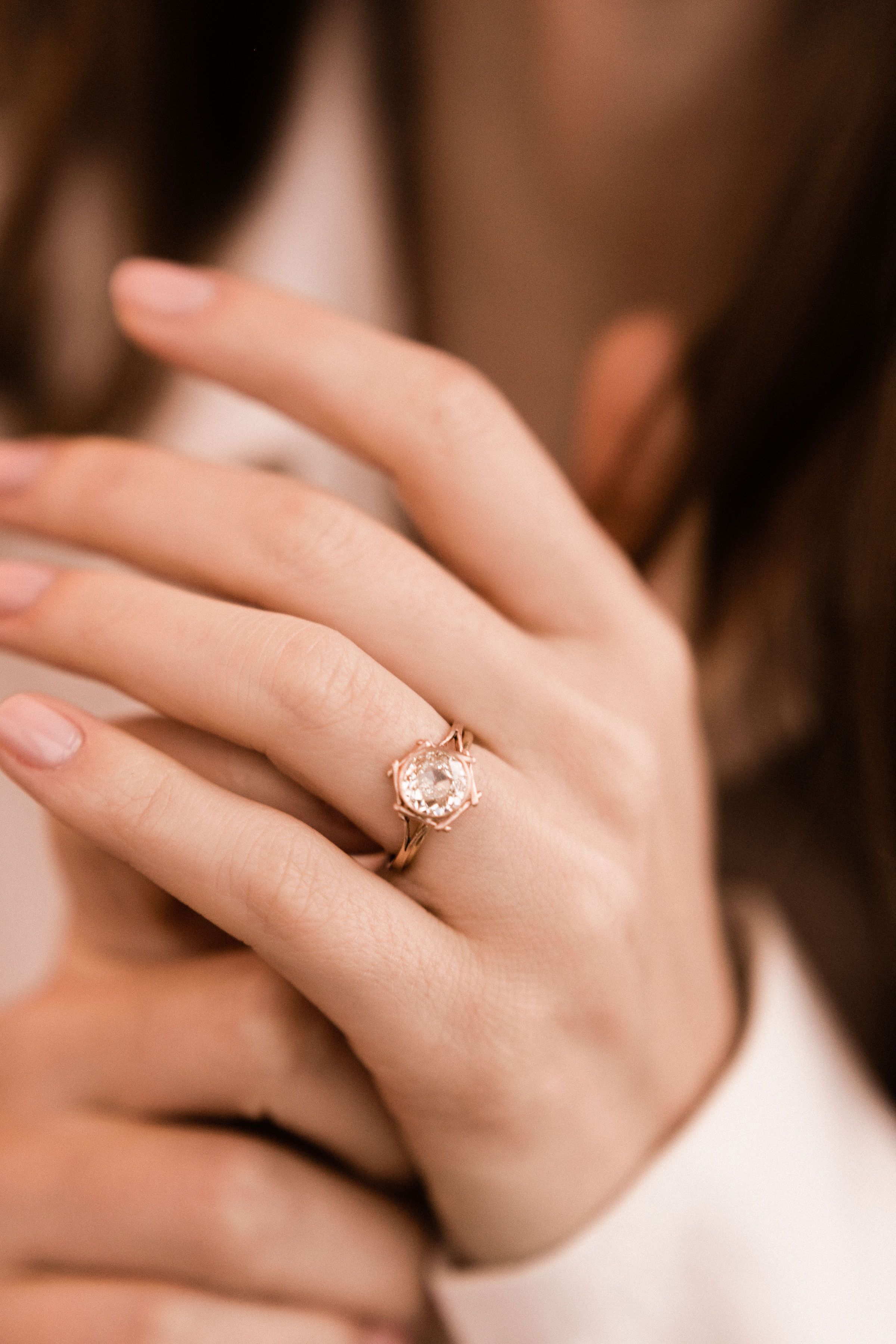 The Philippa ring is an Art Deco era engagement ring circa 1930! This rose gold split shank halo engagement ring centers a 1.42 carat old mine cut diamond of approximately M-N color, VS2 clarity. The diamond is bezel-set in a 15kt rose gold setting with a unique halo and a split shank. The ring is currently size 7.75 and can be resized!