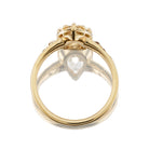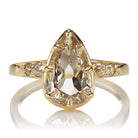 Named for our founder's stunning engagement ring and love of antique champagne pear diamonds, the Andria ring is a unique beauty that combines many of our favorite jewelry elements into one piece. A stunning light brown diamond with subtle peachy hues floats on the finger in a golden vented collet-setting, allowing light to pass under and through the diamond. The beautifully color-matched side stones add even more twinkle to this marvelous piece.
