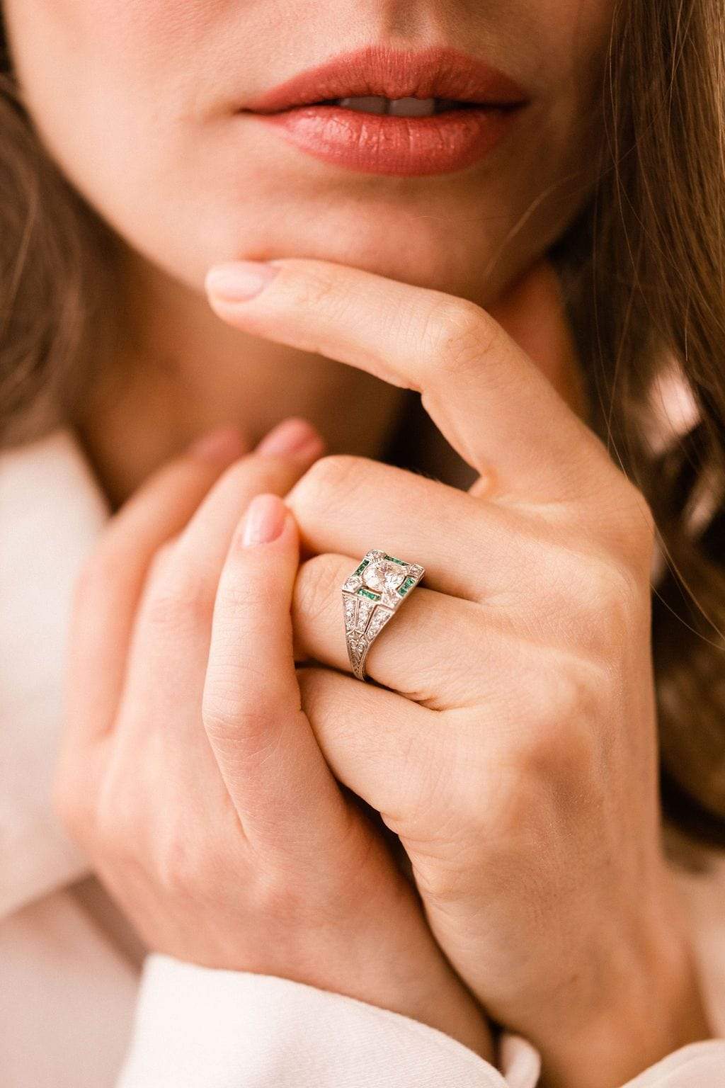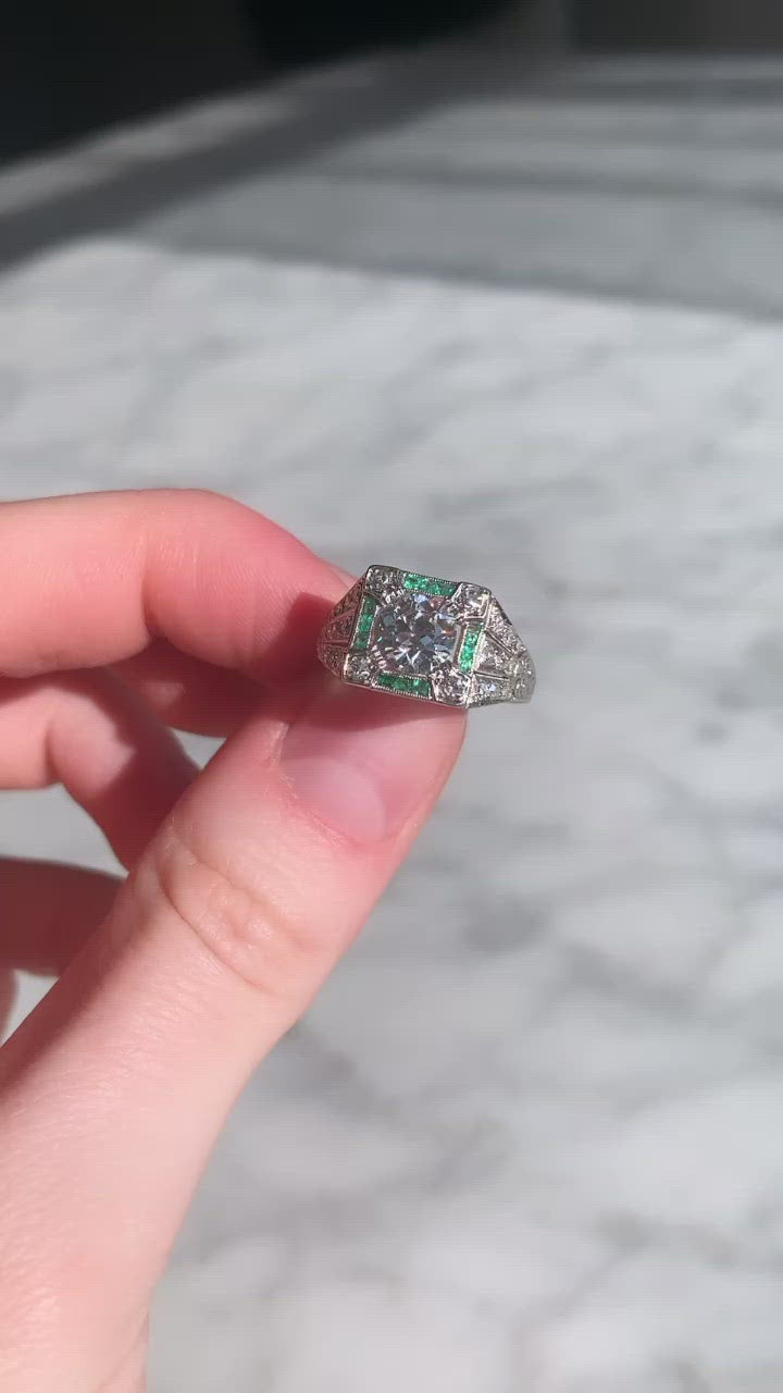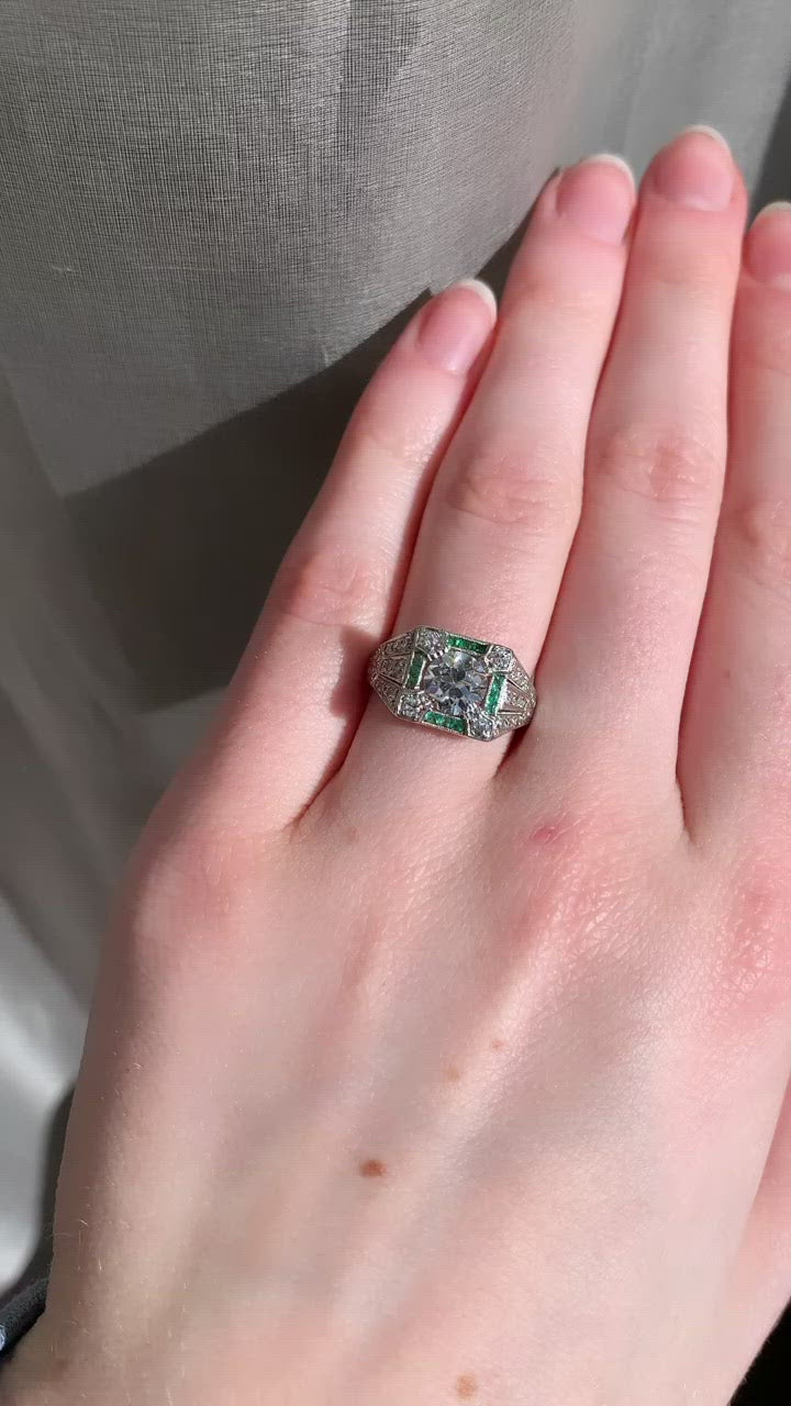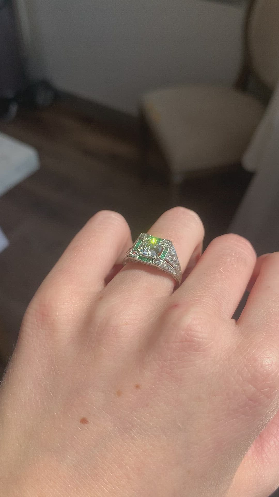 An exquisite and very Deco piece seen through the linear themes and incredible craftsmanship! The diamond is bight and incredibly lively! The pop of the emeralds adds a definite uniqueness to this dream of authentic vintage!