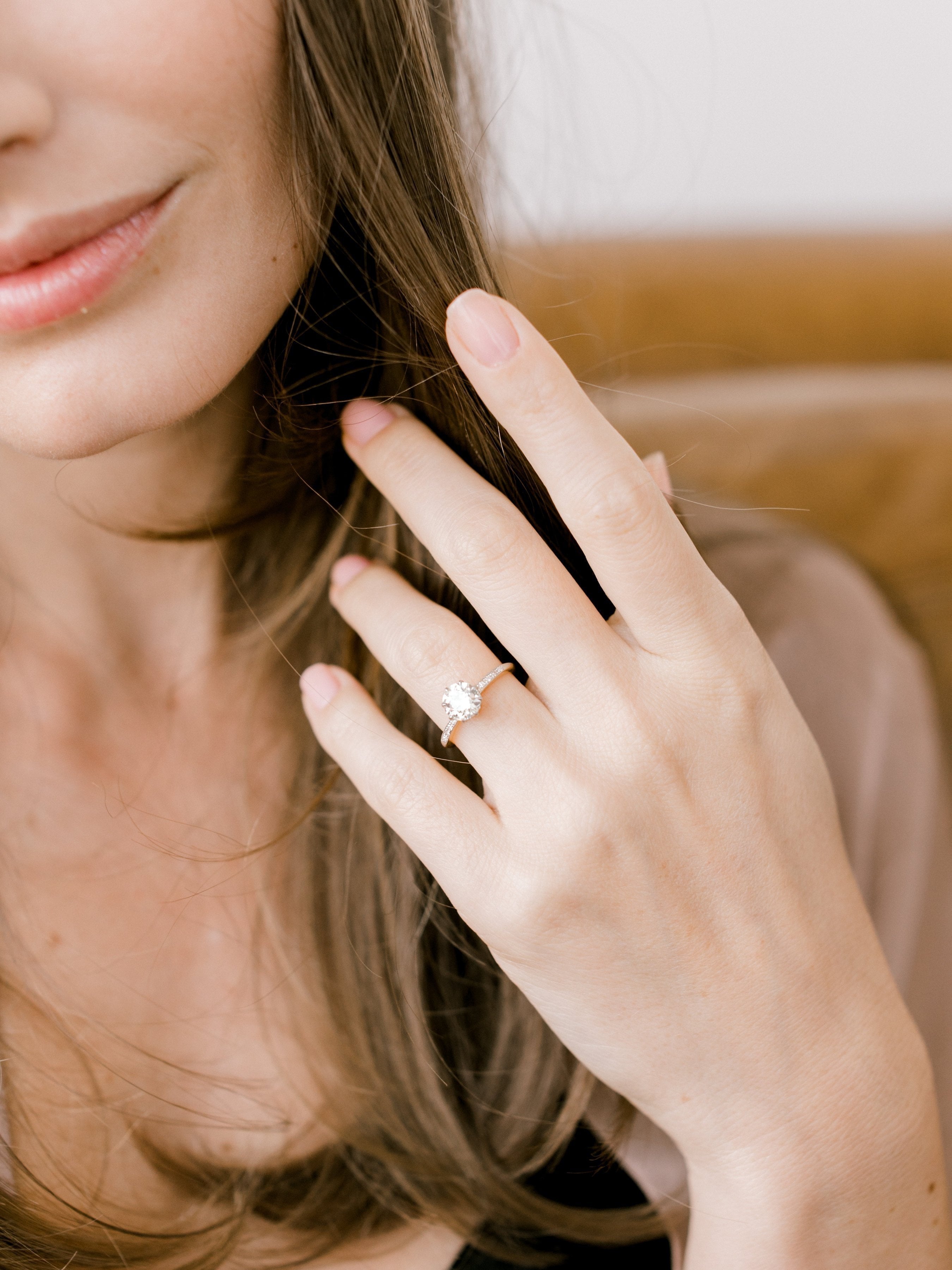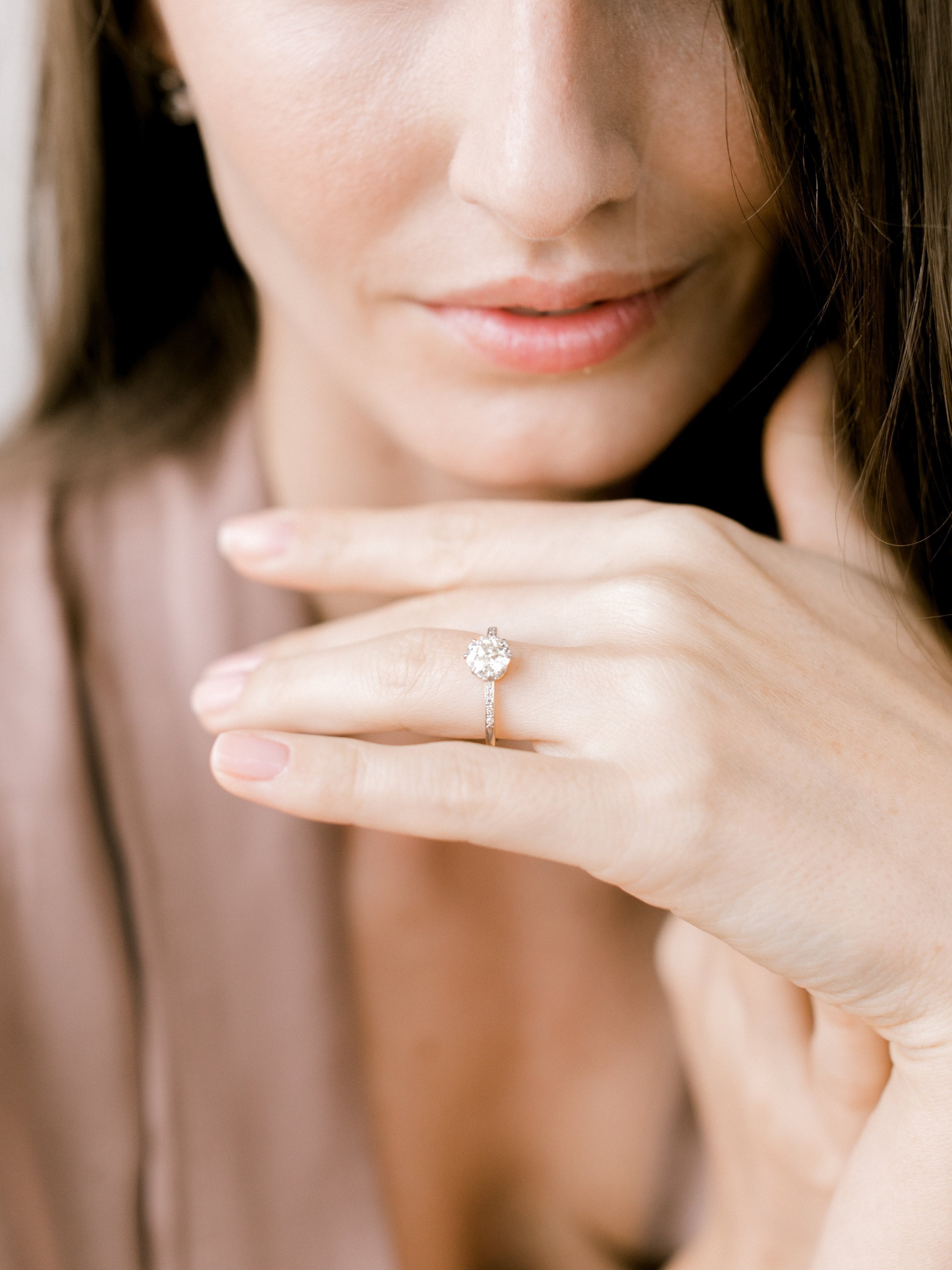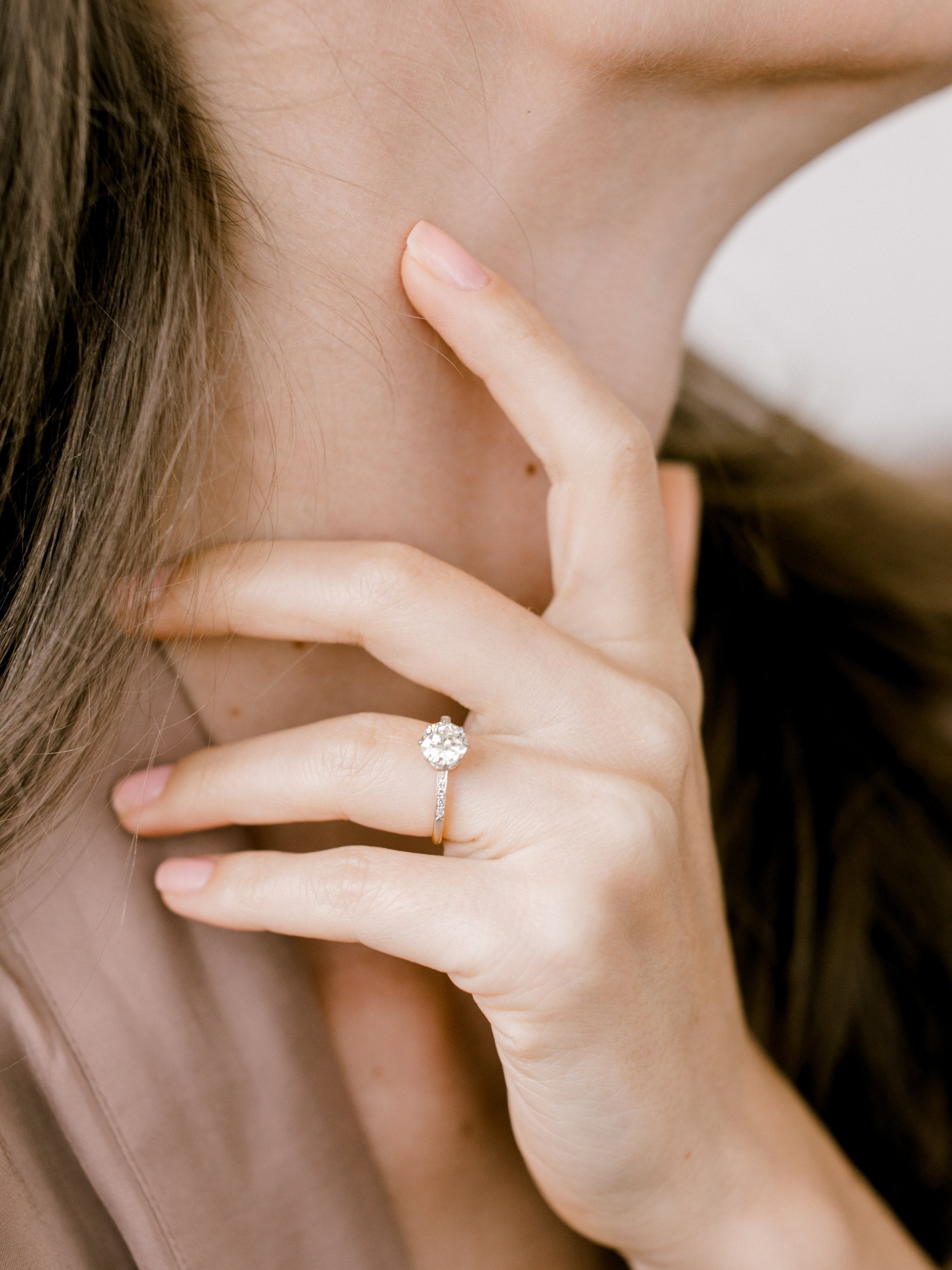 Super delicate and super glam with European origins! The band is nice and thin with extra jazz from the shoulder diamond and platinum on the yellow gold. This ring stacks well with most bands!