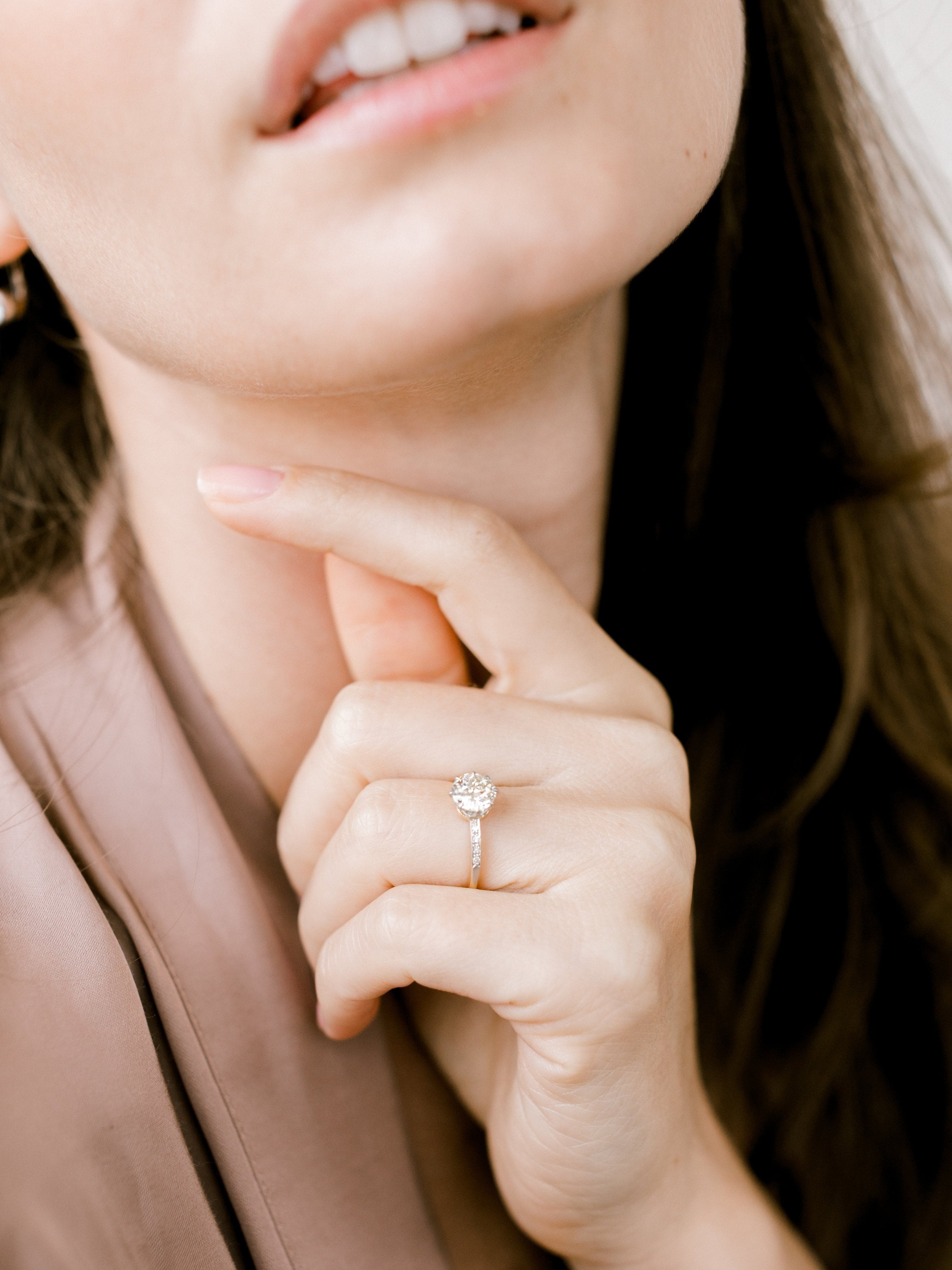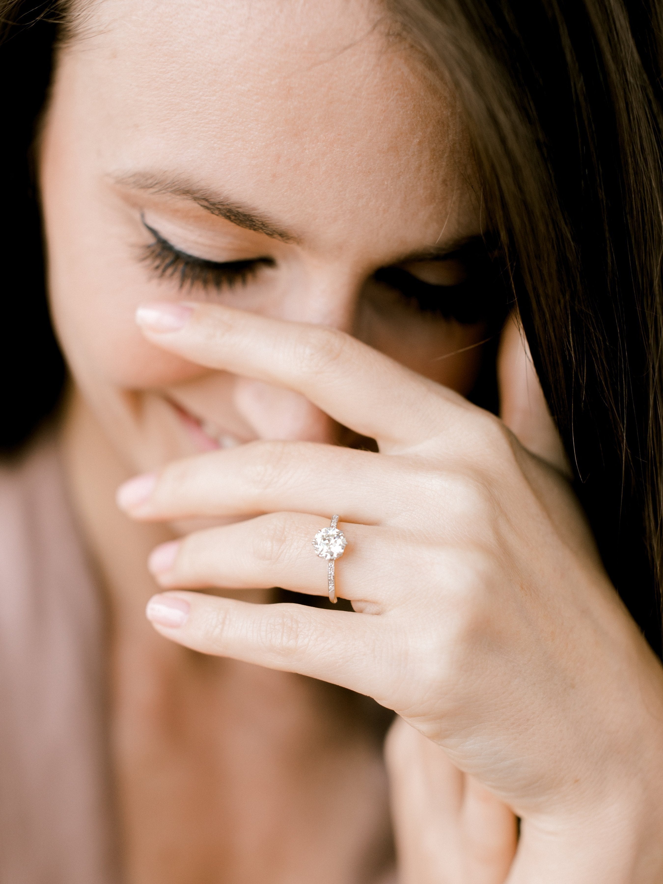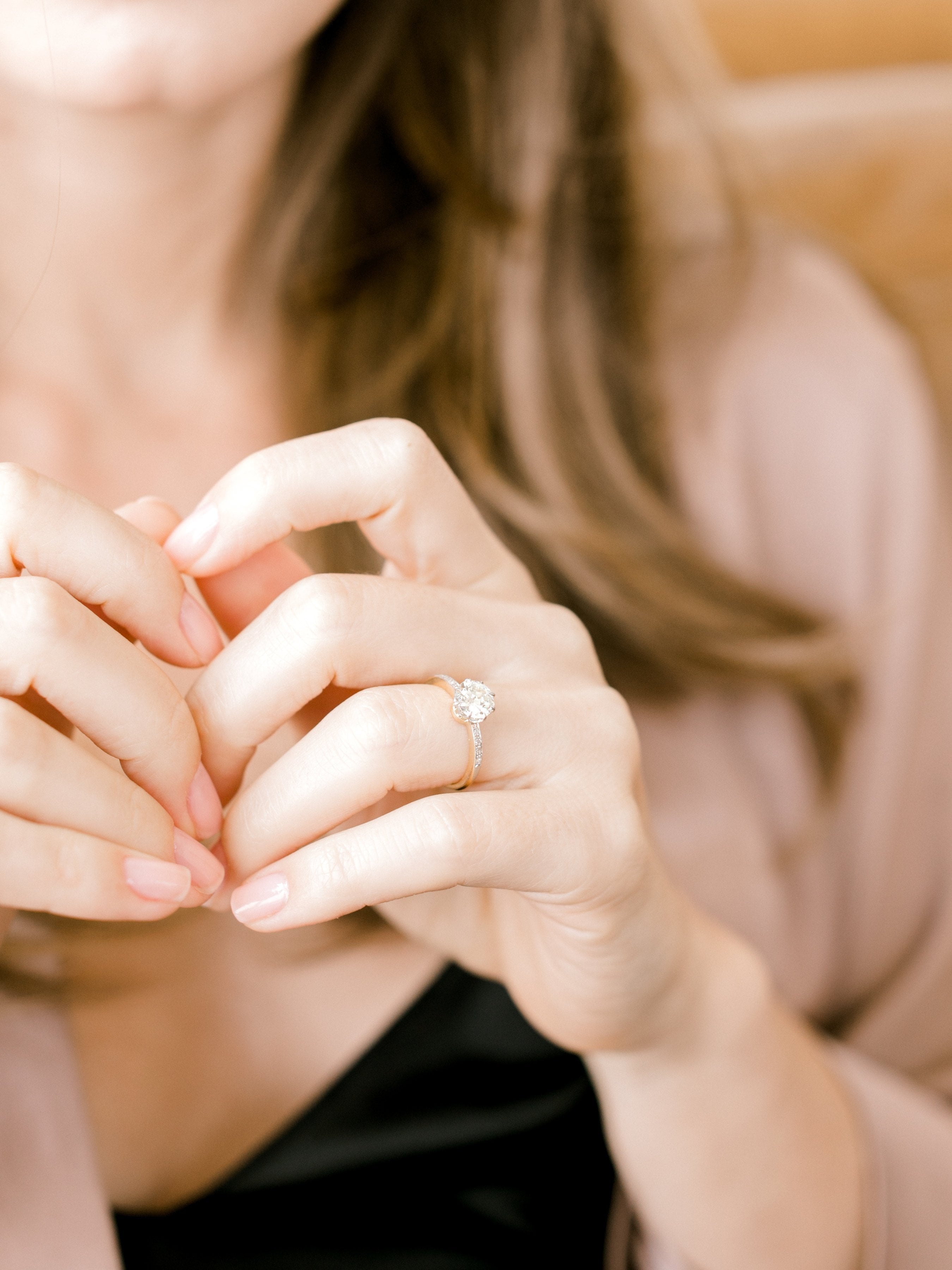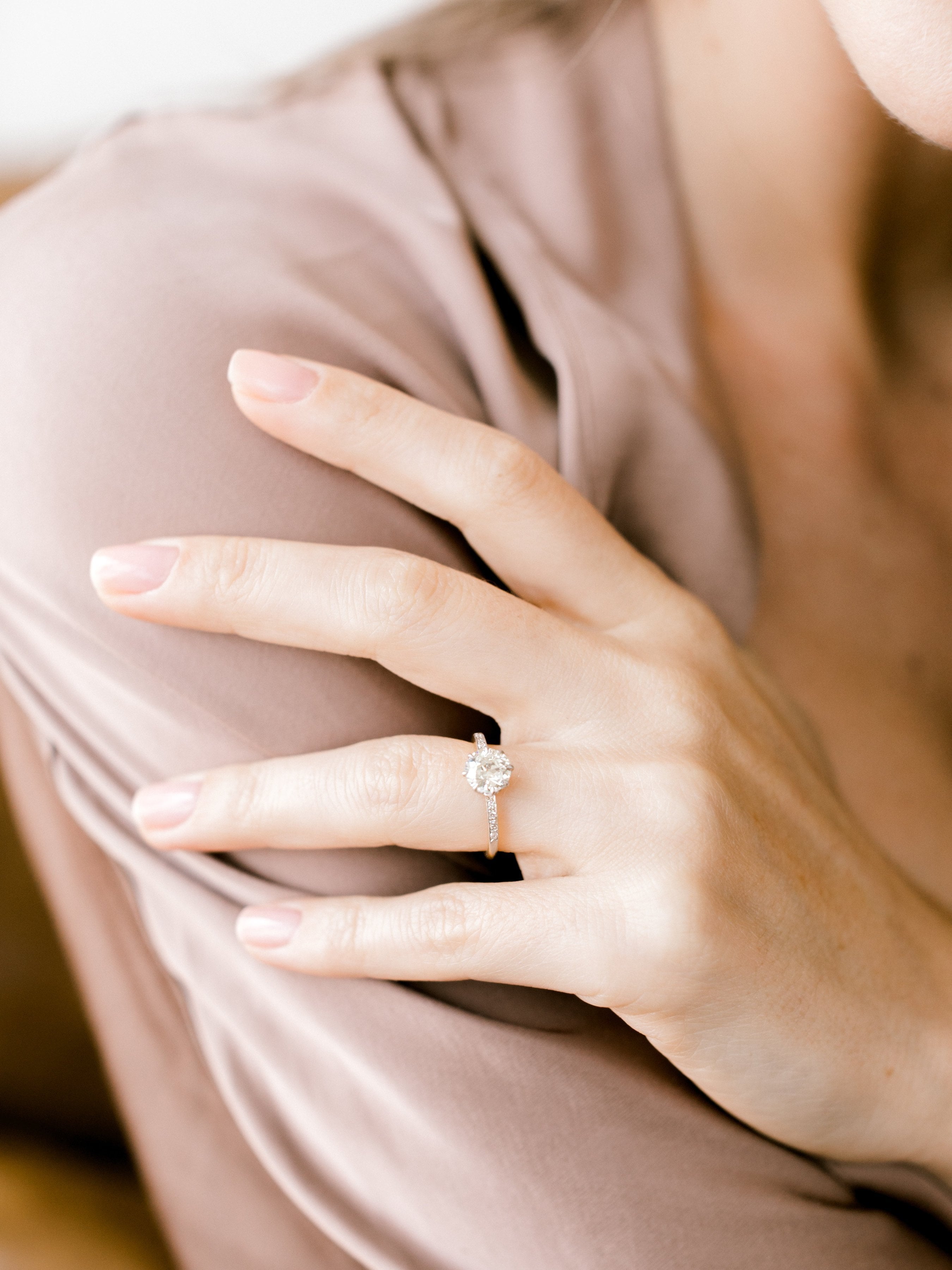 Super delicate and super glam with European origins! The band is nice and thin with extra jazz from the shoulder diamond and platinum on the yellow gold. This ring stacks well with most bands!