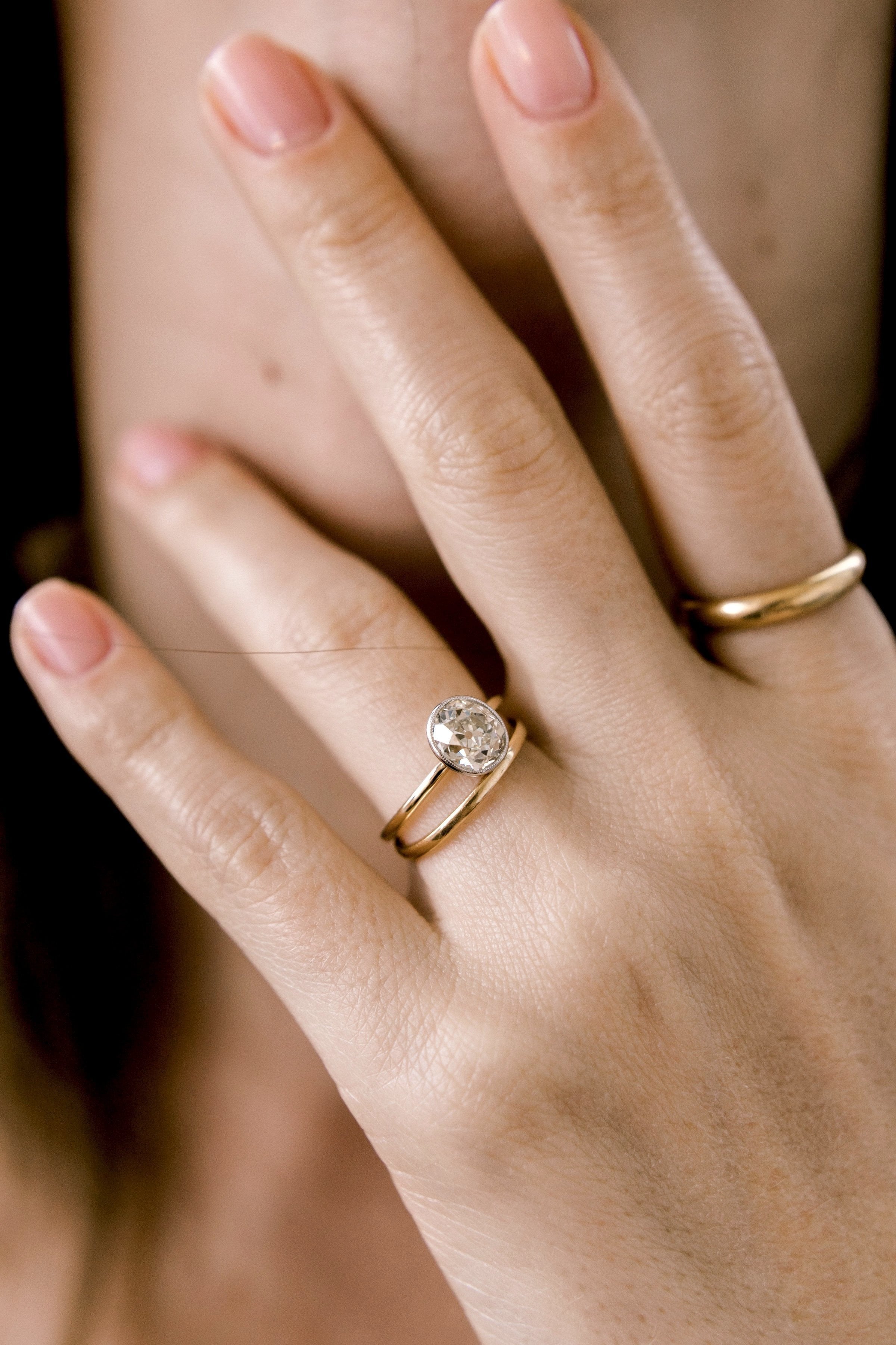 The Perla 1.79 ring is a VB-made Vintage Inspired Engagement Ring! This stackable diamond engagement ring centers a GIA Certified 1.79 carat old mine cut diamond of M color, SI1 clarity. The diamond is bezel-set in a platinum-topped 18kt yellow gold setting and lined with millegrain details. The ring is size 6 and can be resized!