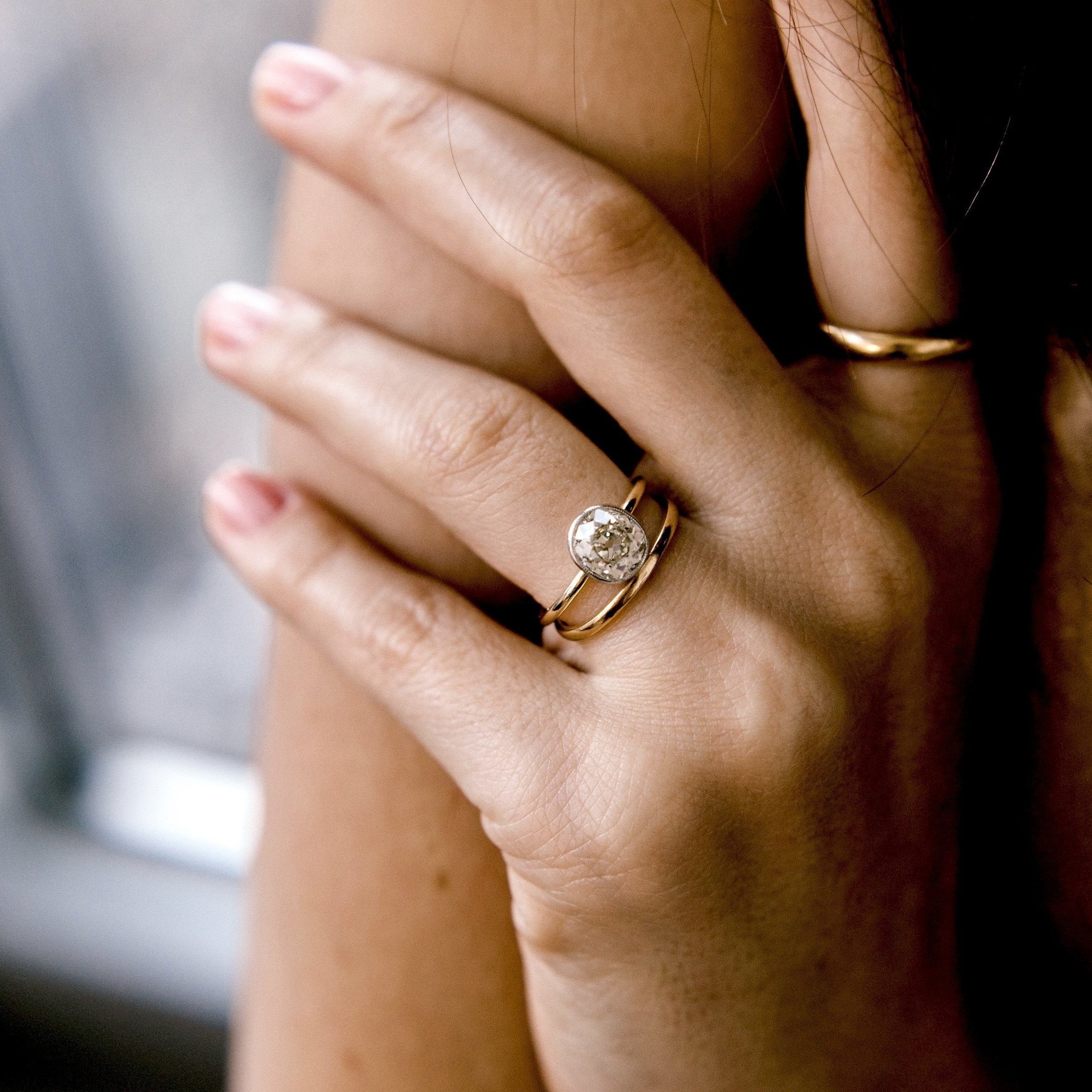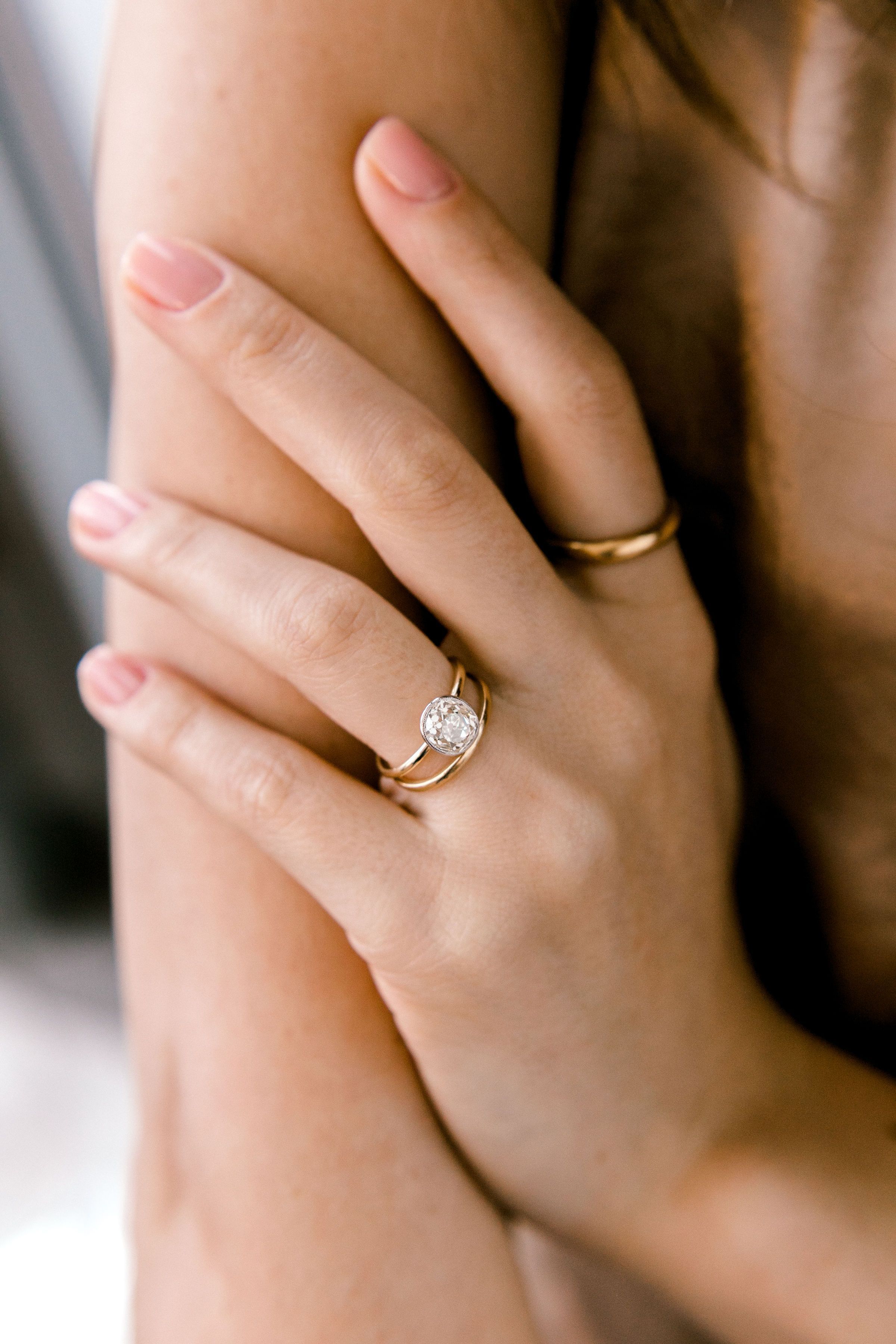 A clean and classic style with a gorgeous antique diamond! The setting is designed to stack well with bands and you can easily mix and match metals!