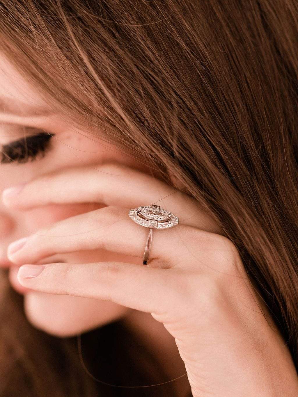 A very glamorous piece! Gorgeous, vibrant diamonds of beautiful shapes create a piece that is very unique and very timeless. Designed to be able to slide a thin band underneath to make band pairing a cinch!