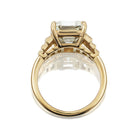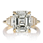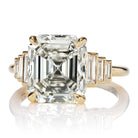 This big, beautiful Emerald cut is a step-cut lover's dream with Asscher-like faceting and a slightly elongated shape. The baguettes continue the geometric themes and create a beautiful flow down the finger.