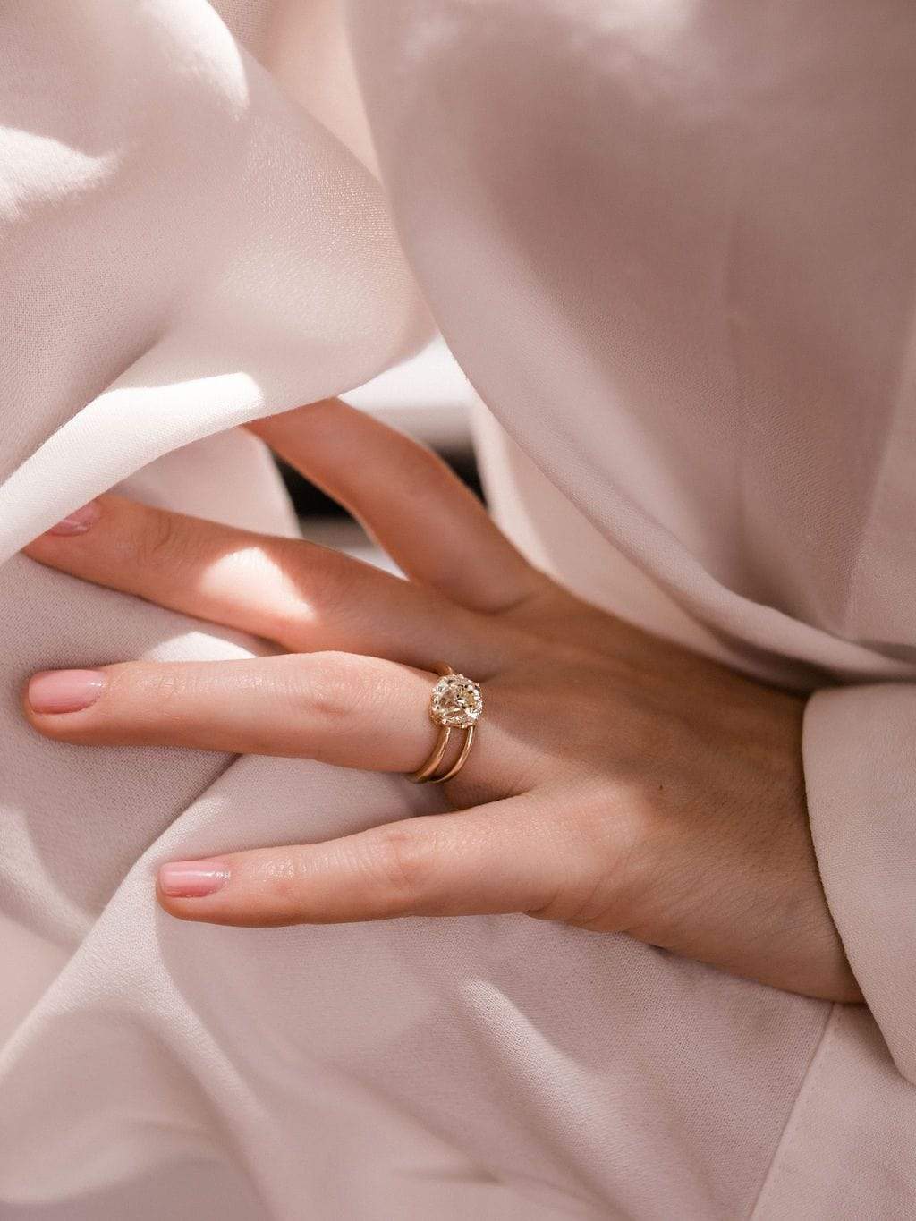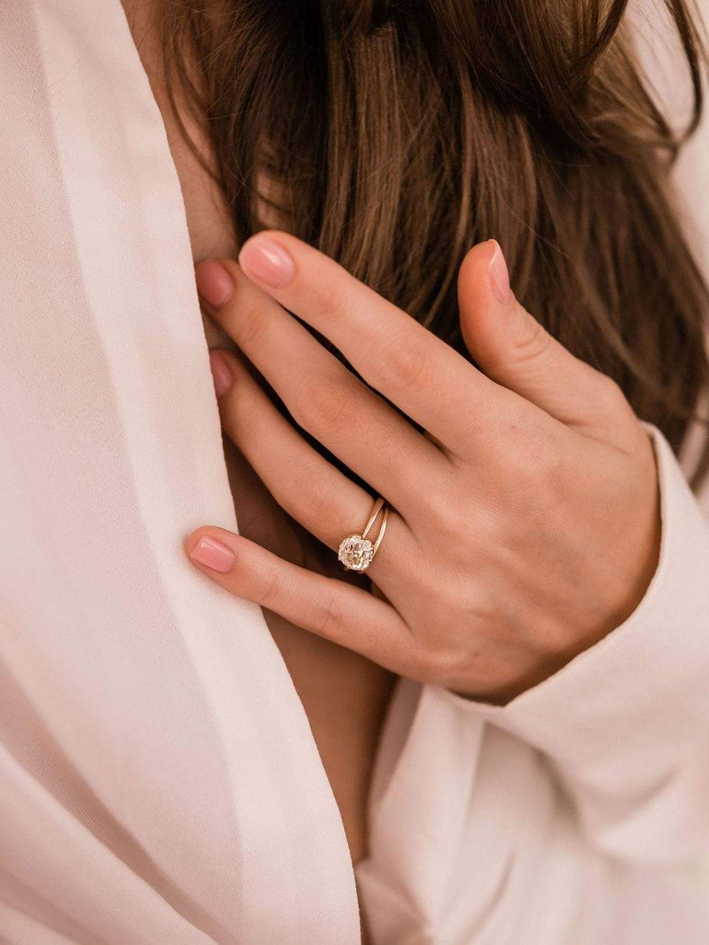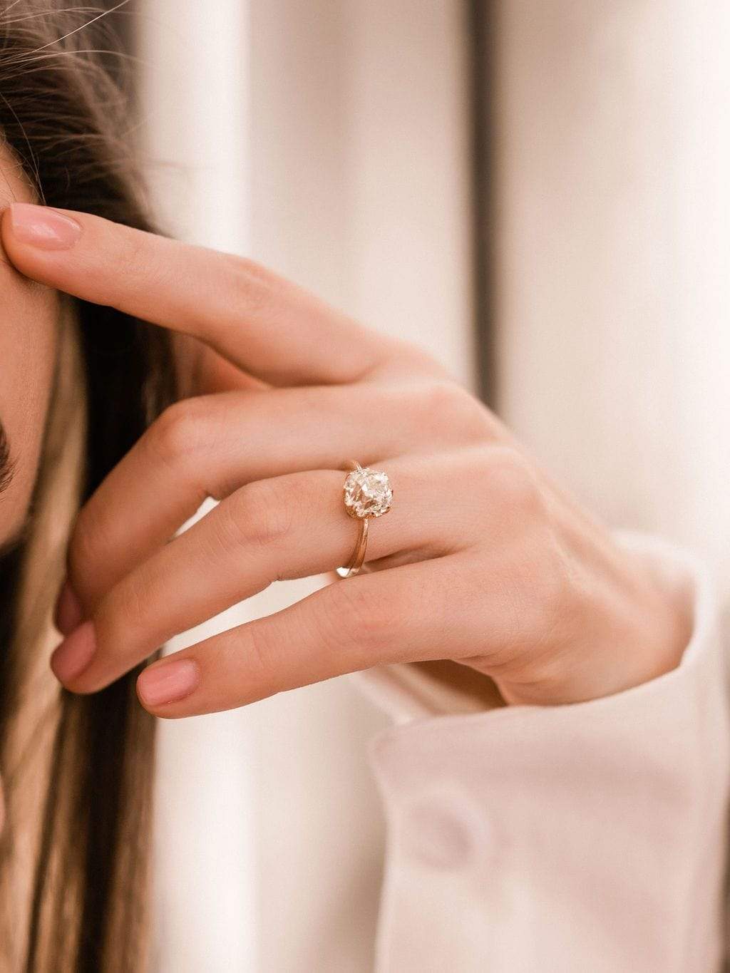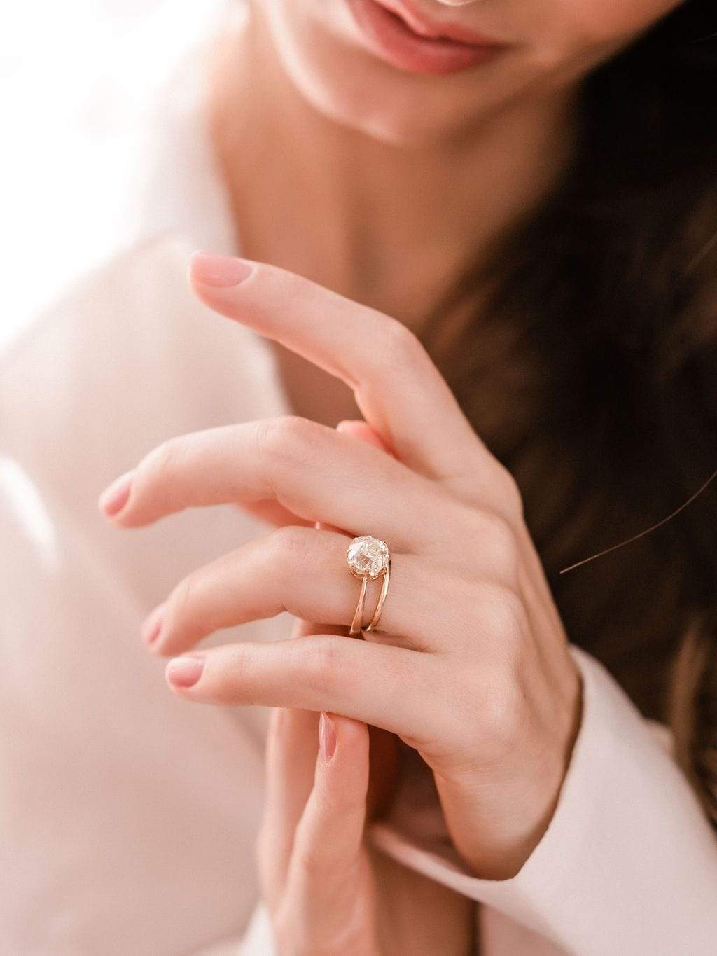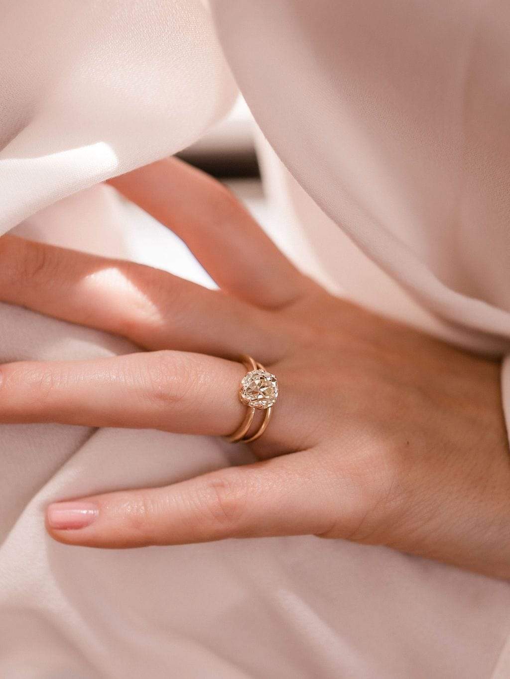 All about that super chunky old mine cut diamond! This more dramatic tapered setting keeps your eye on that beautiful stone.