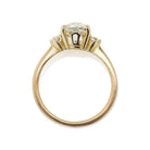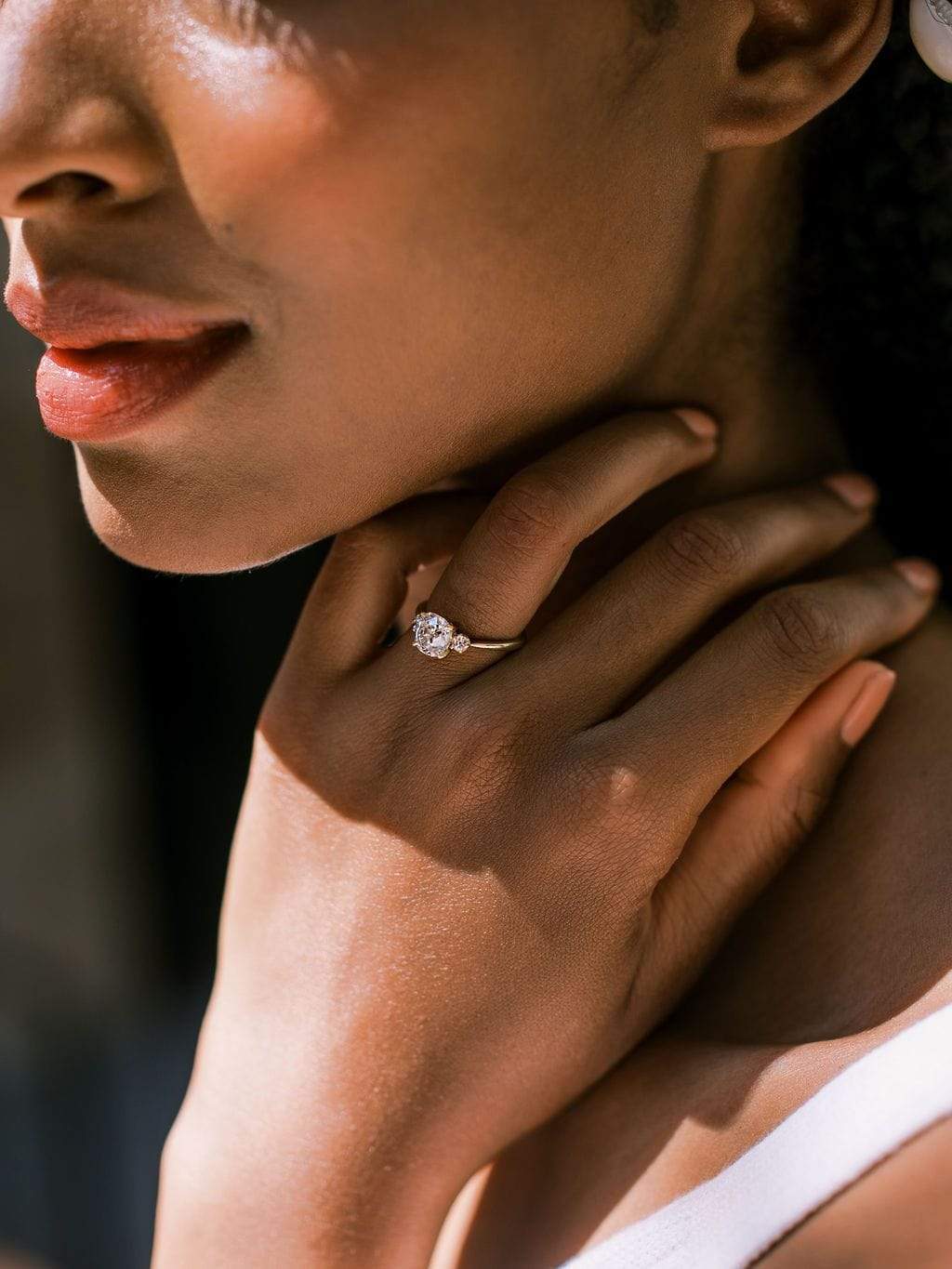 We love this style for that three-stone look but it's all about the center stone. The side stones are dainty, but still adding extra glimmer, allowing the gorgeous center stone to take center stage.