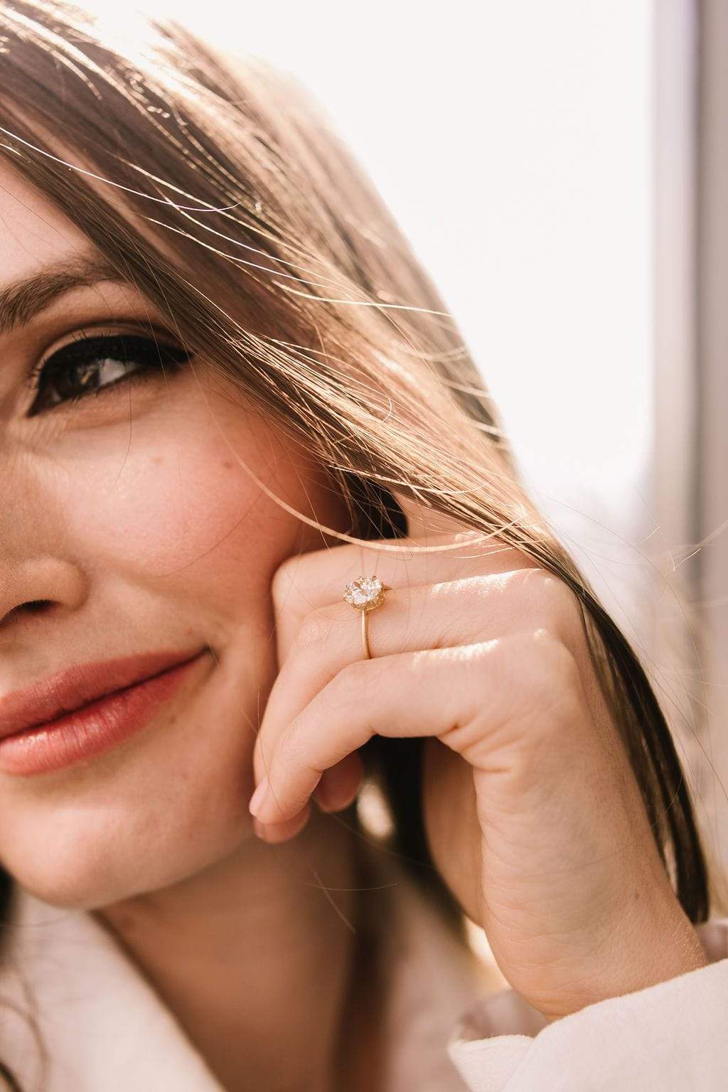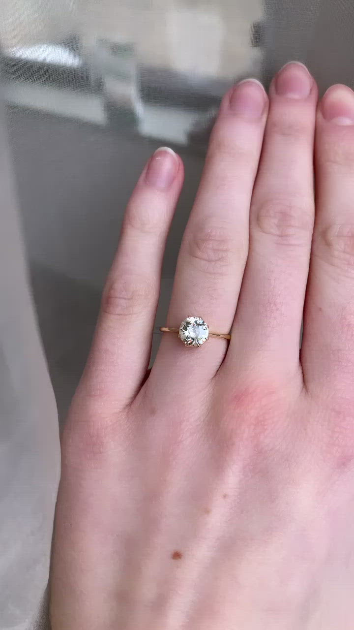The Bella 0.93 ring is a VB made engagement ring with an authentically antique diamond! This Tapered Solitaire Engagement Ring centers a 0.93 carat old European cut diamond of approximately M-N color, SI2 clarity. The diamond is set in an 8-prong 18kt yellow gold setting with a delicately tapered shank. The ring is currently size 5 and can be resized!