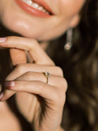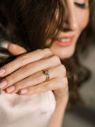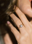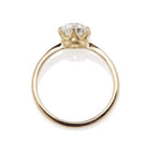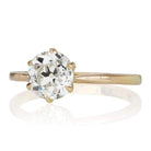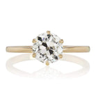 The Bea 1.37 ring is a vintage-inspired tapered solitaire engagement ring. The ring centers a GIA Certified 1.37-carat old European cut diamond of J color, VS2 clarity. The diamond is set in a 6 prong 18 karat yellow gold setting with a slightly tapered shank. The ring is currently size 5.75 and can be resized!