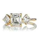 A fun and literal twist on a three stone ring with 3 stunning Asscher cut diamonds. The unique orientation of the side stones adds a touch of whimsy and distinctiveness.
