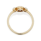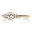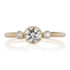 The Rumi Ring is a three stone bezel set engagement ring from the Edwardian Era, circa 1915! This three stone ring centers a GIA Certified 0.53 carat old European cut diamond of H color, VS1 clarity. The diamond is bezel-set in a 14kt yellow gold ring. To each side is a platinum-topped bezel-set old European cut diamond, each approximately 0.04 carats. The band is a thin yellow gold. The ring is size 6.5 and can be resized!